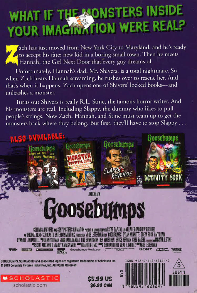 * With exclusive introduction from the REAL R. L. Stine! Plus eight pages of color pictures from the movie. *Zach, 16, has just moved from NYC to a creepy small town. He soon realizes his new neighbor, Hannah (also 16), is in danger. When he tries to rescue her, he accidentally unleashes the monsters created and brought to life by her writer father, R.L. Stine. Now it's up to Zach, Hannah, and Stine to get the monsters back in their books where they belong. Can they stop the monsters... for good?