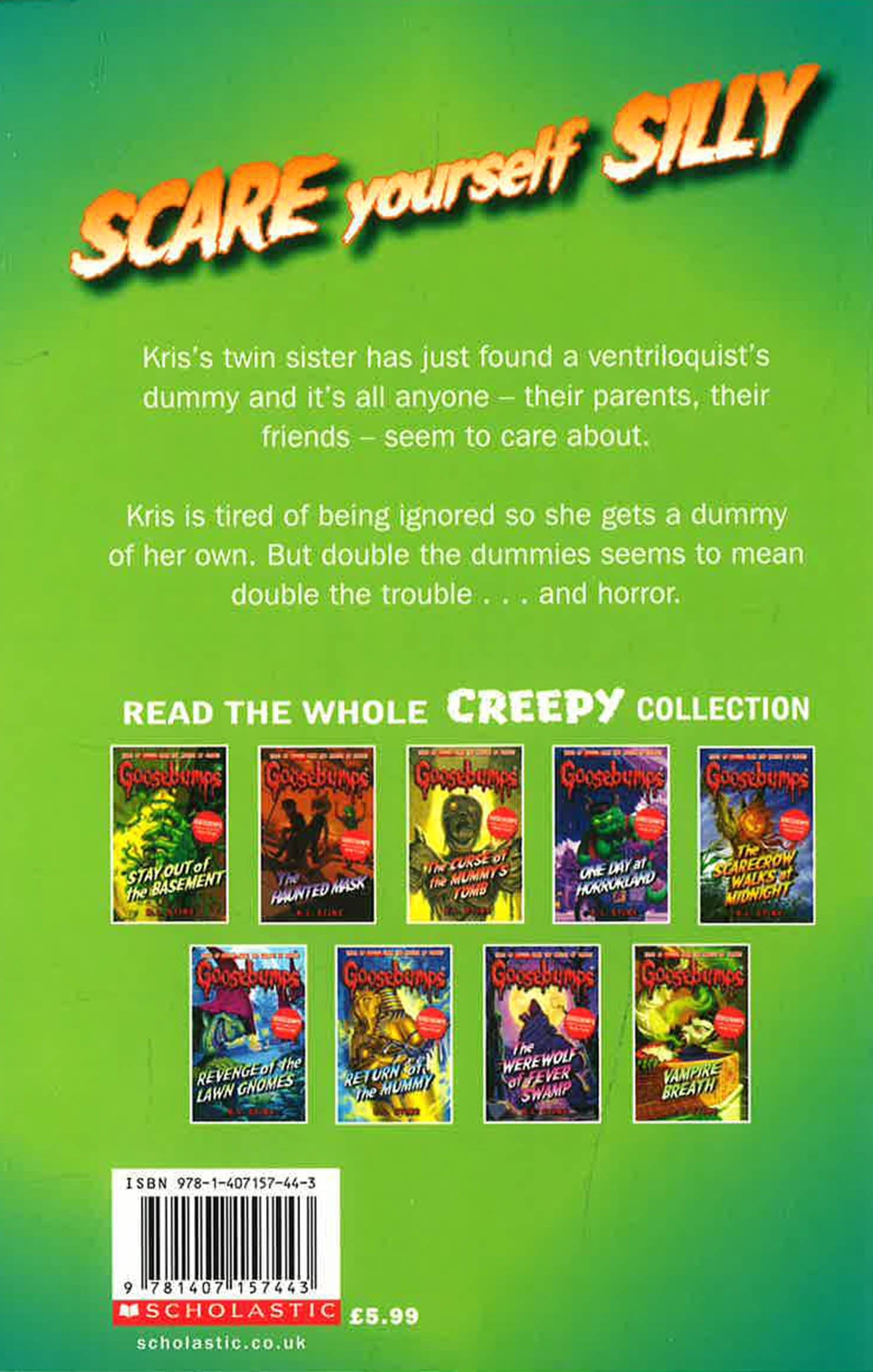 They're baa-ack! Make way for the bestselling children's series of all time! With a fresh new look, GOOSEBUMPS is set to scare a whole new generation of kids. So reader beware--you're in for a scare!Kris's twin sister has just gotten a ventriloquist's dummy and it's all anyone - their parents, their friends - seem to care about. Kris is tired of being ignored so she gets a dummy of her own. But double the dummies start to mean double the trouble...and horror.