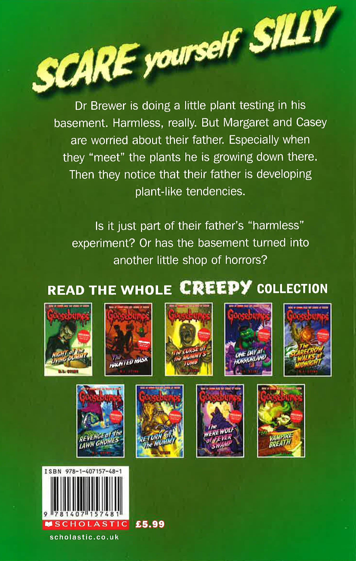 They're baa-ack! Make way for the bestselling children's series of all time! With a fresh new look, GOOSEBUMPS is set to scare a whole new generation of kids. So reader beware--you're in for a scare! Dr. Brewer is doing a little plant-testing in his basement. Nothing to worry about. Harmless, really. But Margaret and Casey Brewer are worried about their father. Especially when they...meet...some of the plants he is growing down there. Then they notice that their father is developing plantlike tendencies. In fact, he is becoming distinctly weedy-and seedy. Is it just part of their father's "harmless" experiment? Or has the basement turned into a garden of horrors?