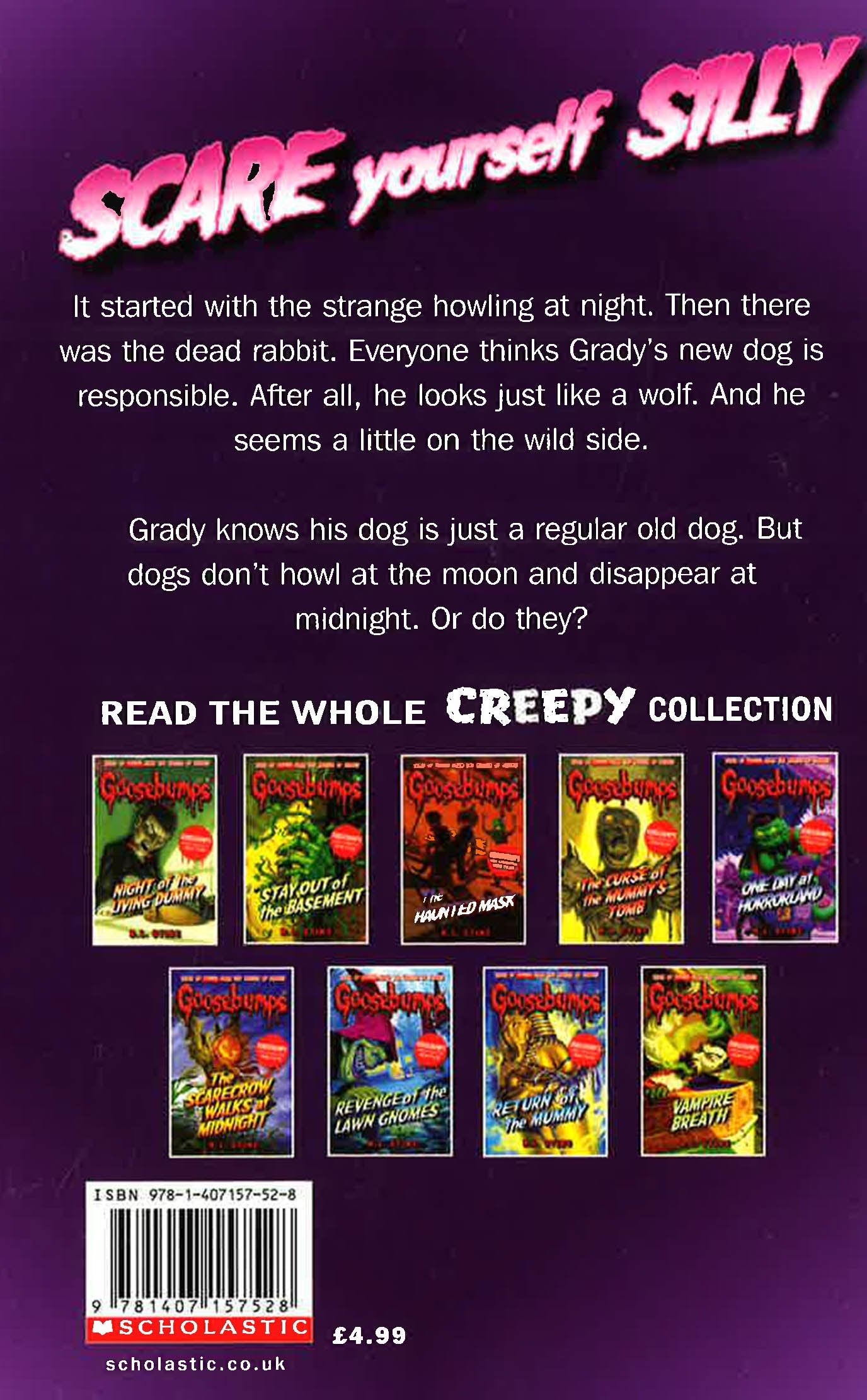 They're baa-ack! Make way for the bestselling children's series of all time! With a fresh new look, GOOSEBUMPS is set to scare a whole new generation of kids. So reader beware--you're in for a scare! There is something weird happening in Fever Swamp. Something really horrible. It started with the strange howling at night. Then there was the dead rabbit. Everyone thinks Grady's new dog is responsible. After all, he looks just like a wolf. And he seems a little on the wild side. But Grady knows his dog is just a regular old dog. And most dogs don't howl at the moon. Or disappear at midnight. Or change into terrifying creatures when the moon is full. Or do they?