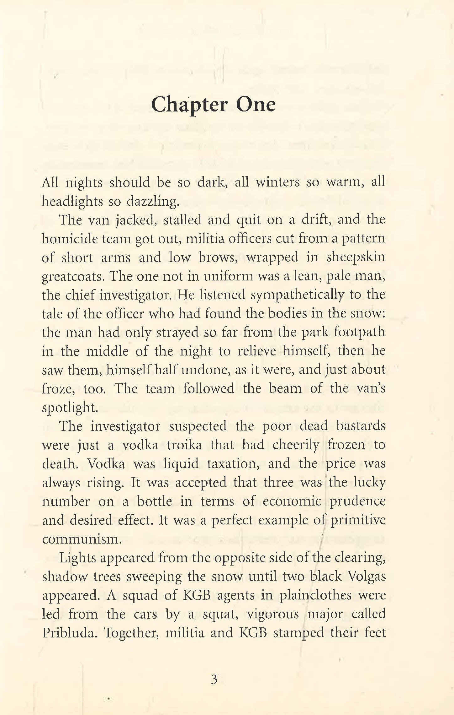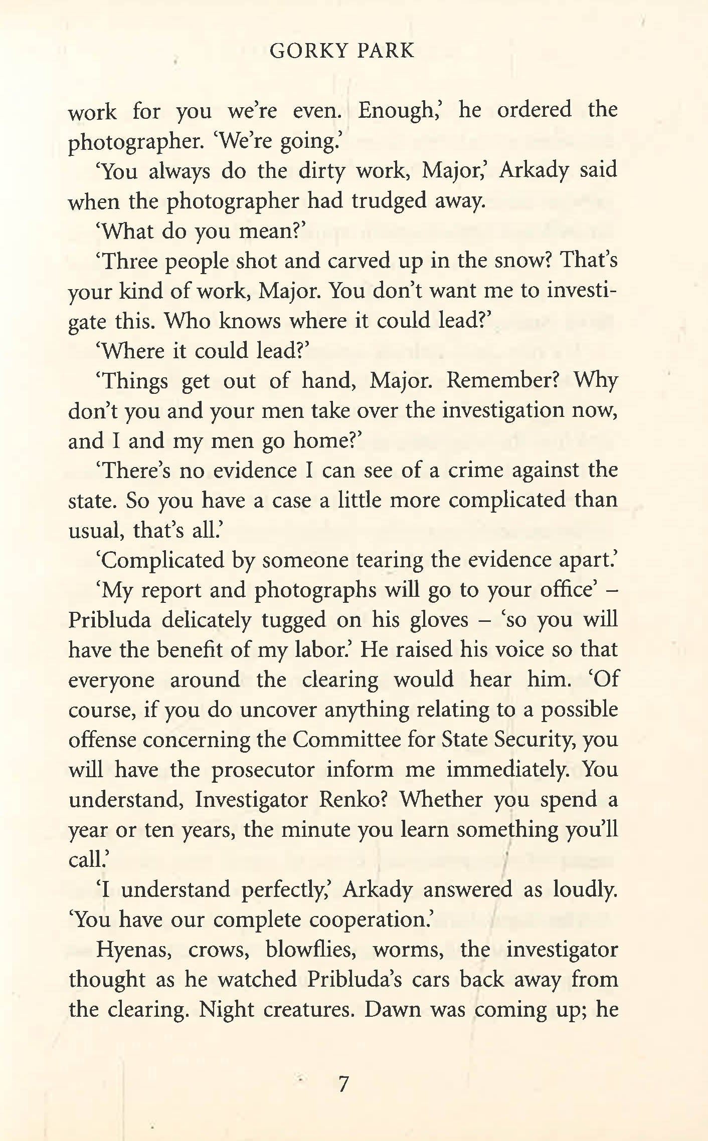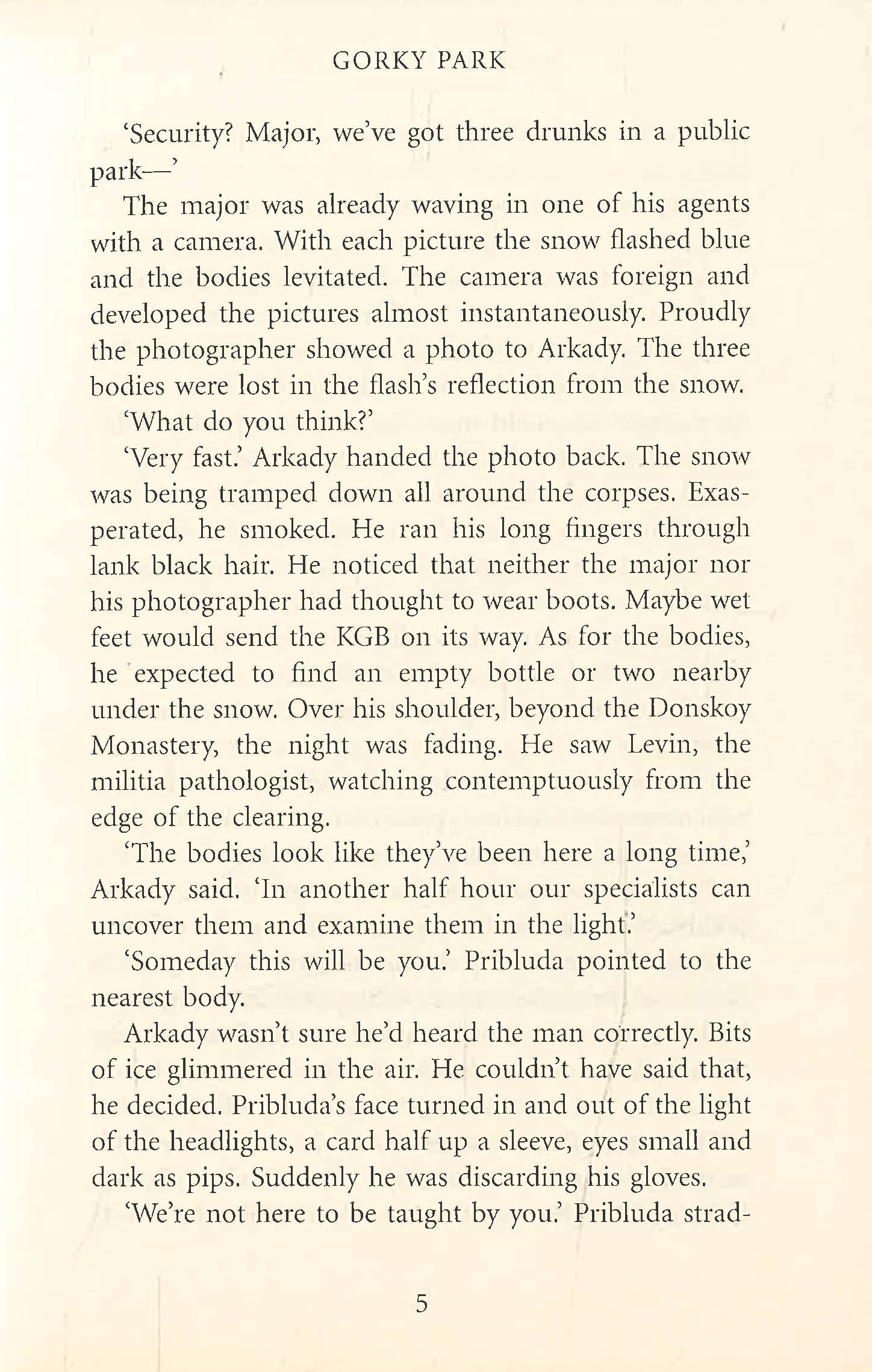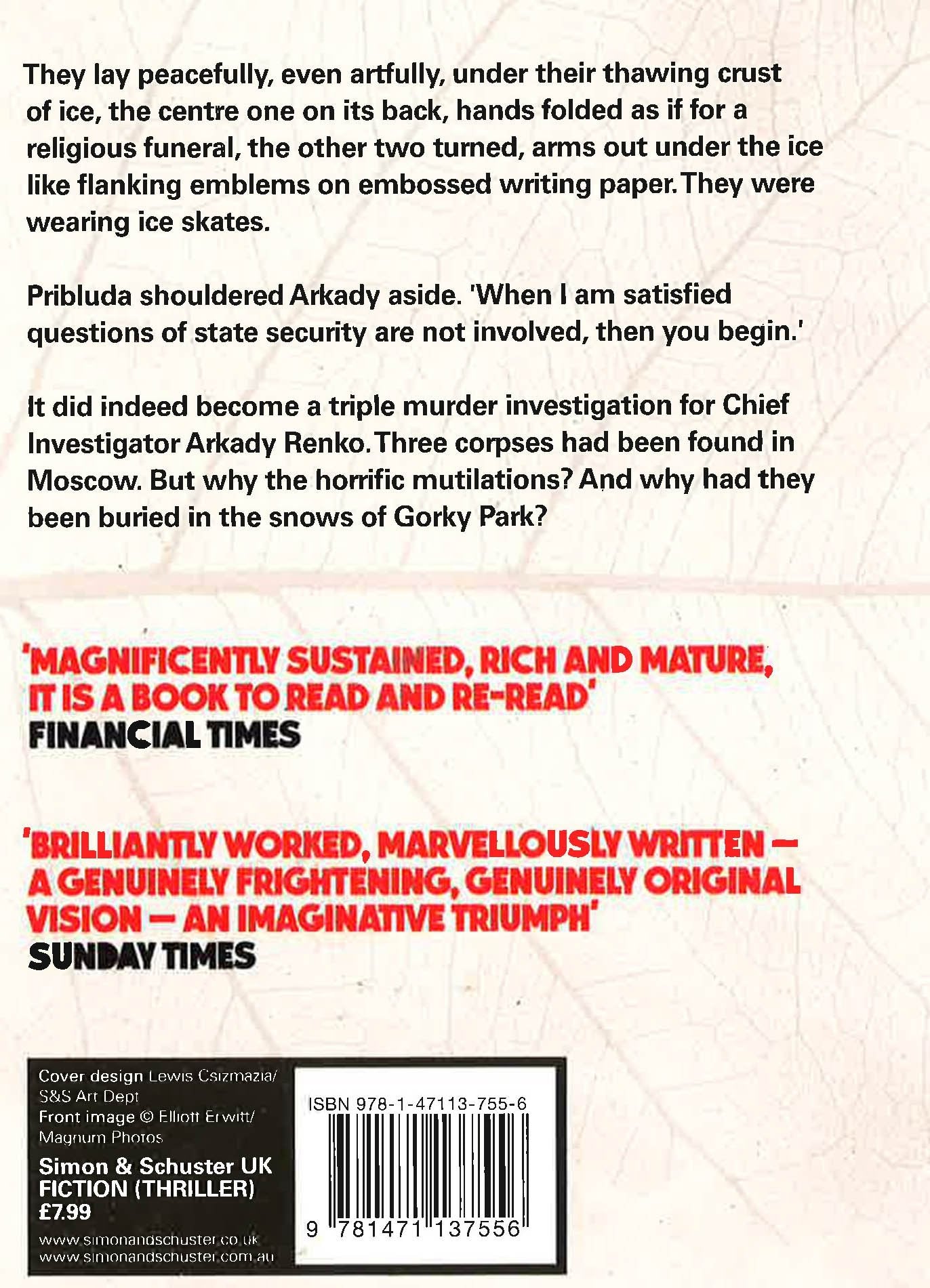 A triple murder in a Moscow amusement center: three corpses found frozen in the snow, faces and fingers missing. Chief homicide investigator Arkady Renko is brilliant, sensitive, honest, and cynical about everything except his profession. To identify the victims and uncover the truth, he must battle the KGB, FBI, and New York police as he performs the impossible--and tries to stay alive doing it.