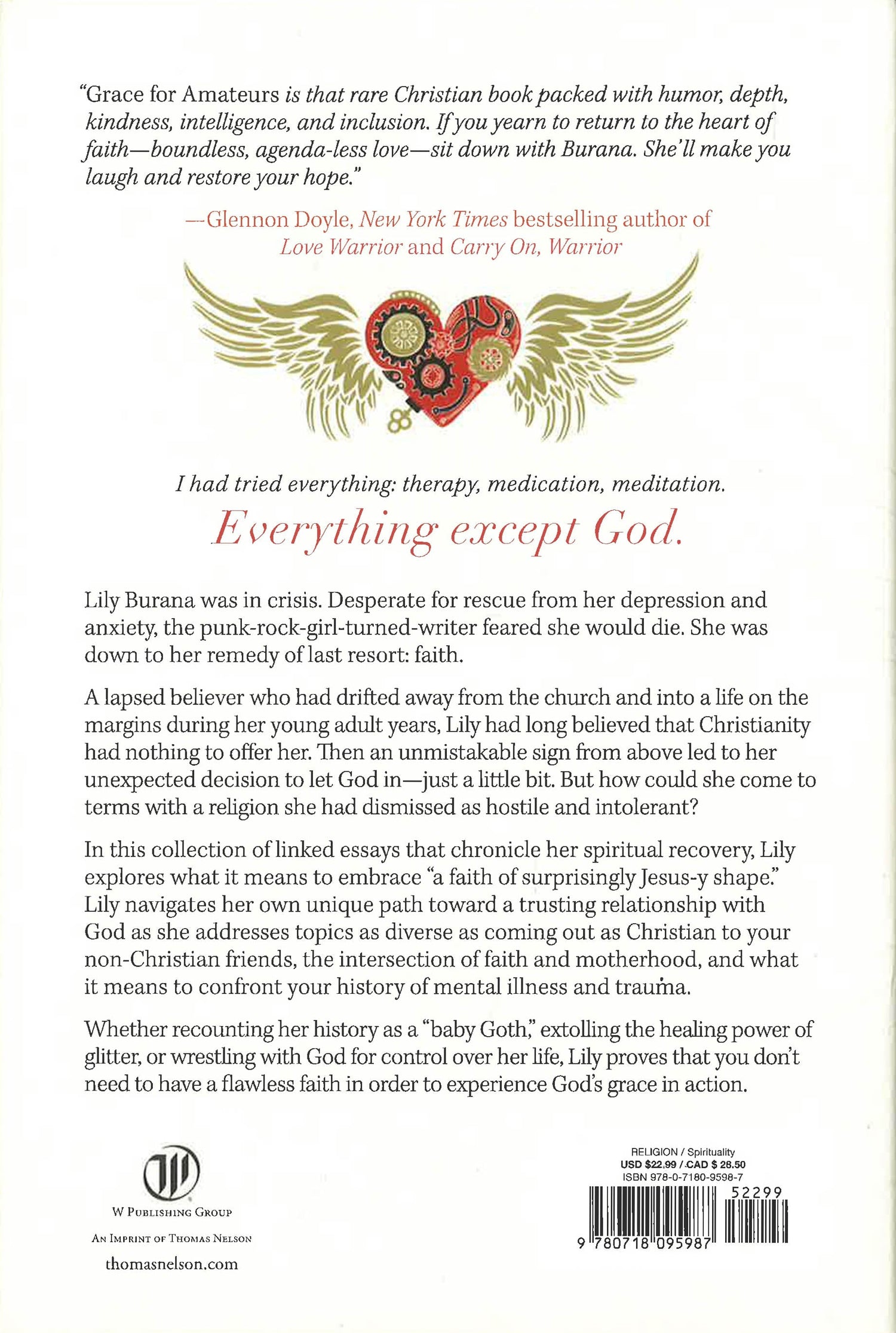 Lily Burana was in crisis. Desperate for rescue from her depression and anxiety, the punk-rock-girl-turned-writer feared she would die. She was down to her remedy of last resort: faith. A lapsed believer who had drifted away from the church and into a life on the margins during her young adult years, Lily had long believed that Christianity had nothing to offer her. Then an unmistakable sign from above led to her unexpected decision to let God in - t a little bit. But how could she come to terms with a religion she had dismissed as hostile and intolerant? In this collection of linked essays that chronicle her spiritual recovery, Lily explores what it means to embrace "a faith of surprisingly Jesus-y shape." Lily navigates her own unique path toward a trusting relationship with God as she addresses topics as diverse as coming out as Christian to your non-Christian friends, the intersection of faith and motherhood, and what it means to confront your history of mental illness and trauma. Whether recounting her history as a "baby Goth," extolling the healing power of glitter, or wrestling with God for control over her life, Lily proves that you don?t need to have a flawless faith in order to experience God?s grace in action.