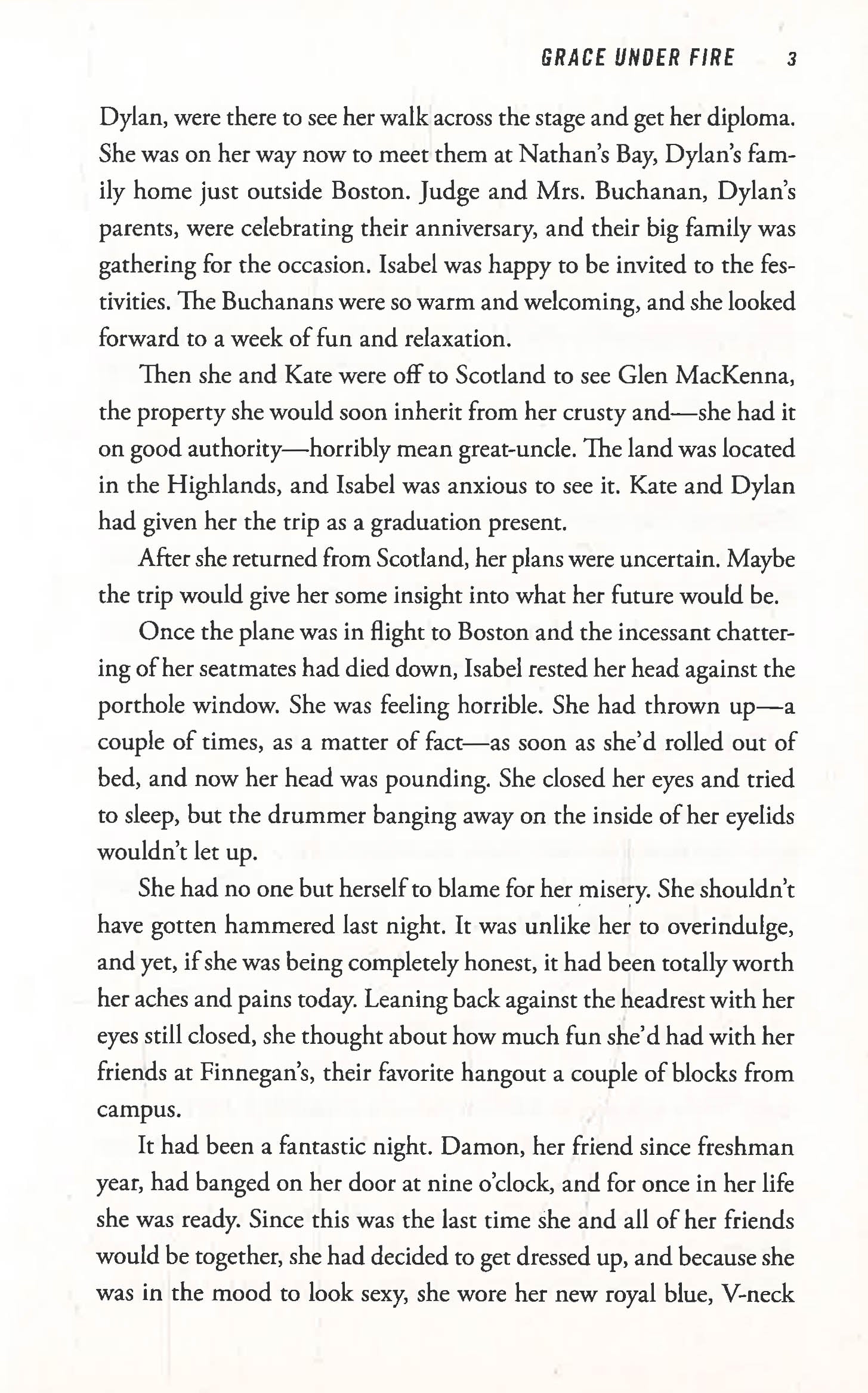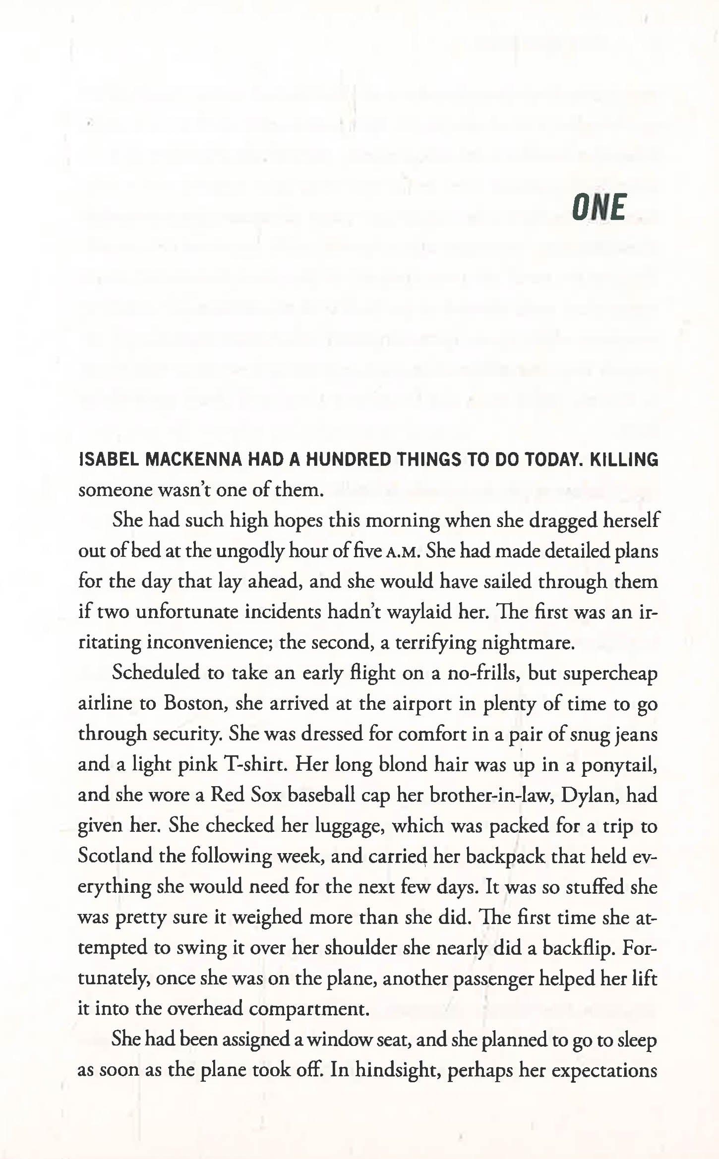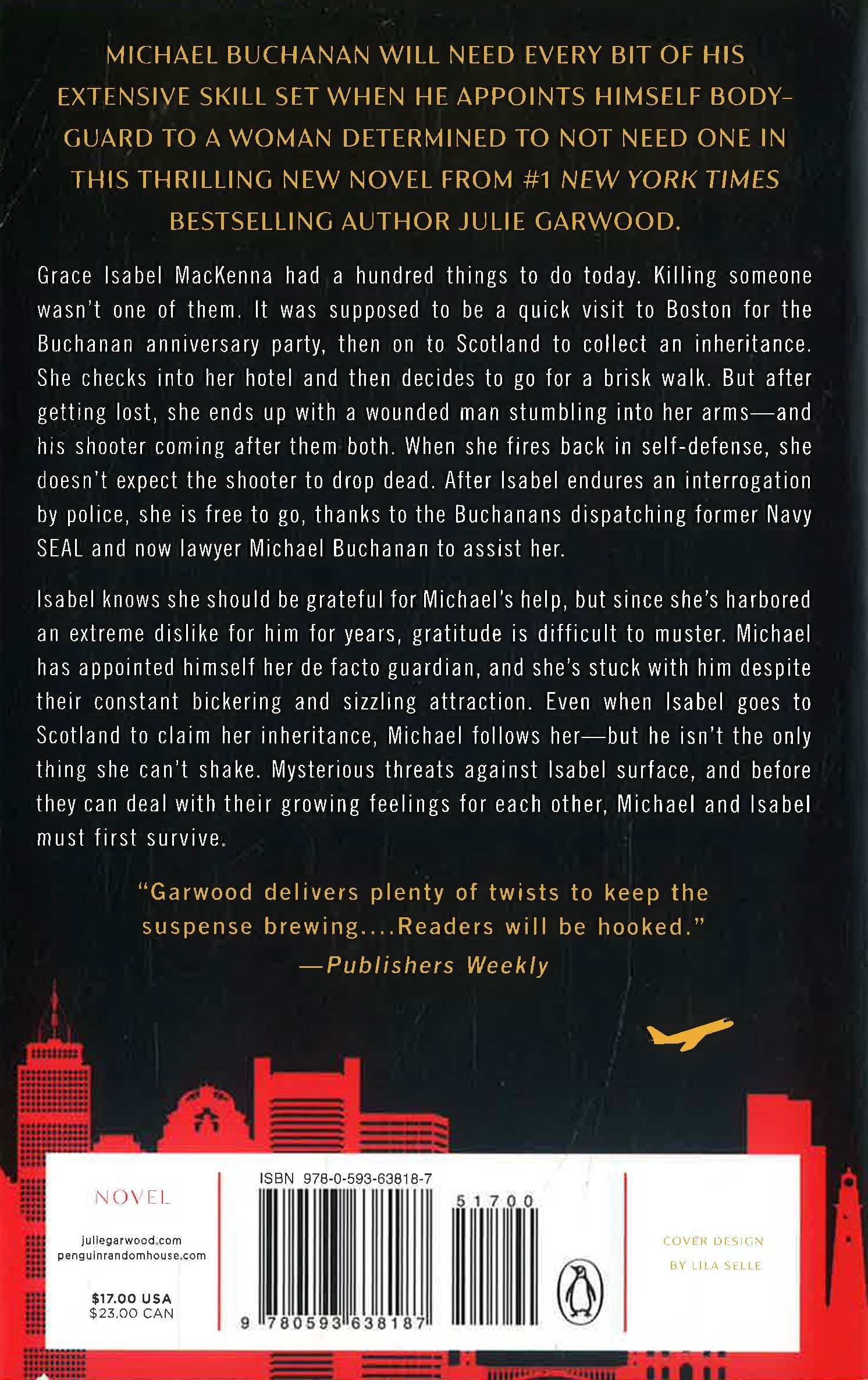Grace Isabel MacKenna has a hundred things to do today. Killing someone isn't one of them. It is supposed to be a quick visit to Boston for the Buchanan anniversary party, then on to Scotland to collect an inheritance. She checks into her hotel and then decides to go for a brisk walk. But after getting lost, she ends up with a wounded man stumbling into her arms--and his shooter coming after them both. When she fires back in self-defense, she doesn't expect him to drop dead. After Isabel endures an interrogation by police, she is free to go, thanks to the Buchanans dispatching former Navy SEAL and now lawyer Michael Buchanan to assist her.