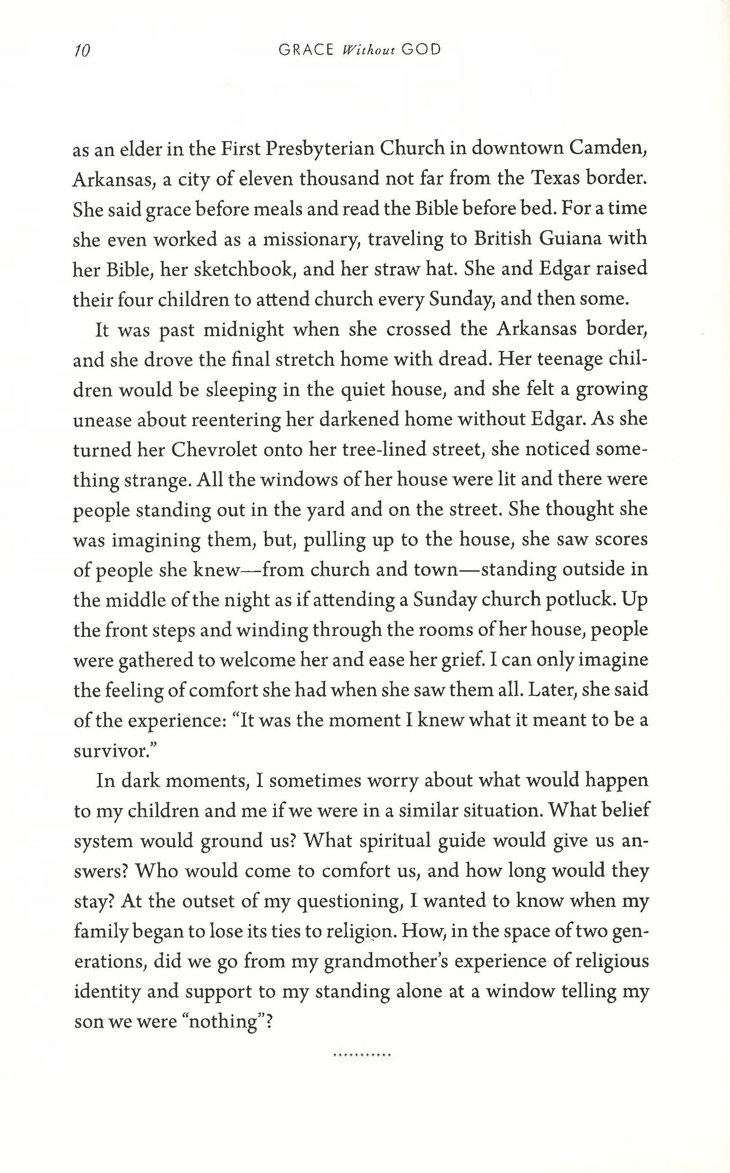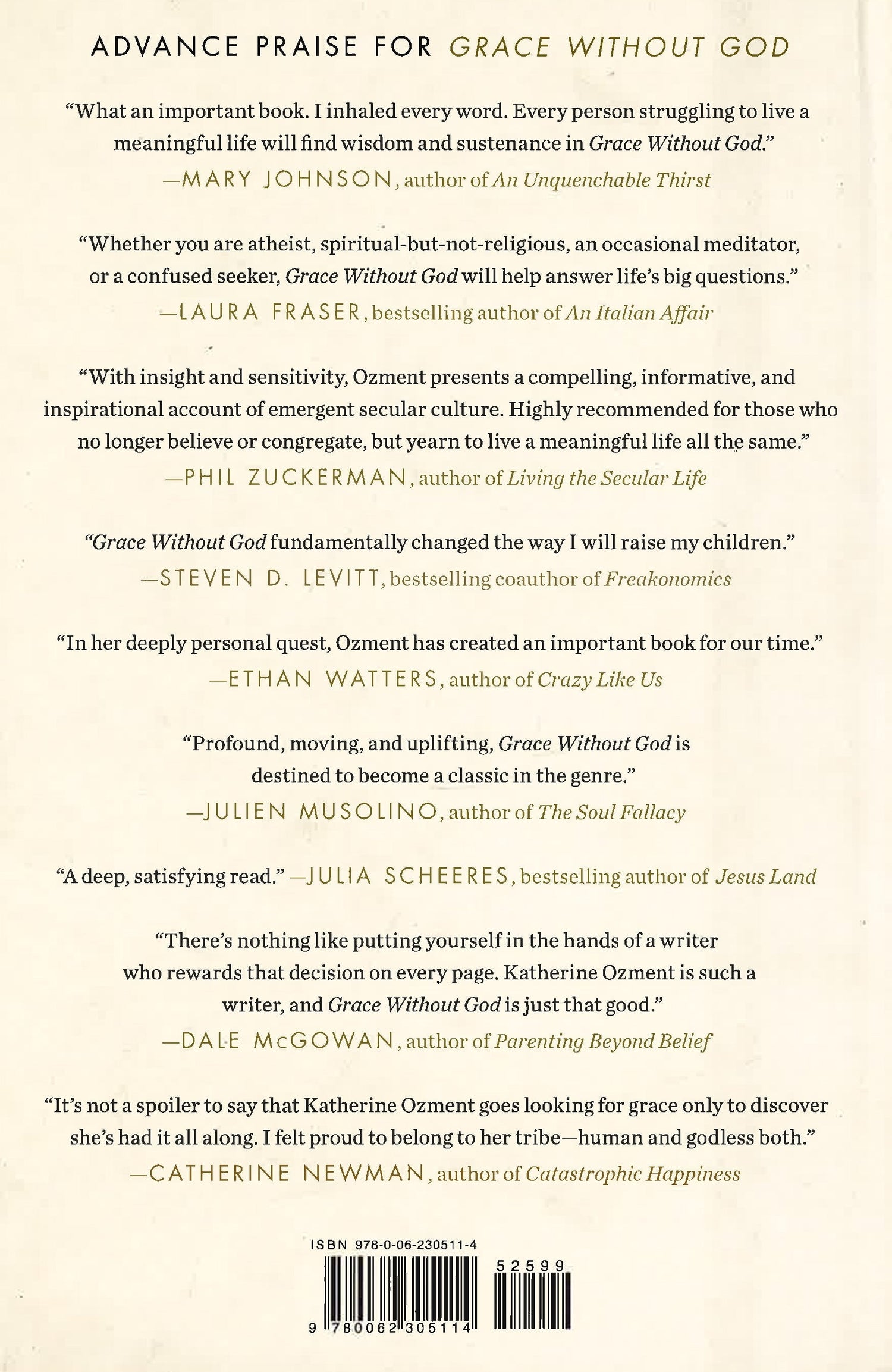 Meet the NonesIn this thought-provoking exploration of secular America, celebrated journalist Katherine Ozment takes readers on a quest to understand the trends and ramifications of a nation in flight from organized religion. Studies show that religion makes us happier, healthier and more giving, connecting us to our past and creating tight communal bonds. Most Americans are raised in a religious tradition, but in recent decades many have begun to leave religion, and with it their ancient rituals, mythic narratives, and sense of belonging. So how do the nonreligious fill the need for ritual, story, community, and, above all, purpose and meaning without the one-stop shop of religion What do they do with the space left after religion With Nones swelling to one-fourth of American adults, and more than one-third of those under thirty, these questions have never been more urgent. Writer, journalist, and secular mother of three Katherine Ozment came face-to-face with the fundamental issue of the Nones when her son asked her the simplest of questions: what are we Unsettled by her replyNothingshe set out on a journey to find a better answer. She traversed the frontier of American secular life, sought guidance in science and the humanities, talked with noted scholars, and wrestled with her own familys attempts to find meaning and connection after religion. Insightful, surprising, and compelling, Grace Without God is both a personal and critical exploration of the many ways nonreligious Americans create their own meaning and purpose in an increasingly secular age.
