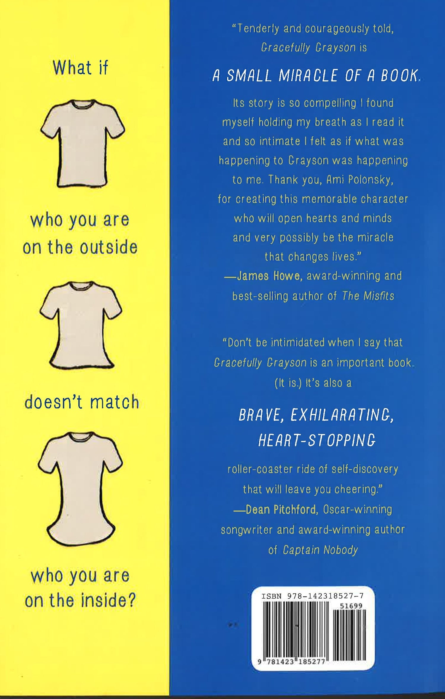 "Tenderly and courageously told, Gracefully Grayson is a small miracle of a book. Its story is so compelling I found myself holding my breath as I read it and so intimate I felt as if what was happening to Grayson was happening to me. Thank you, Ami Polonsky, for creating this memorable character who will open hearts and minds and very possibly be the miracle that changes lives." -James Howe, award-winning and best-selling author of The Misfits What if who you are on the outside doesn't match who you are on the inside? Grayson Sender has been holding onto a secret for what seems like forever: "he" is a girl on the inside, stuck in the wrong gender's body. The weight of this secret is crushing, but sharing it would mean facing ridicule, scorn, rejection, or worse. Despite the risks, Grayson's true self itches to break free. Will new strength from an unexpected friendship and a caring teacher's wisdom be enough to help Grayson step into the spotlight she was born to inhabit? Debut author Ami Polonsky's moving, beautifully-written novel about identity, self-esteem, and friendship shines with the strength of a young person's spirit and the enduring power of acceptance. More advance praise for Gracefully Grayson "Don't be intimidated when I say that Gracefully Grayson is an important book. (It is.) It's also a brave, exhilarating, heart-stopping, roller-coaster ride of self-discovery that will leave you cheering." -Dean Pitchford, Oscar-winning songwriter and award-winning author of Captain Nobody and Nickel Bay Nick
