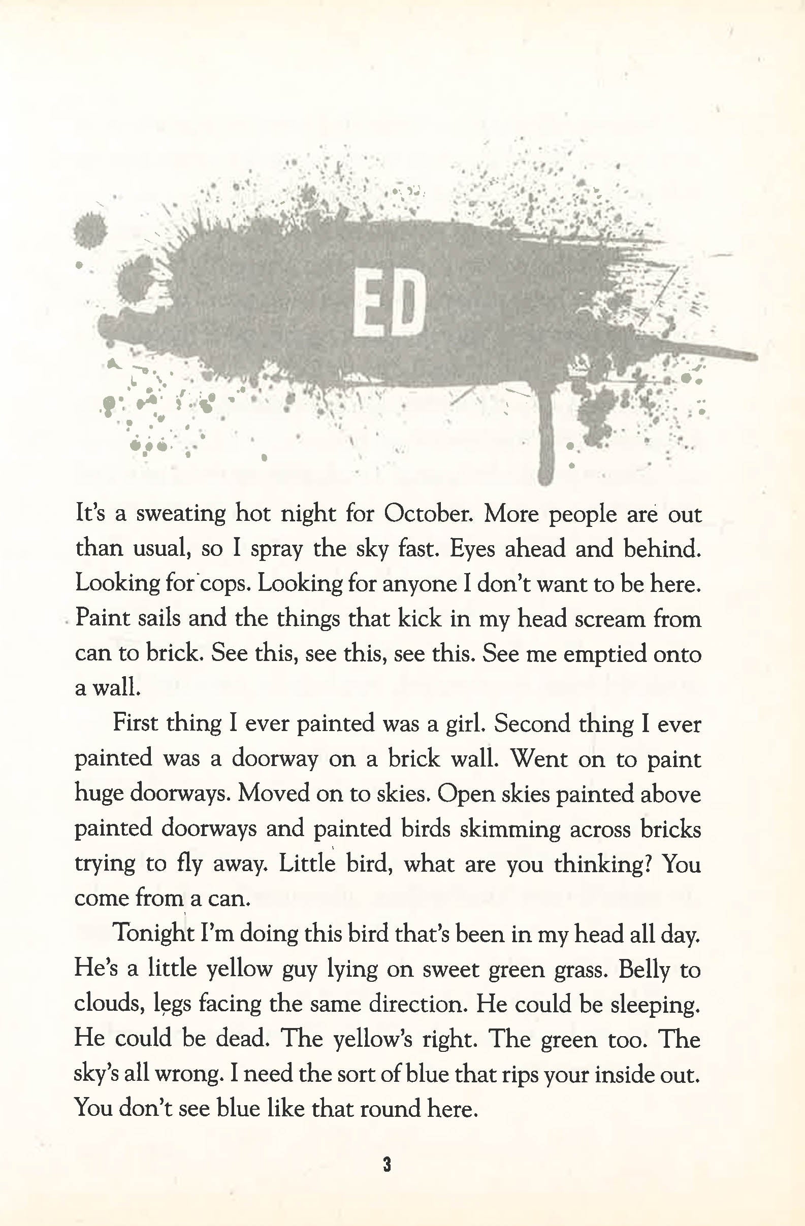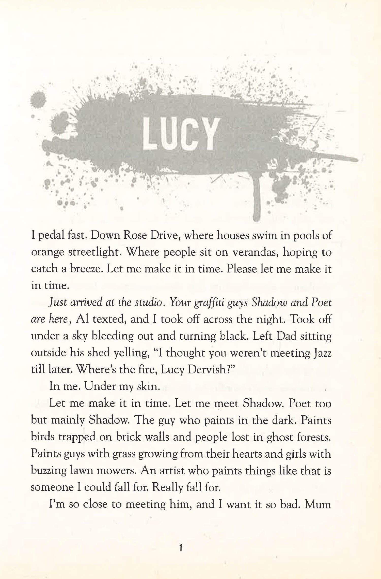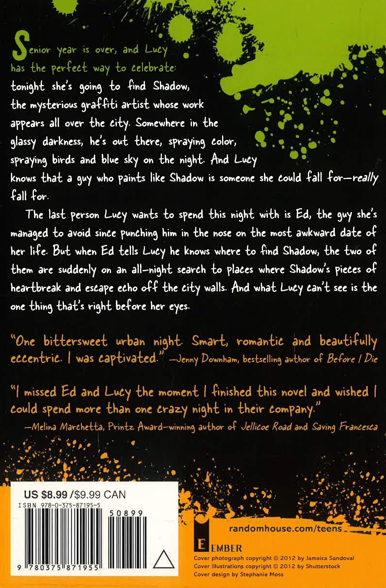 Senior year is over, and Lucy has the perfect way to celebrate: tonight, she's going to find Shadow, the mysterious graffiti artist whose work appears all over the city. He's out there somewhere--spraying color, spraying birds and blue sky on the night--and Lucy knows a guy who paints like Shadow is someone she could fall for. Really fall for. Instead, Lucy's stuck at a party with Ed, the guy she's managed to avoid since the most awkward date of her life. But when Ed tells her he knows where to find Shadow, they're suddenly on an all-night search around the city. And what Lucy can't see is the one thing that's right before her eyes.