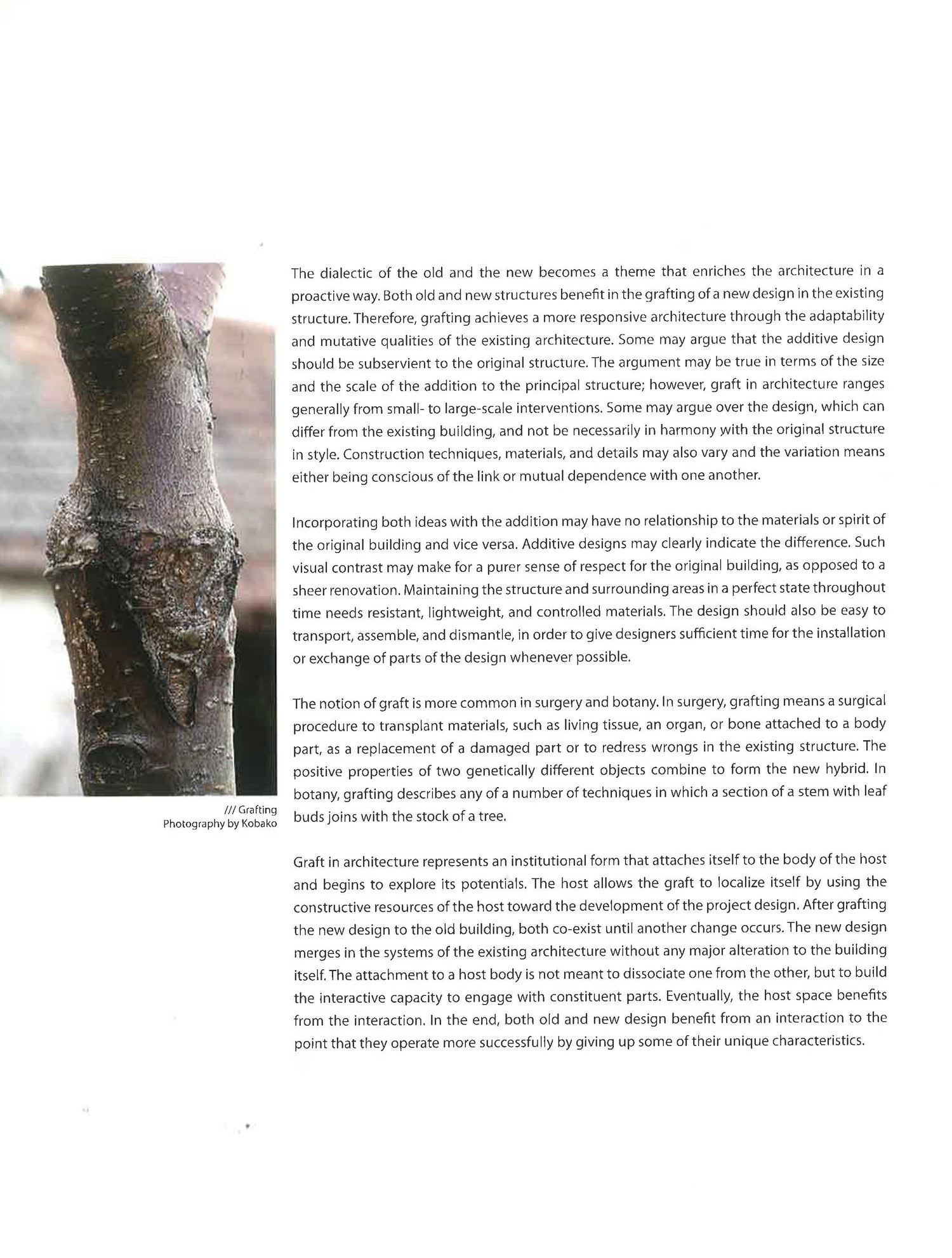 Focuses on the idea of breathing new life into existing spaces. 'Graft' in architecture refers to any designs added to existing or neglected structures, reinvigorating tired spaces with new life. Instead of dismissing these spaces as simply 'functional', graft in architecture values them for their potential and shows how we can turn negative spaces into opportunities to breathe new life into architecture. Along with the Design Research and Innovation Laboratory (D-Lab), Professor Jin-Ho Park highlights four projects and the process involved in grafting, from conception to fabrication, along with plans, drawings, and photographs detailing every aspect and consideration. Using inventive ideas and experimental approaches, Professor Park demonstrates the benefits graft in architecture can bring to any space. SELLING POINTS: - Focuses on the idea of breathing new life into existing spaces - Preface by Eric Owen Moss, winner of the Jencks Award by the Royal Institute of British Architects in 2011- - Features four projects highlighting the grafting process from conception to fabrication 400 col.