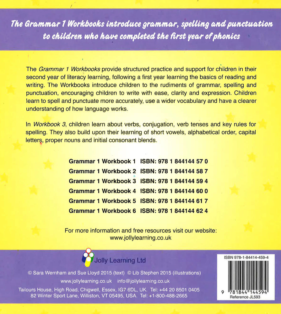 The Grammar 1 Workbooks contain grammar, spelling and punctuation topics ideal for children who have completed their first year of phonics. These workbooks provide structured practice and support for children entering their second year of literacy learning after mastering basic reading and writing skills. Following the units covered in The Grammar 1 Handbook, Grammar 1 Workbooks 1-6 cover an academic year of fun activities that reflect Year 1/P1 teaching. Containing handy checklists for what children are learning in school, these workbooks enable children to be confident writers through independent practice. Ages 5+. Also available to purchase as a set of 1-6. Content Grammar 1 Workbook 3