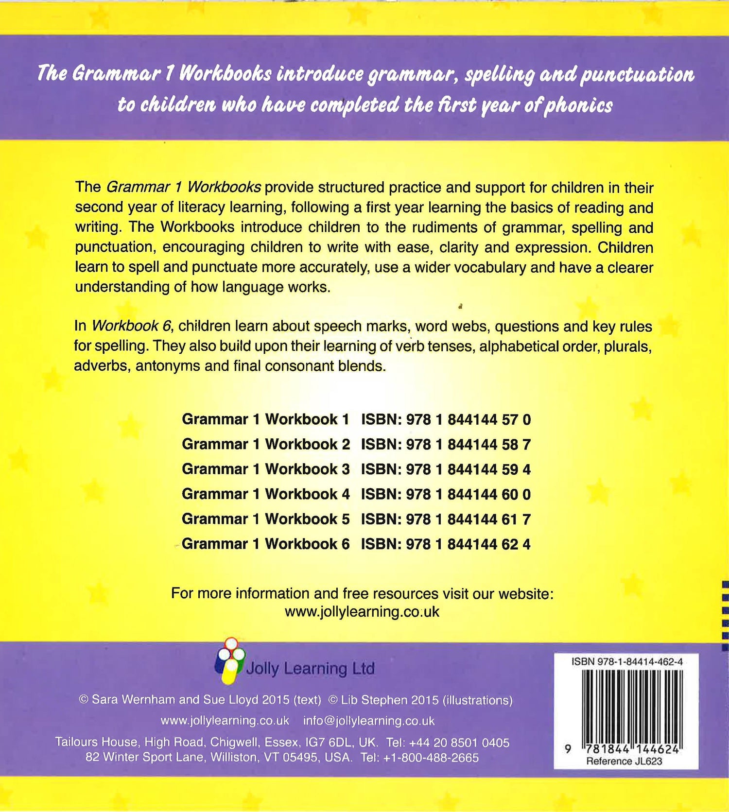 The Grammar 1 Workbooks contain grammar, spelling and punctuation topics ideal for children who have completed their first year of phonics. These workbooks provide structured practice and support for children entering their second year of literacy learning after mastering basic reading and writing skills. Following the units covered in The Grammar 1 Handbook, Grammar 1 Workbooks 1-6 cover an academic year of fun activities that reflect Year 1/P1 teaching. Containing handy checklists for what children are learning in school, these workbooks enable children to be confident writers through independent practice. Ages 5+. Also available to purchase as a set of 1-6. Content Grammar 1 Workbook 6