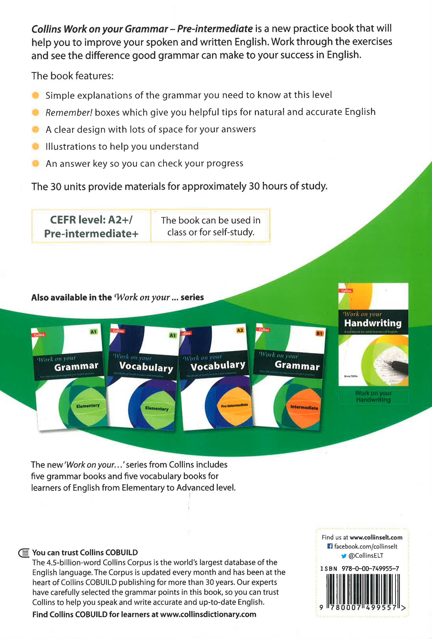 The grammar covered in Collins Work on your Grammar – Pre-Intermediate (A2) has been carefully selected based on Collins Corpus research and the experience of our language experts. As a result, this book provides plenty of useful practice with authentic, up-to-date examples of language usage in context. A carefully structured layout and simple illustrations make sure the language is always clear and the book is easy to navigate. Collins Work on your Grammar – Pre-Intermediate (A2) is ideal for self-study or for use in the classroom, and is an essential resource for students and teachers.
