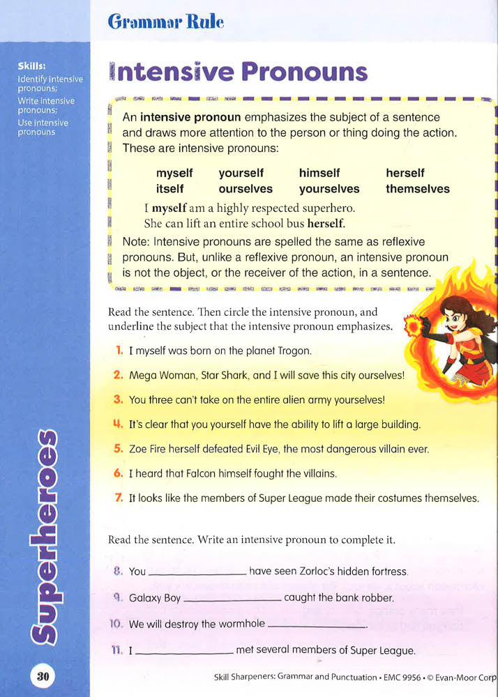 The activity book is organized into 15 theme-based units around topics that sixth graders enjoy, such as ancient civilizations, superheroes, and gaming. Each unit focuses on a grammar concept and punctuation concept, and includes: