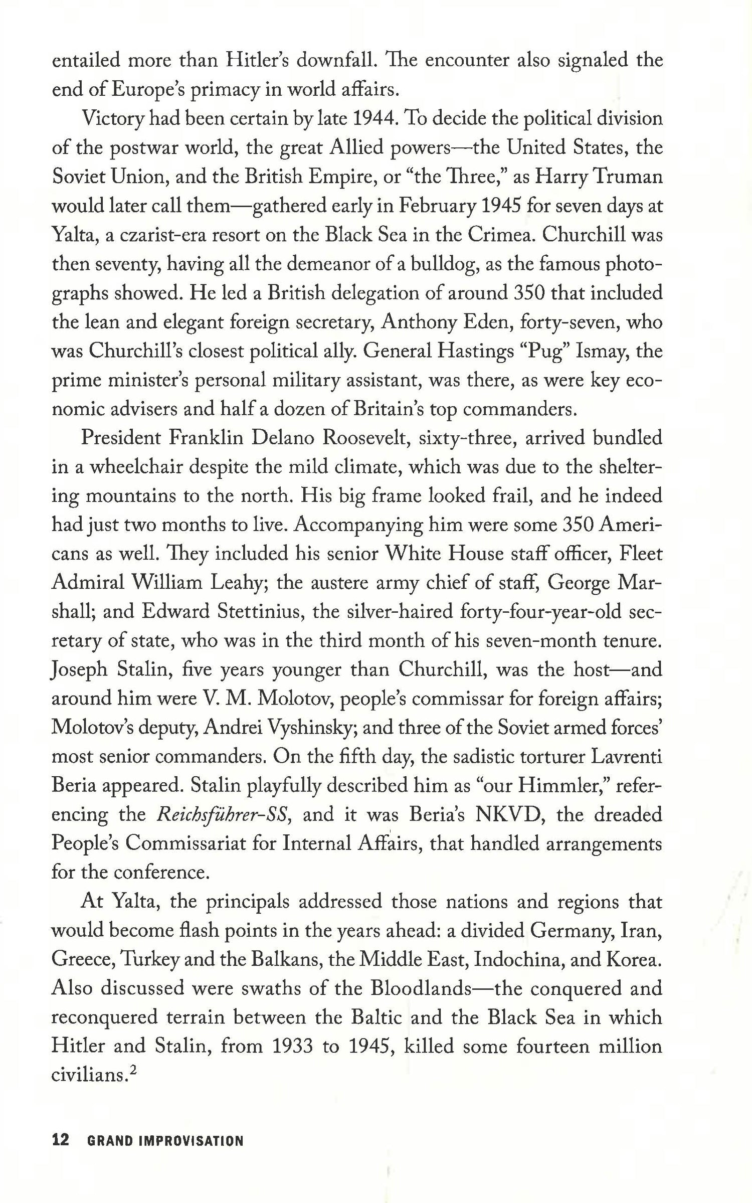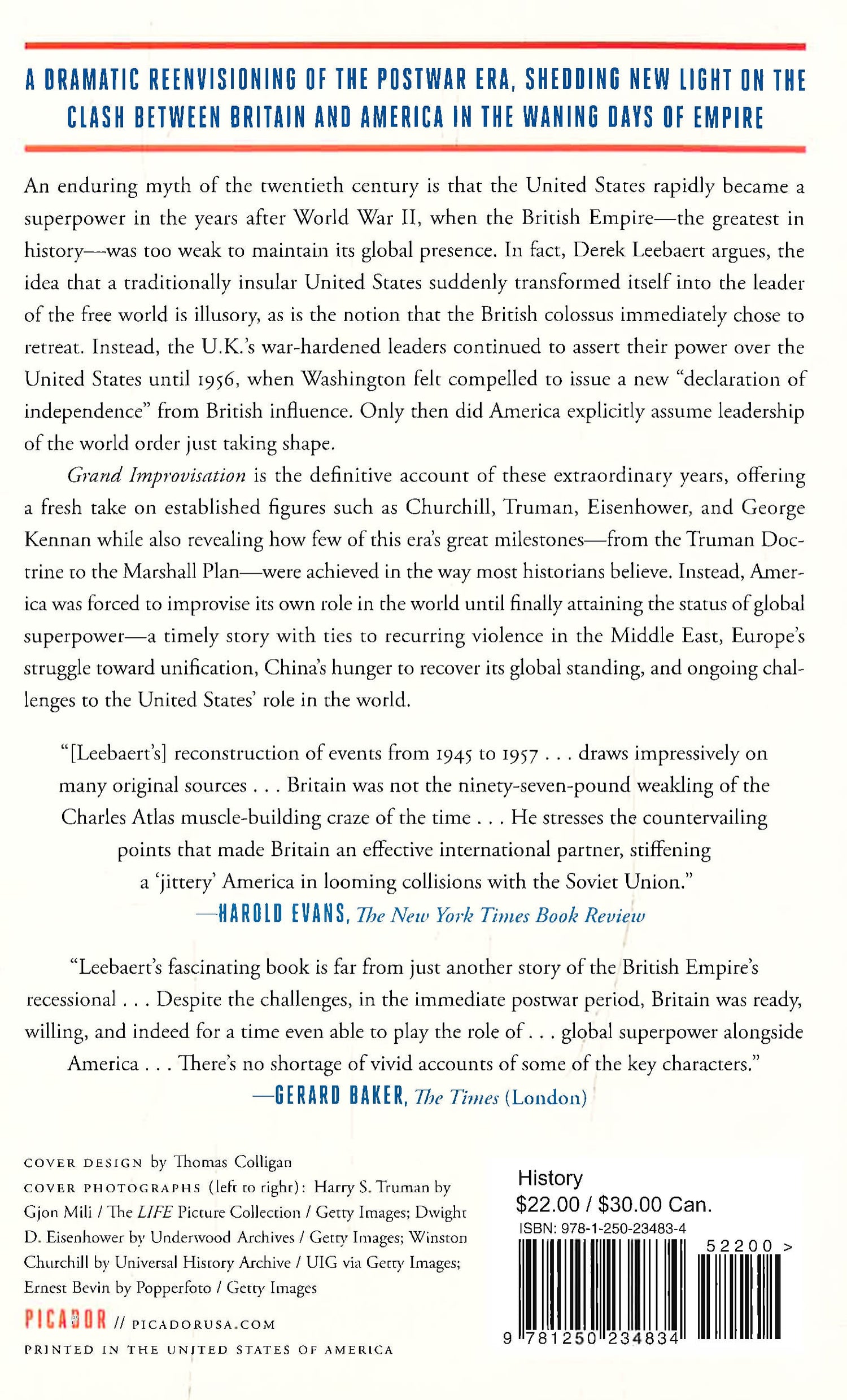 An enduring myth of the twentieth century is that the United States rapidly became a superpower in the years after World War II, when the British Empire--the greatest in history--was too wounded to maintain a global presence. In fact, Derek Leebaert argues in Grand Improvisation, the idea that a traditionally insular United States suddenly transformed itself into the leader of the free world is illusory, as is the notion that the British colossus was compelled to retreat. The United States and the U.K. had a dozen abrasive years until Washington issued a "declaration of independence" from British influence. Only then did America explicitly assume leadership of the world order just taking shape.