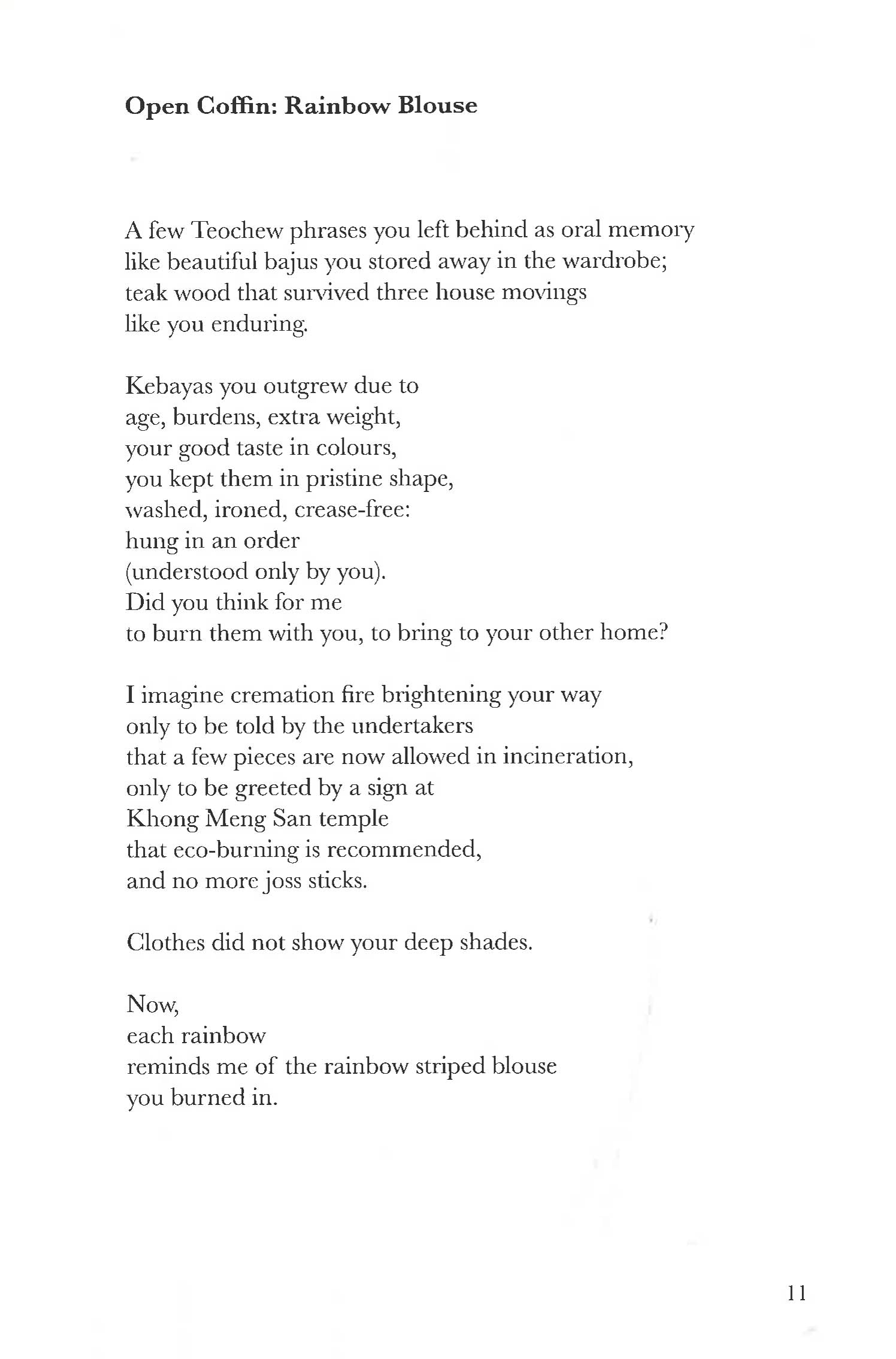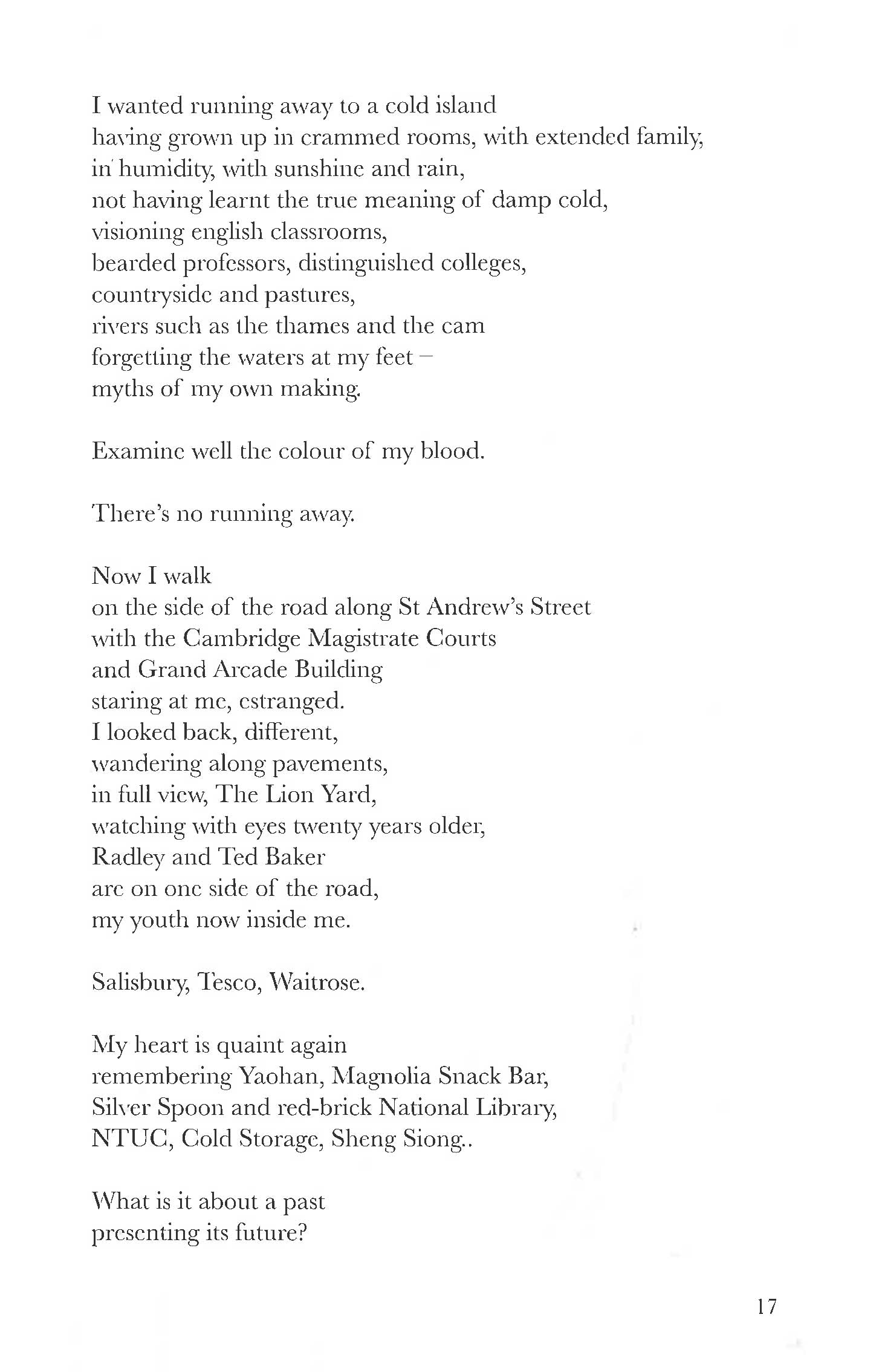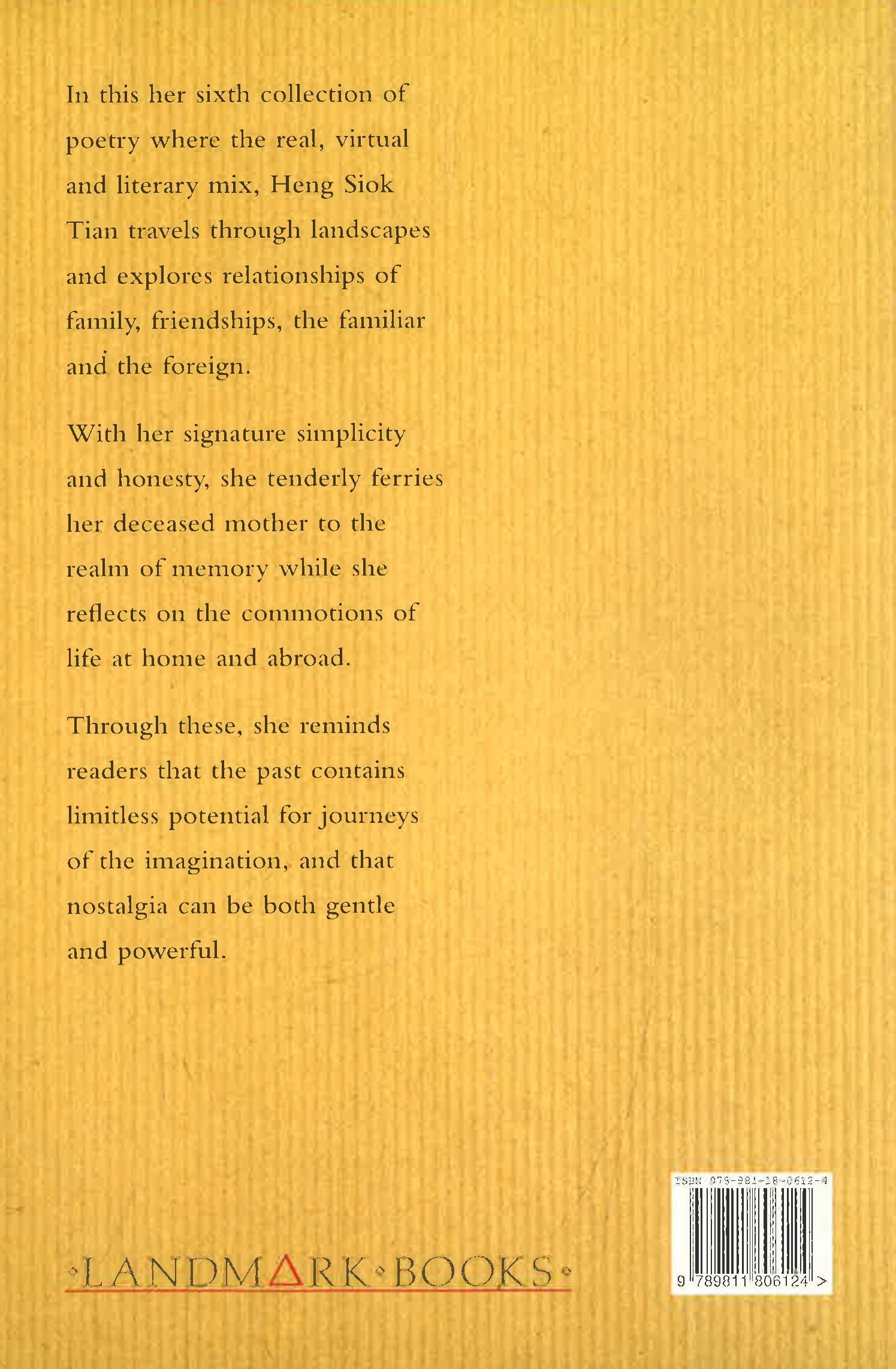 In this her sixth collection of poetry where the real, virtual and literary mix, Heng Siok Tian travels through landscapes and explores relationships of family, friendships, the familiar and the foreign. With her signature simplicity and honesty, she tenderly ferries her deceased mother to the realm of memory while she reflects on the commotions of life at home and abroad. Through these, she reminds readers that the past contains limitless potential for journeys of the imagination, and that nostalgia can be both gentle and powerful.