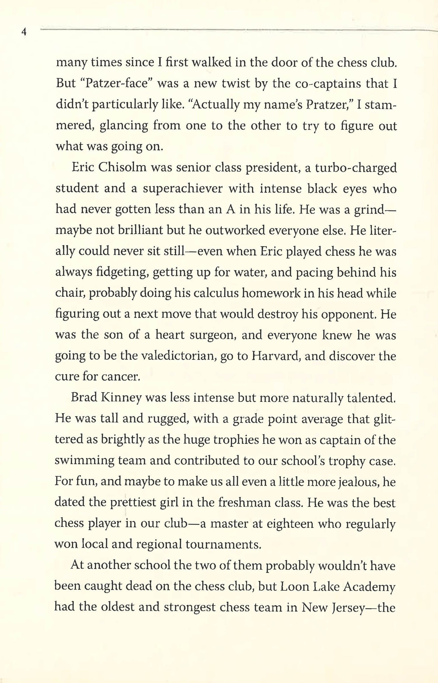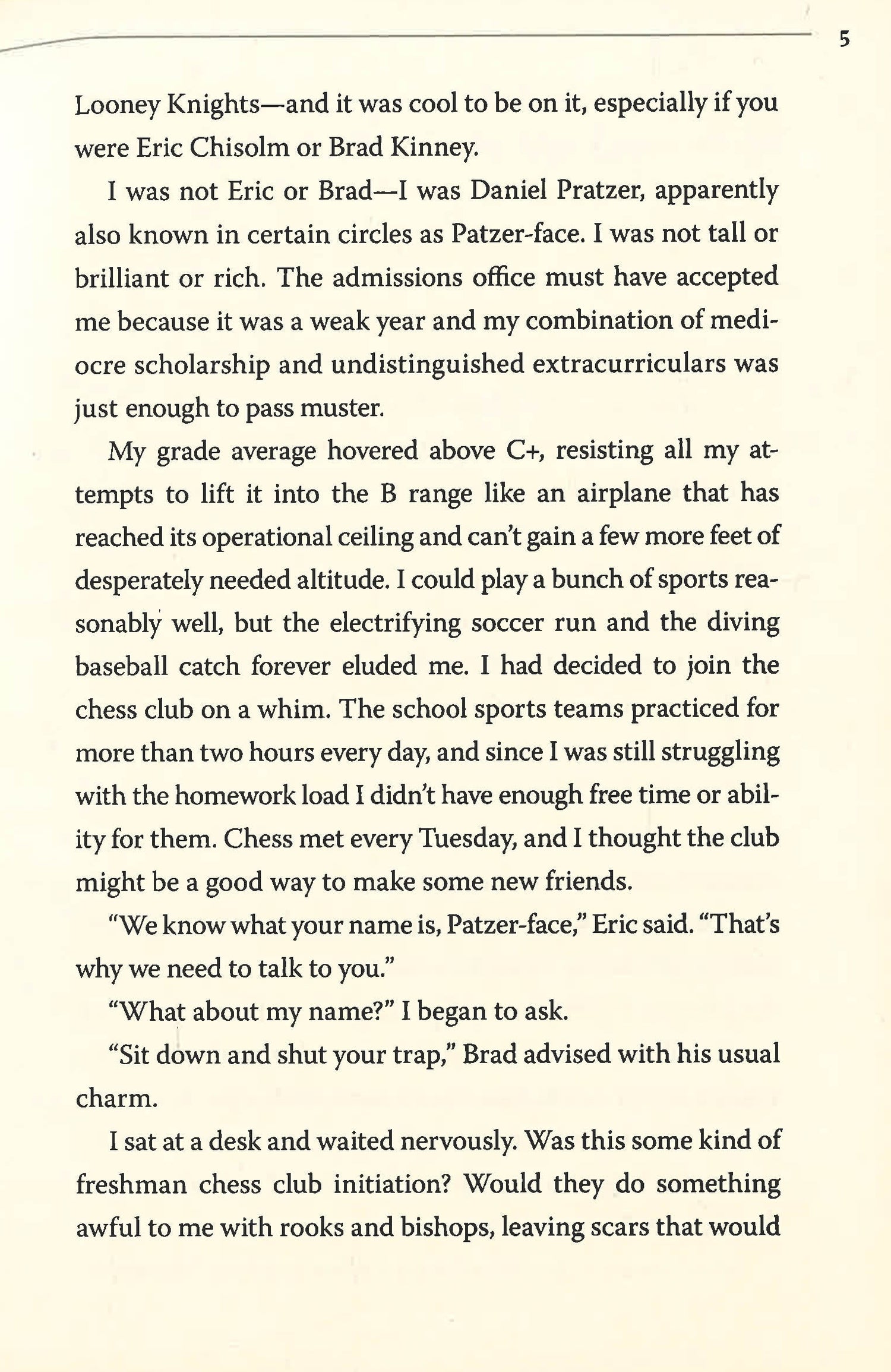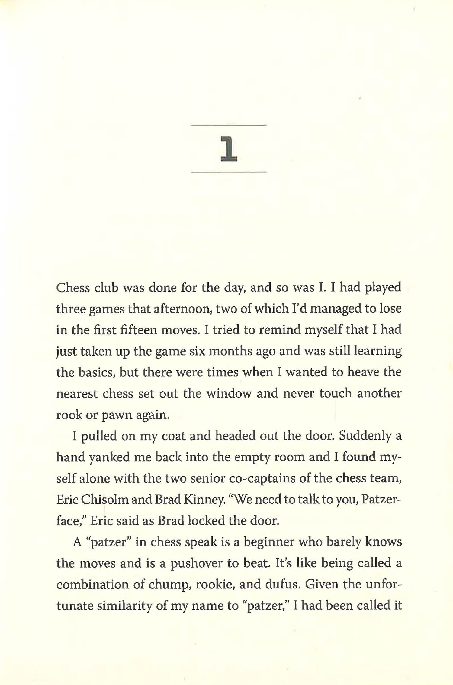 Freshman Daniel Pratzer gets a chance to prove himself when the chess team invites him and his father to a weekend-long parent-child tournament. Daniel, thinking that his father is a novice, can't understand why his teammates want so badly for them to participate. Then he finds out the truth: as a teen, his father was one of the most promising young players in America, but the pressures of the game pushed him too far, and he had to give up chess to save his own life and sanity. Now, thirty years later, Mr. Pratzer returns to the game to face down an old competitor and the same dark demons that lurk in the corners of a mind stretched by the demands of the game. Daniel was looking for acceptance--but the secrets he uncovers about his father will force him to make some surprising moves himself, in Grandmaster by David Klass.
