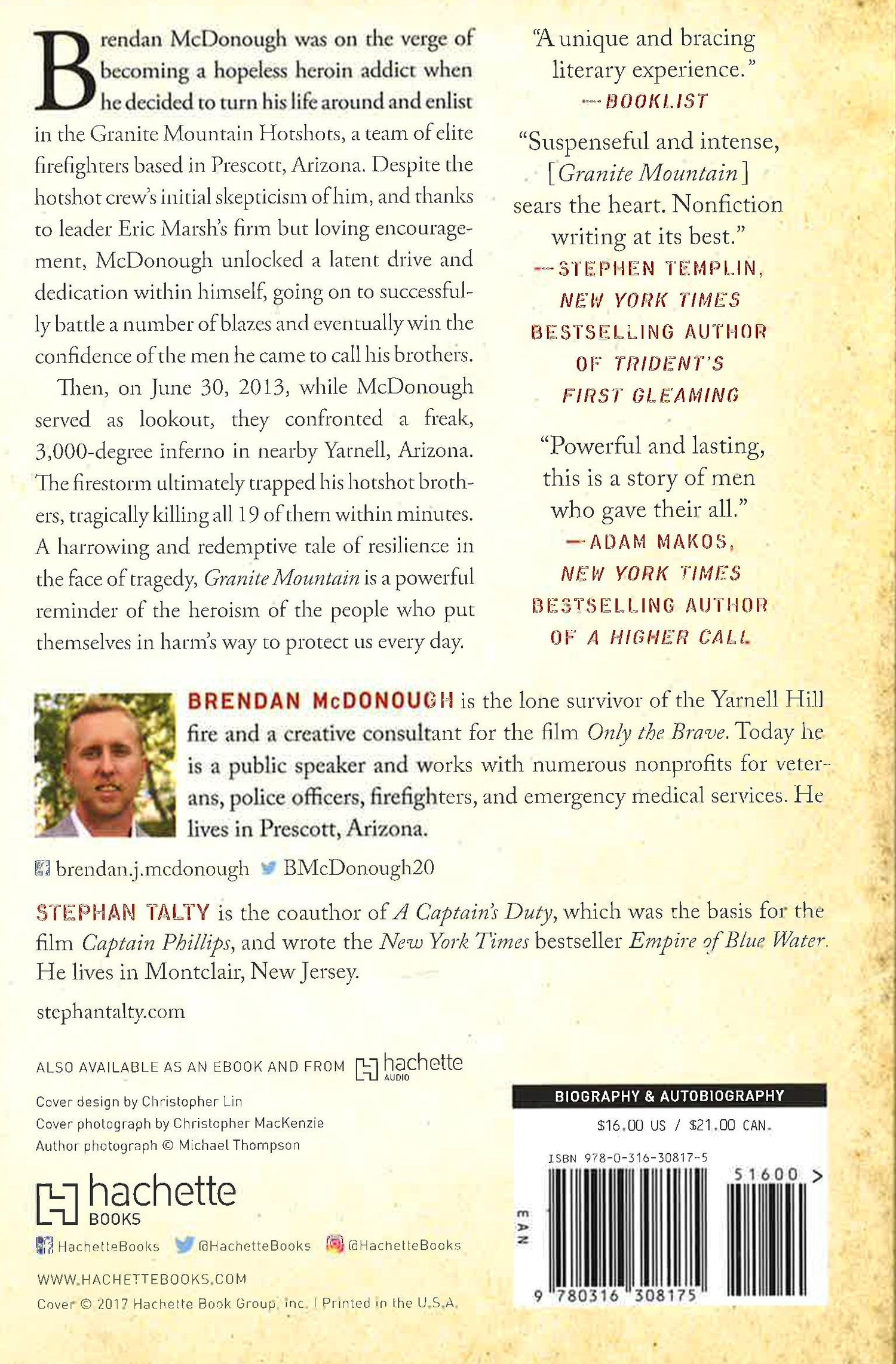 The true story behind the events that inspired the major motion picture Only the Brave. A "unique and bracing" (Booklist) first-person account by the sole survivor of Arizona's disastrous 2013 Yarnell Hill Fire, which took the lives of 19 "hotshots"--firefighters trained specifically to battle wildfires. Brendan McDonough was on the verge of becoming a hopeless, inveterate heroin addict when he, for the sake of his young daughter, decided to turn his life around. He enlisted in the Granite Mountain Hotshots, a team of elite firefighters based in Prescott, Arizona. Their leader, Eric Marsh, was in a desperate crunch after four hotshots left the unit, and perhaps seeing a glimmer of promise in the skinny would-be recruit, he took a chance on the unlikely McDonough, and the chance paid off. Despite the crew's skepticism, and thanks in large part to Marsh's firm but loving encouragement, McDonough unlocked a latent drive and dedication, going on to successfully battle a number of blazes and eventually win the confidence of the men he came to call his brothers. Then, on June 30, 2013, while McDonough--"Donut" as he'd been dubbed by his team--served as lookout, they confronted a freak, 3,000-degree inferno in nearby Yarnell, Arizona. The relentless firestorm ultimately trapped his hotshot brothers, tragically killing all 19 of them within minutes. Nationwide, it was the greatest loss of firefighter lives since the 9/11 attacks. Granite Mountain is a gripping memoir that traces McDonough's story of finding his way out of the dead end of drugs, finding his purpose among the Granite Mountain Hotshots, and the minute-by-minute account of the fateful day he lost the very men who had saved him. A harrowing and redemptive tale of resilience in the face of tragedy, Granite Mountain is also a powerful reminder of the heroism of the people who put themselves in harm's way to protect us every day.
