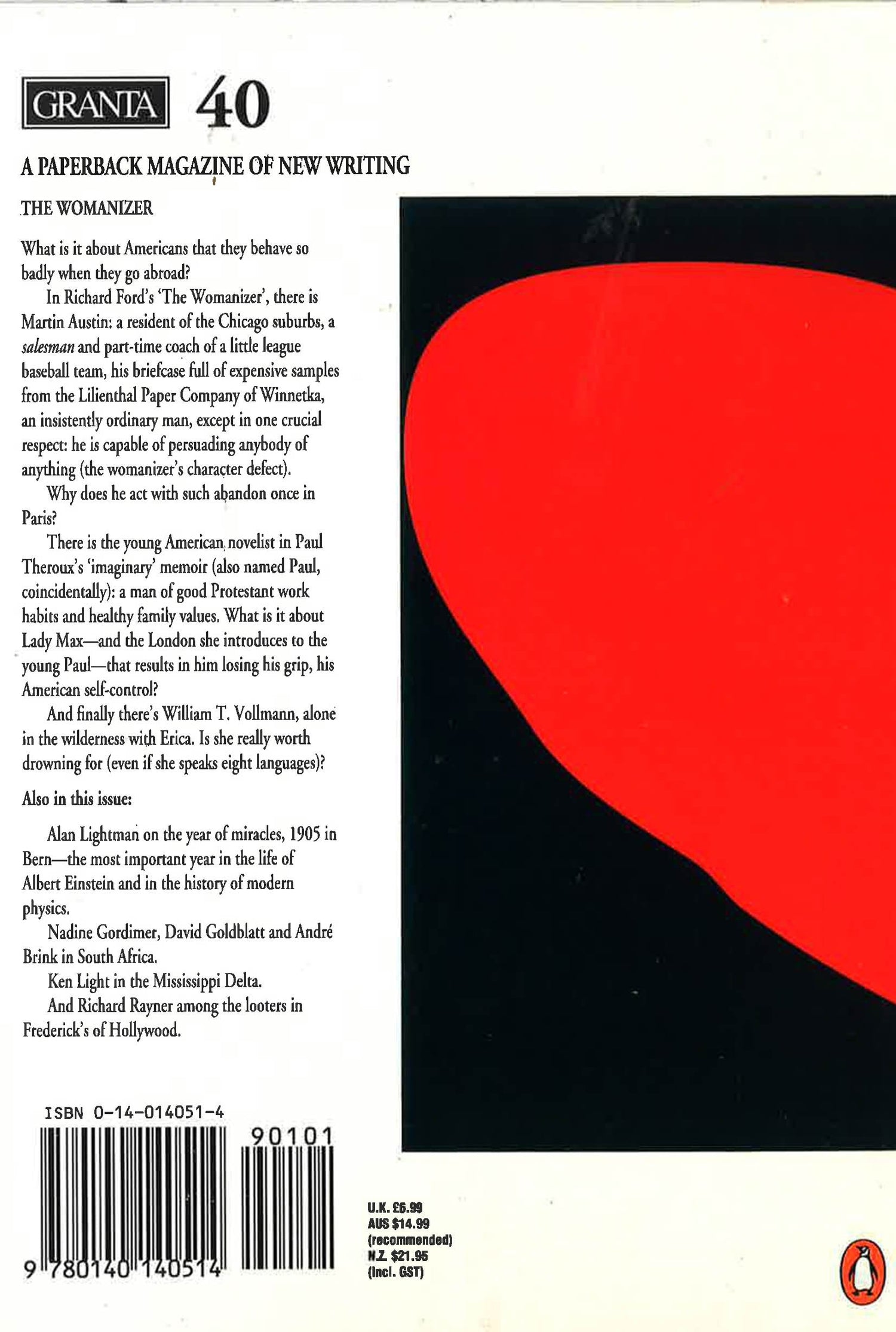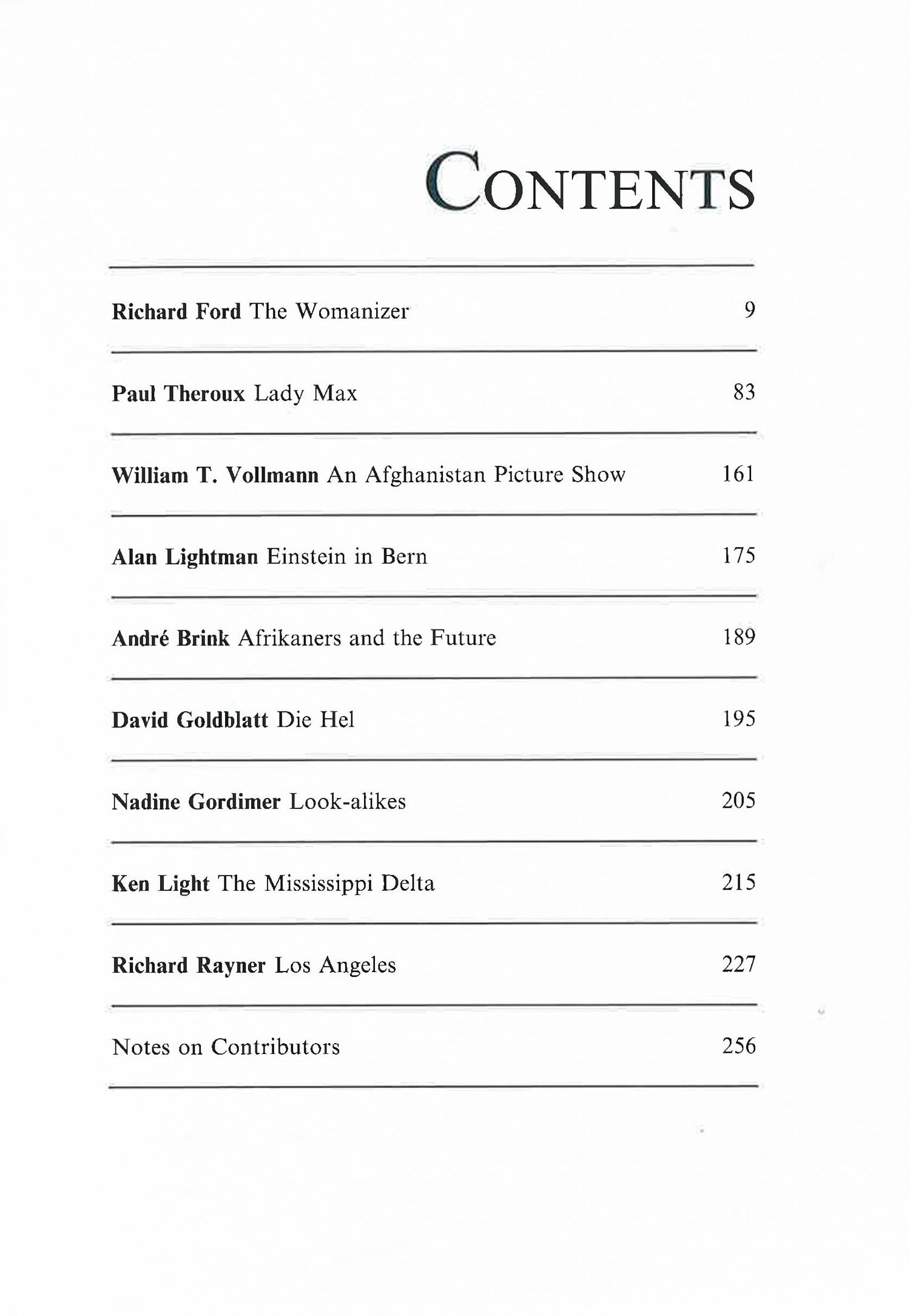 This anthology introduces the reader to three Americans behaving badly abroad in stories by Richard Ford, Paul Theroux and William T. Vollman. Also in this issue are pieces by Alan Lightman, Ken Light, Richard Rayner, Nadine Gordimer and others in South Africa.