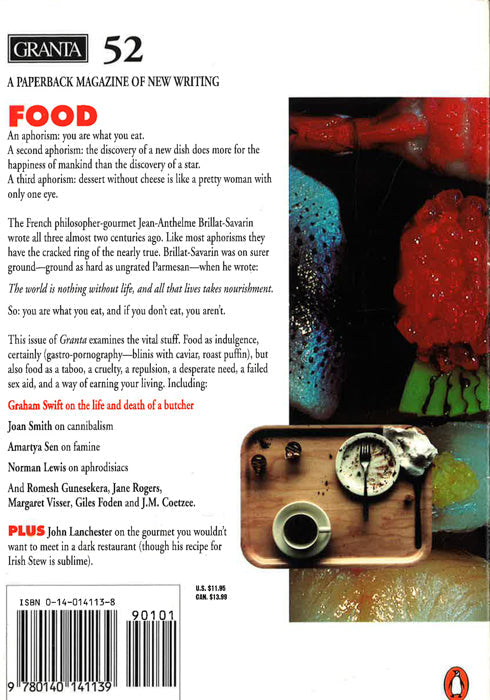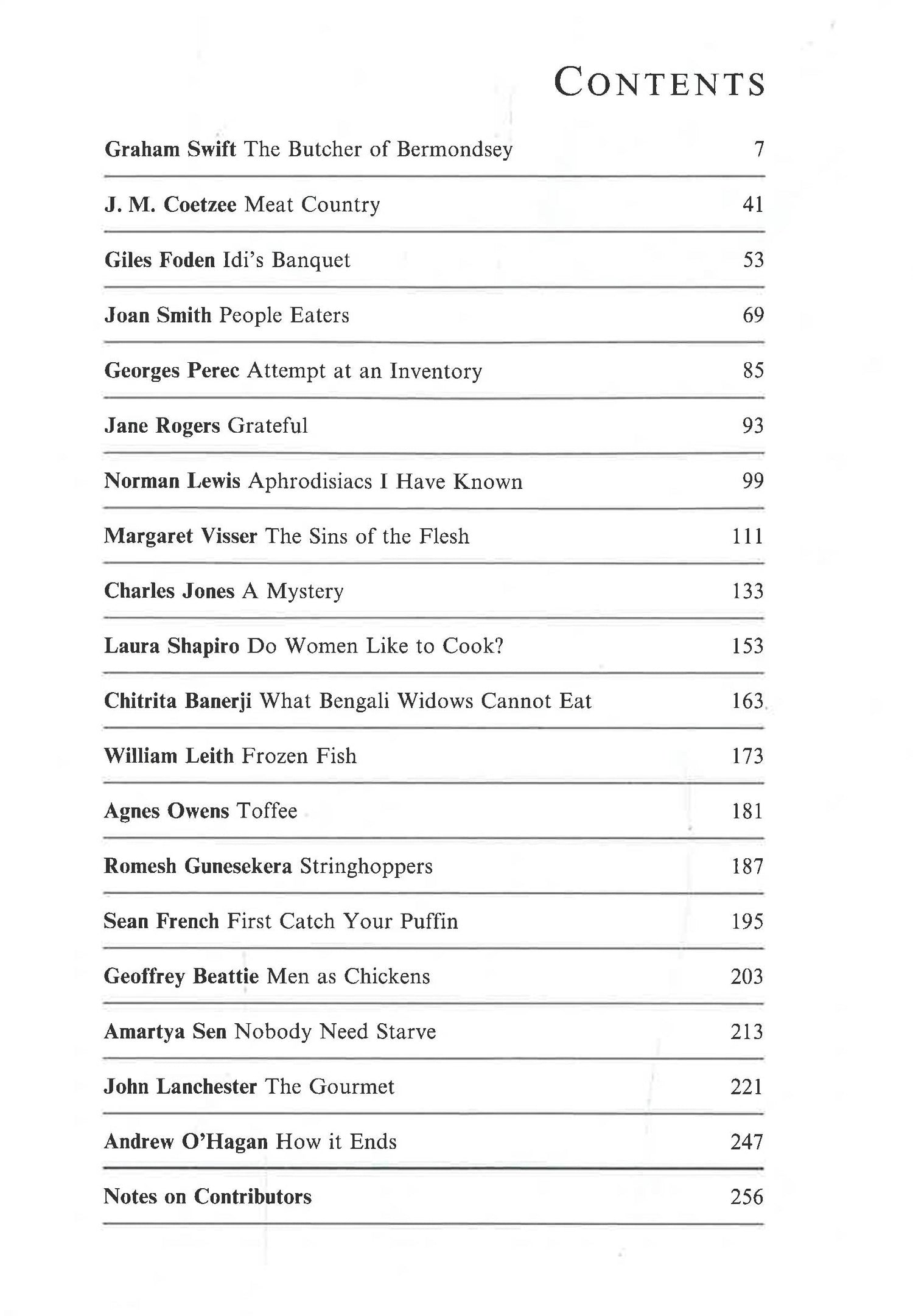 Food as indulgence, certainly, but also food as a taboo, a cruelty, a desperate need, a failed sex aid, and a means of making a living. Including Graham Swift on the life and death of a butcher, J. M. Coetzee’s attempt at vegetarianism in Texas, Giles Foden at Idi Amin’s dinner table, and Sean French on the delights of Icelandic cuisine (including roast puffin and whale sushi). Plus: Georges Perec, Romesh Gunesekera, John Lanchester, Jane Rogers, Margaret Visser and Joan Smith.