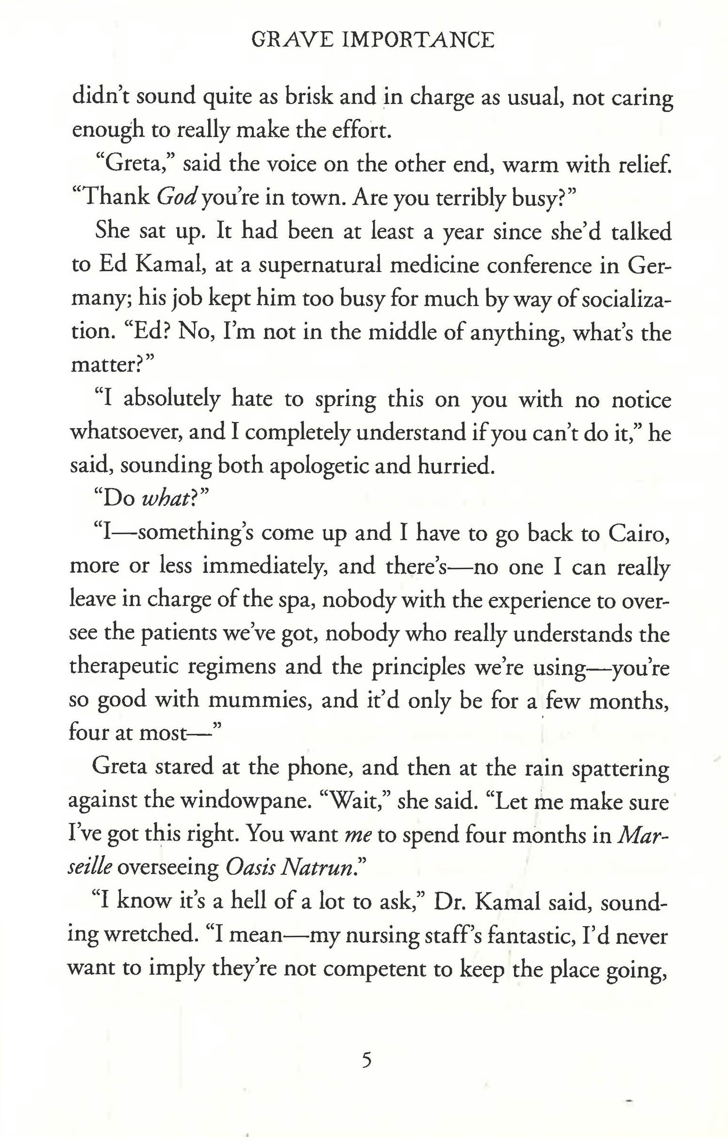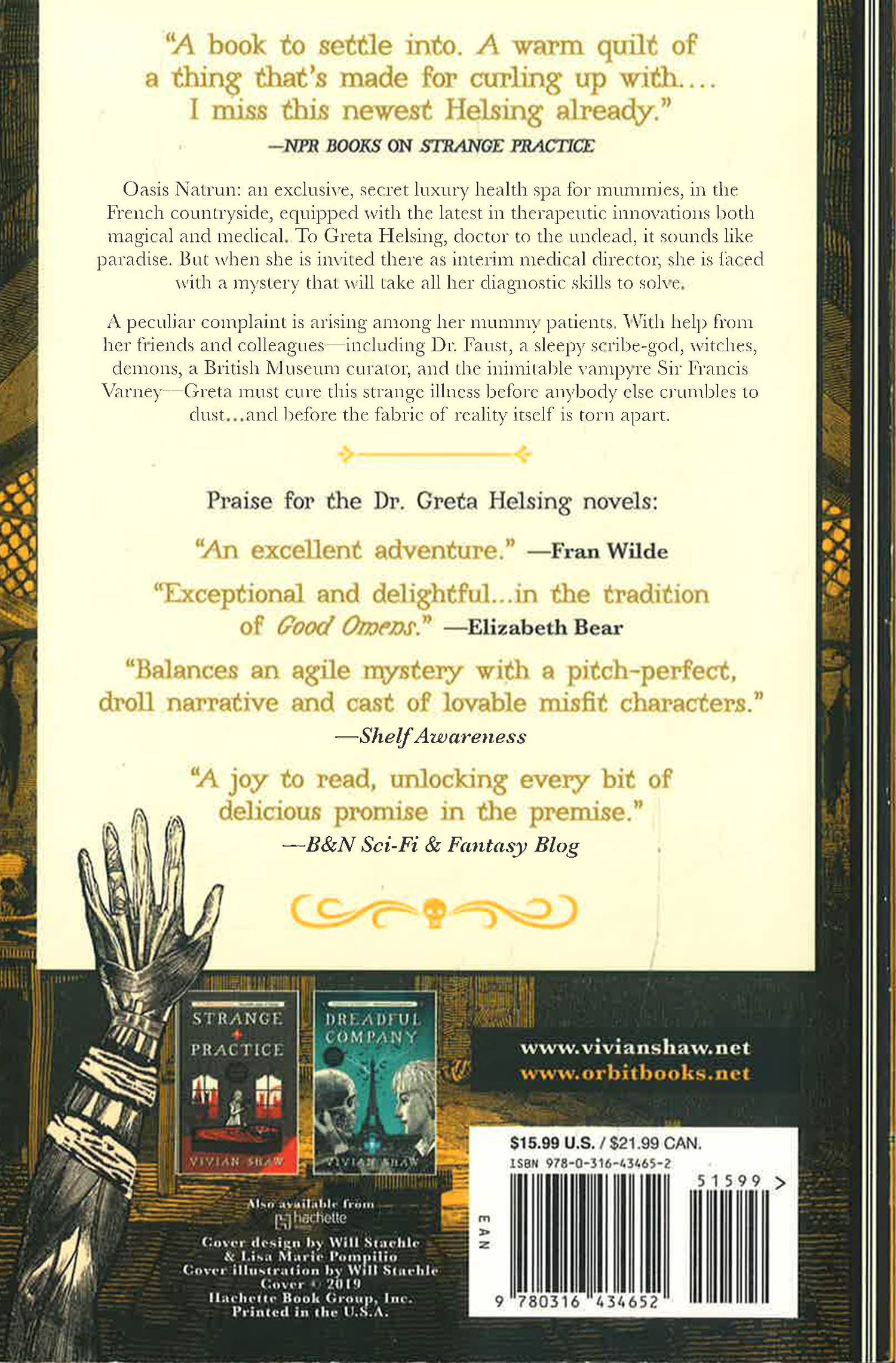 A peculiar complaint is spreading among her mummy patients, one she's never seen before. With help from her friends and colleagues -- including Dr. Faust (yes, that Dr. Faust), a sleepy scribe-god, witches, demons, a British Museum curator, and the inimitable vampyre Sir Francis Varney -- Greta must put a stop to this mysterious illness before anybody else crumbles to irreparable dust...