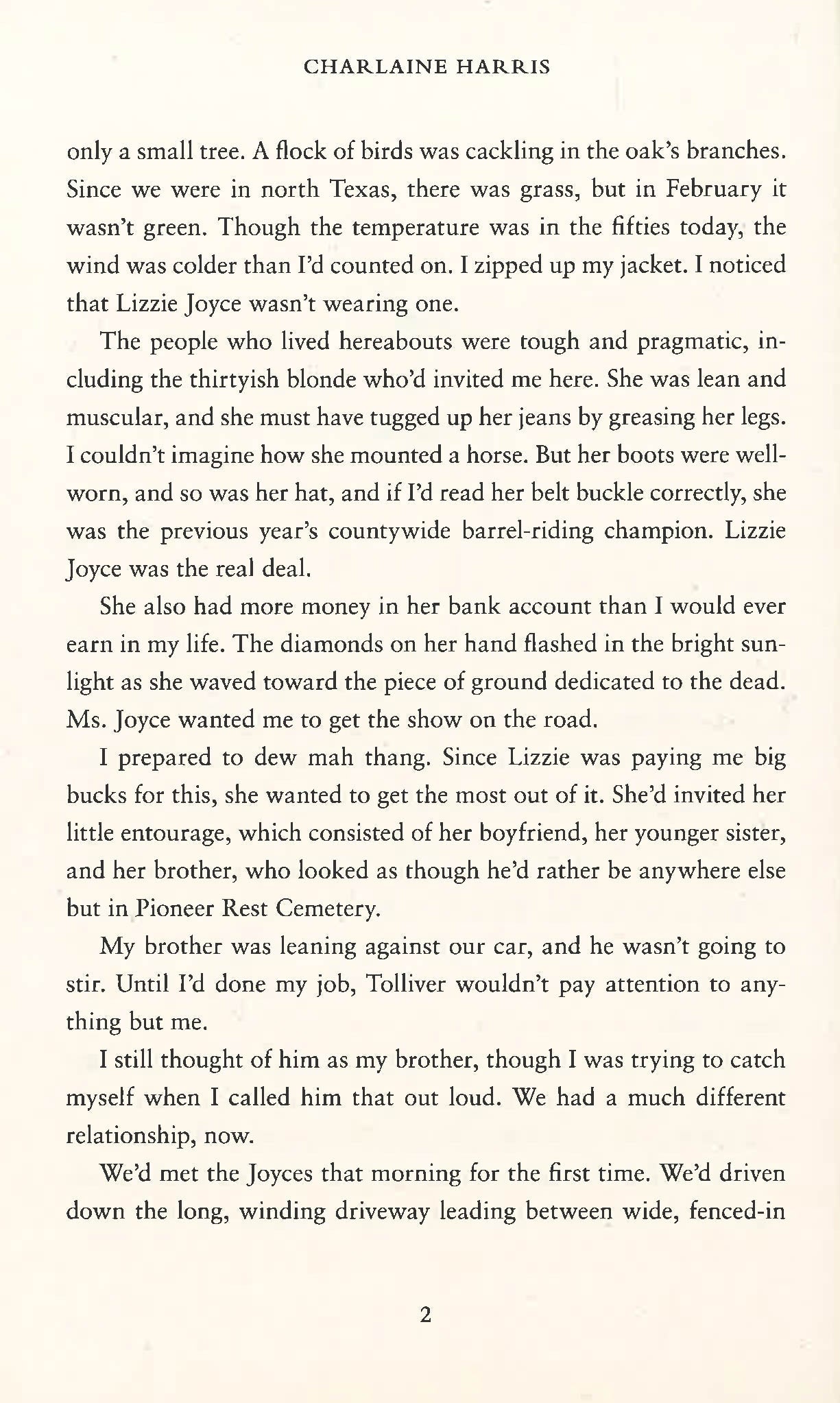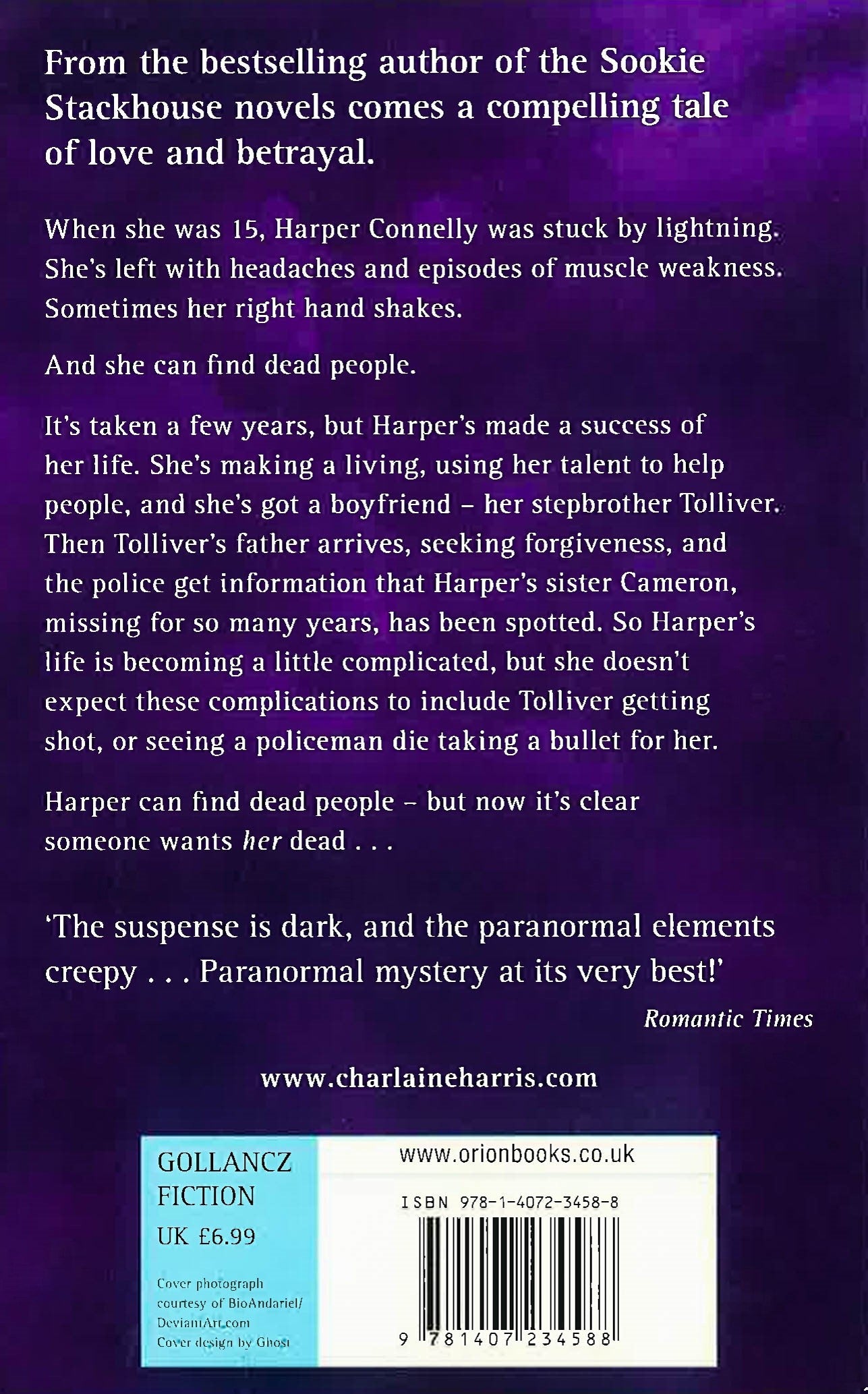 When she was 15, Harper Connelly was struck by a bolt of lightning, which left her with a spider-web of red over her body, headaches and episodes of weakness. Sometimes her right hand shakes. And she can find dead people. It's taken a while, but at last Harper's pretty happy with her life. She's making a living, using her unique talent to help people and she's got a lover - her stepbrother Tolliver. That creeps some people out. Though they grew up together and got each other through the real bad times - their parents' drug-use, the abuse, the disappearance of Harper's elder sister Cameron - they're not blood relatives. Then Tolliver's dad arrives on the scene, seeking forgiveness for the sins of their youth and the police get a tip-off that after all these years, Cameron's been spotted in a mall. With all this going on Harper realises life is getting a little complicated but she doesn't expect those complications to include Tolliver getting shot. Or watching a cop die taking a bullet for her. Harper can find dead people, but now it's clear someone wants her dead ...