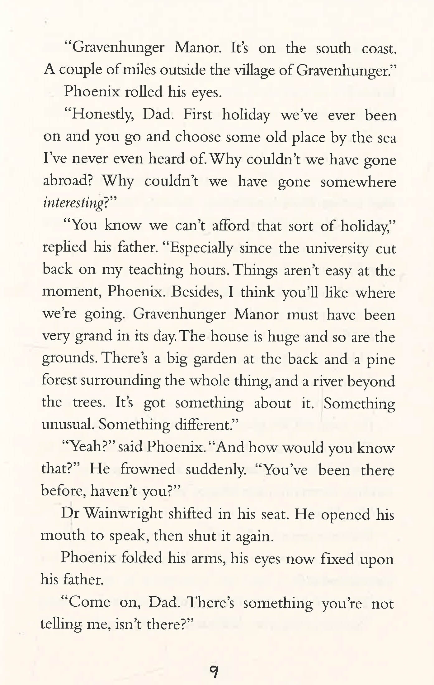Thirteen-year-old Phoenix Wainwright is not happy about spending the summer in an old house in the middle of nowhere, especially when he hears that Gravenhunger Manor used to belong to his dead mother, Elvira - a secret which she kept from Phoenix and his father during her lifetime.