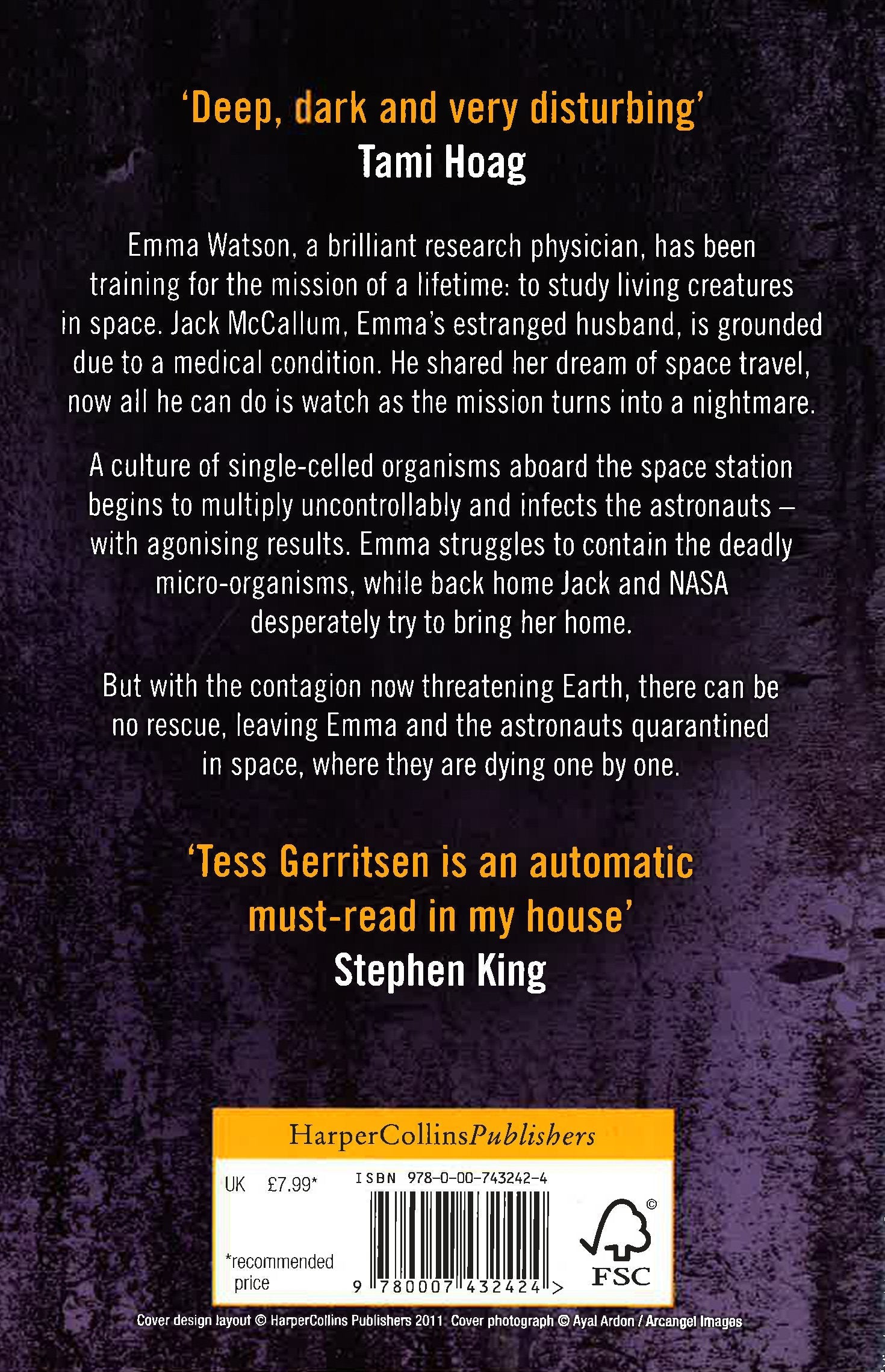 Top Ten bestselling author Tess Gerritsen delivers a thoroughly menacing new thriller. A brilliantly compulsive page-turner from the author of The Surgeon. Dr Emma Watson, a brilliant research physician, has been training for the mission of a lifetime: to study living organisms in space. Jack McCallum, Emma's estranged husband, has shared her dream of space travel, but a medical condition has grounded him. Now he must watch from the sidelines! The mission aboard the space station turns into a nightmare when a culture of single-celled organisms begins to regenerate out of control -- and infects the crew with agonising and deadly results. Emma struggles to contain the deadly virus, while back home Jack and NASA work against the clock to bring her home. But there will be no rescue, as the astronauts are left stranded in orbit where they are dying one by one!