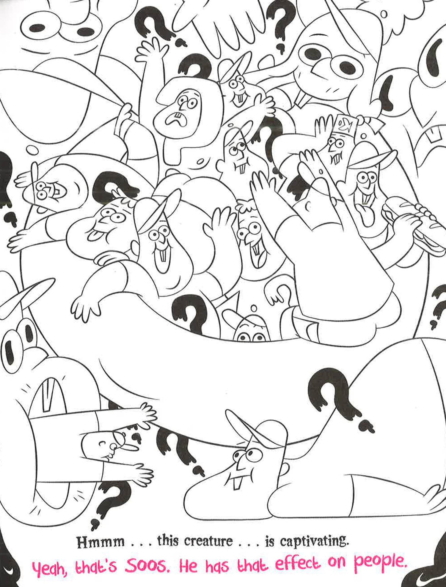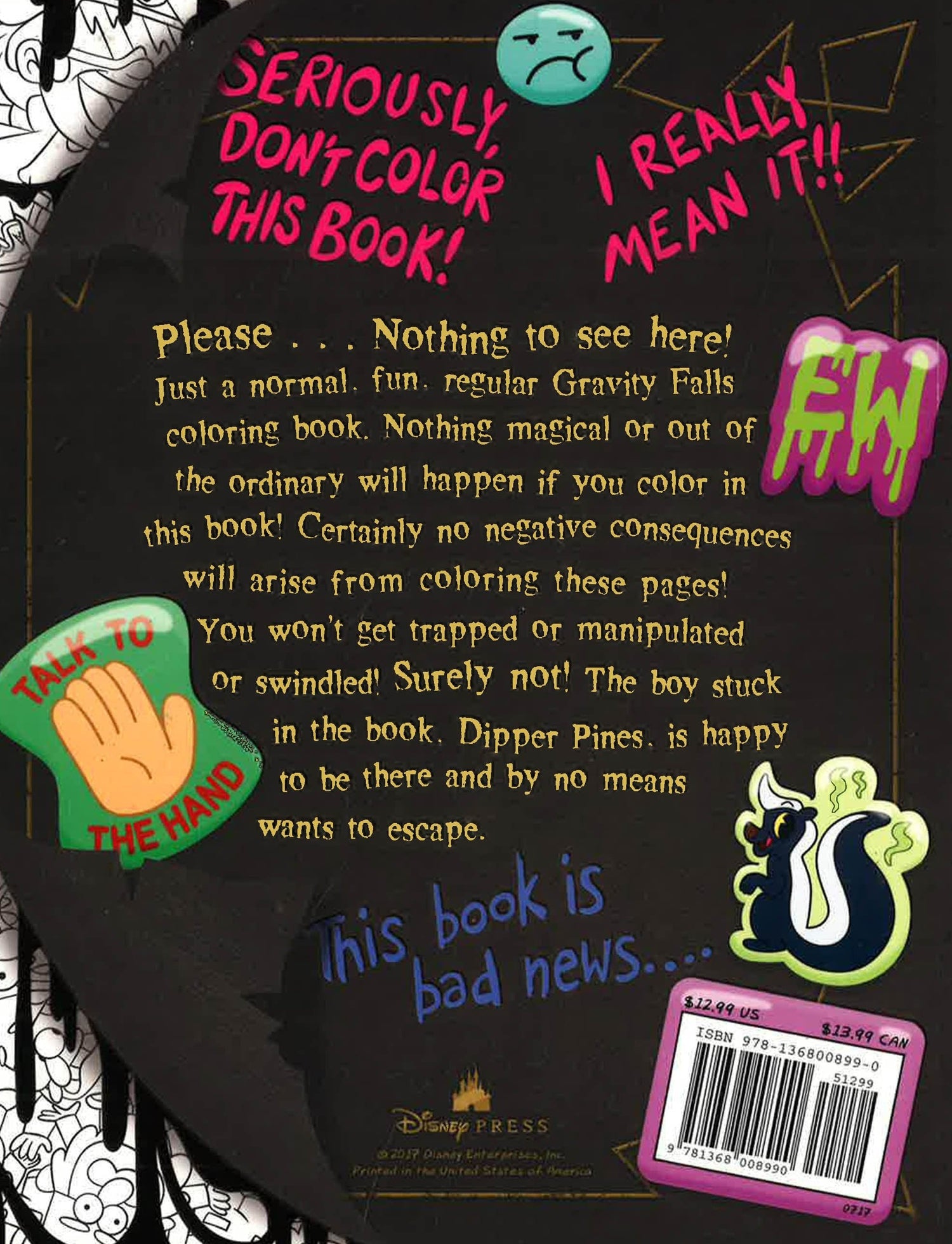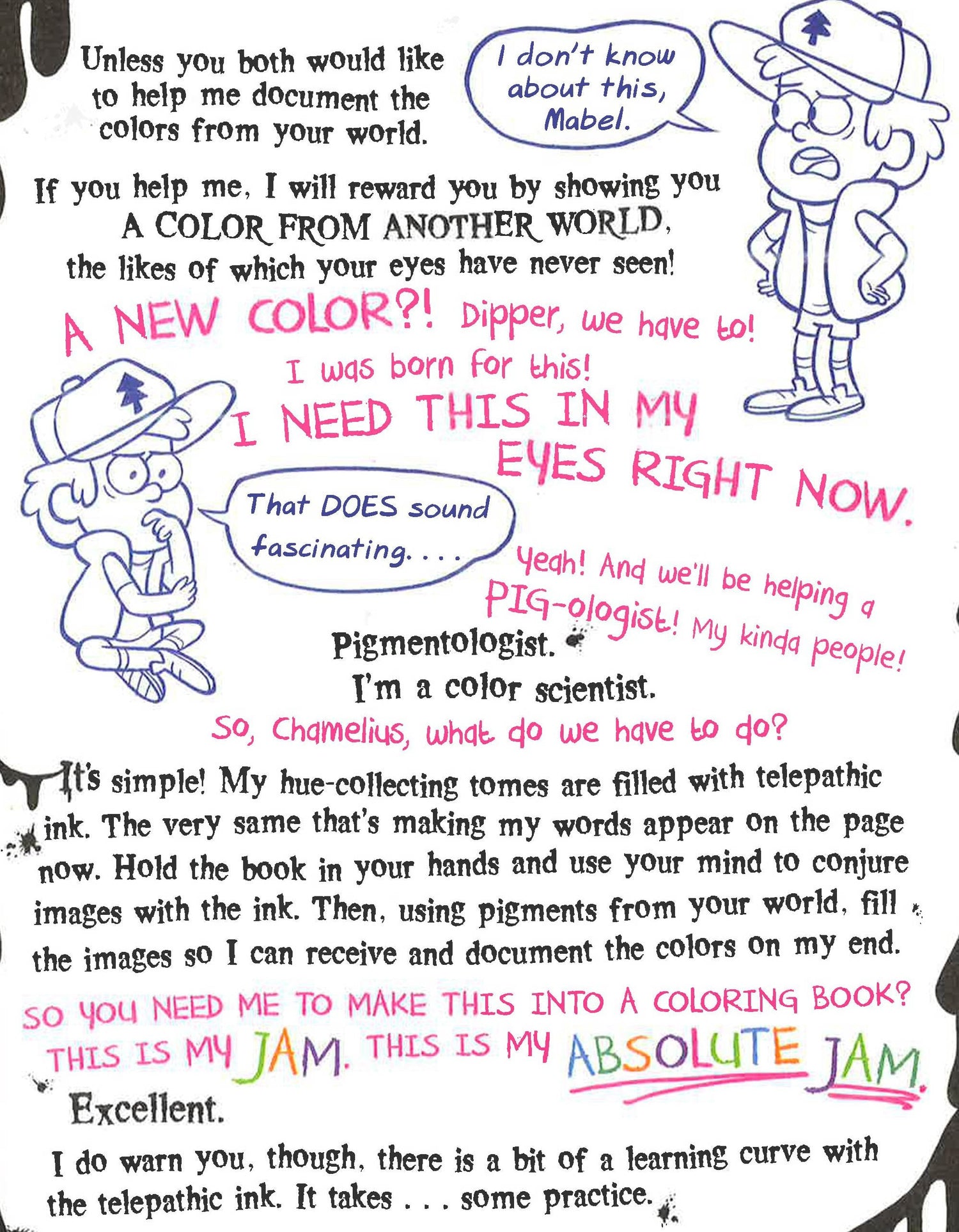 The Pines twins find themselves on a prismatic adventure when Dipper gets trapped in a magical coloring book. The only way out is for Mabel to color him to freedom with the help of a strange new friend named Chamelius Pendraggin. The more Mabel colors, however, the more things start to go awry. Can coloring be an act of bravery? Can great shading elevate you to heroic heights? Can orange save the day? Find out in this official Gravity Falls coloring book!