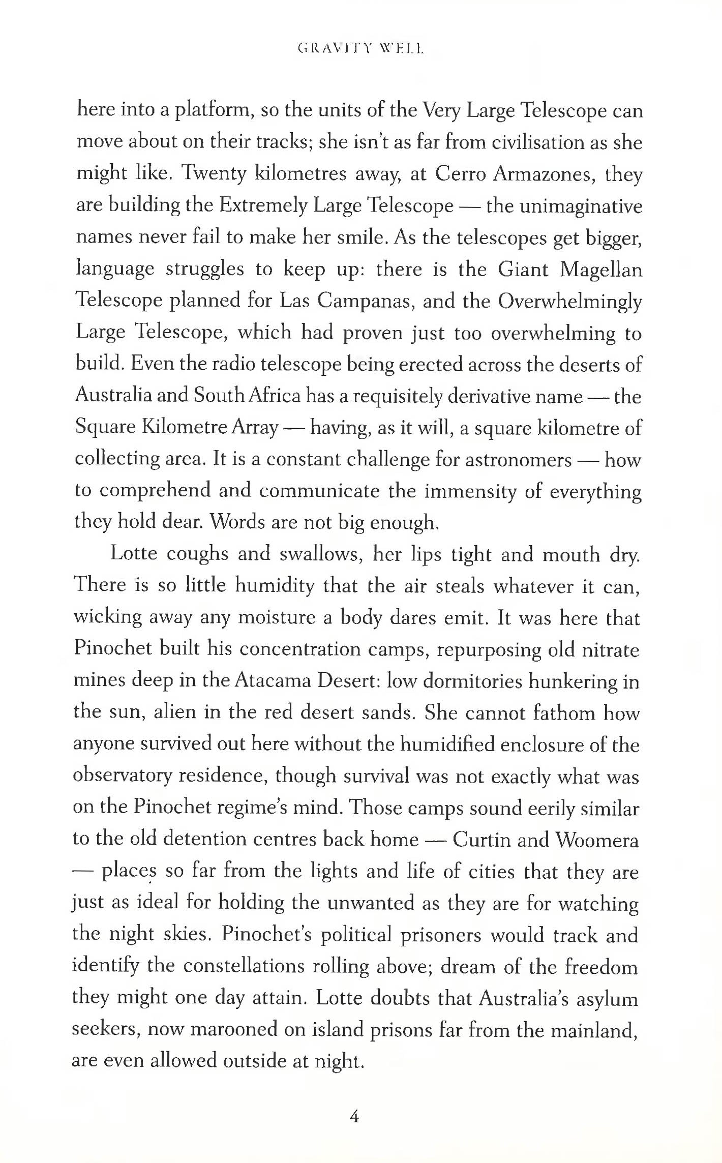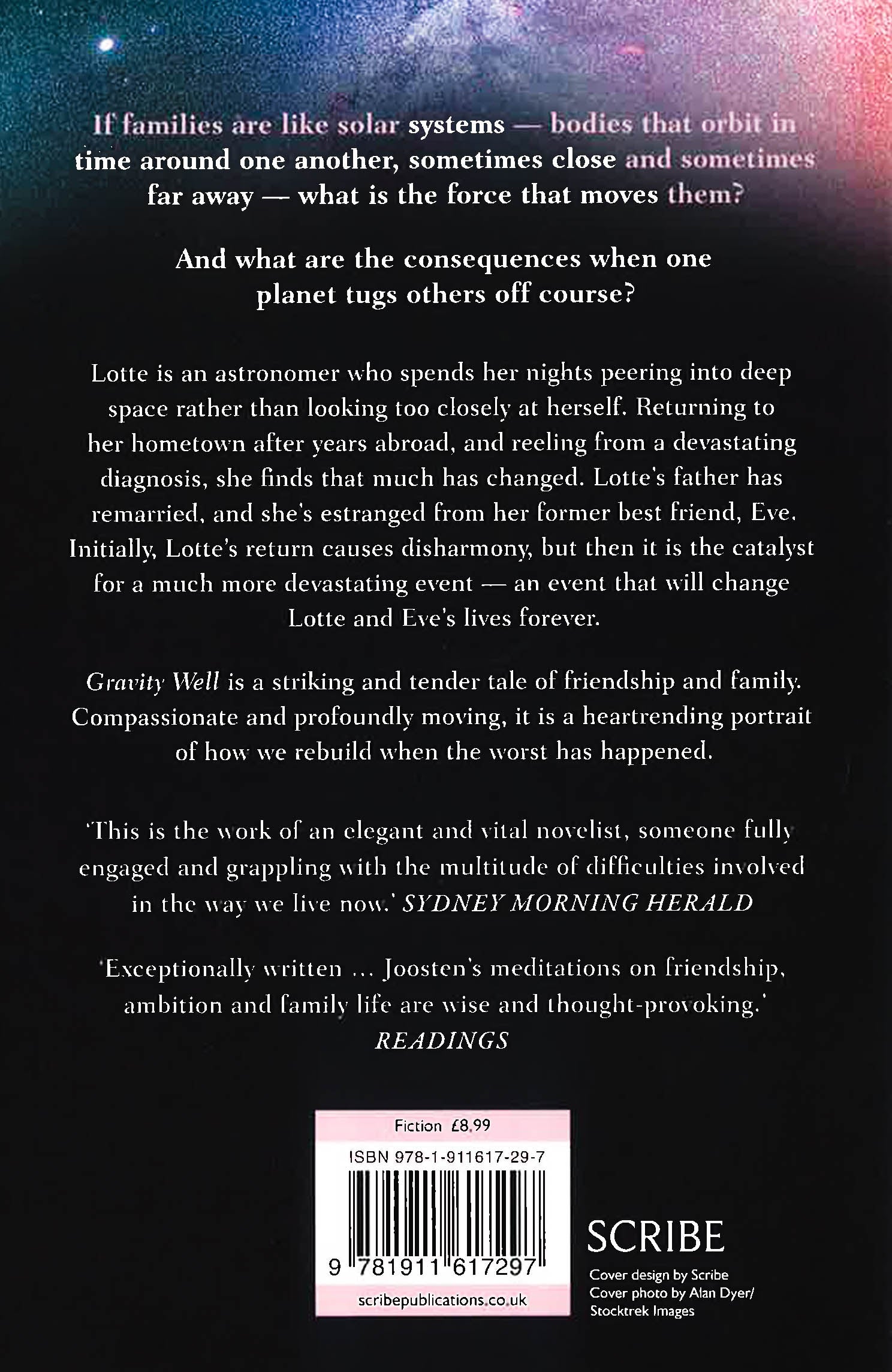 If families are like solar systems - bodies that orbit in time around one another, sometimes close and sometimes far away - what is the force that moves them? And what are the consequences when one planet tugs others off course? Lotte is an astronomer who spends her nights peering into deep space rather than looking too closely at herself. Returning to her hometown after years abroad, and reeling from a devastating diagnosis, she finds that much has changed. Lotte's father has remarried, and she's estranged from her former best friend, Eve. Initially, Lotte's return causes disharmony, but then it is the catalyst for a much more devastating event - an event that will change Lotte and Eve's lives forever. Gravity Well is a striking and tender tale of friendship and family. Compassionate and profoundly moving, it is a heartrending portrait of how we rebuild when the worst has happened.