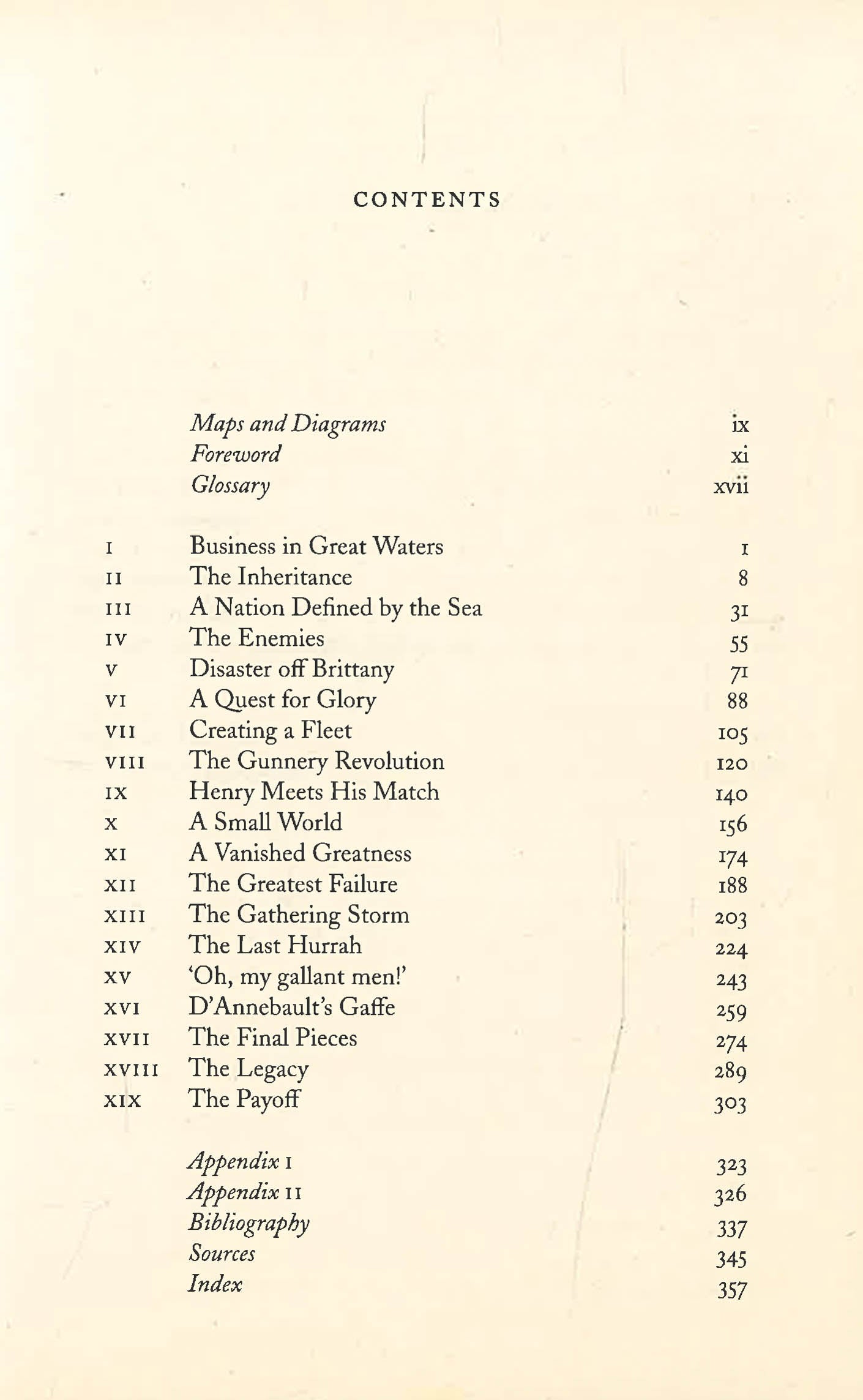 It was Henry VIII who began the process of making England a first-rate sea-power. He inherited no more than seven warships from Henry VII, yet at his own death the King's Navy had 53 seaworthy ships afloat (much the same size as the Royal Navy today) manned by almost 8,000 sailors. Henry VIII originally needed a navy to hold the English Channel and blockade the enemy while he invaded France. Later when invasion from the continent grew serious Henry's navy fought in many actions. Moorhouse doesn't only deal with seagoing exploits. Thanks to Henry VIII dockyards were built (Greenwich and Deptford), timber had to be felled in quantities previously unknown (from land seized during the dissolution of the monasteries), and hemp (for rope) was harvested; new skills were developed, not least the gun-founders and the master shipwrights. Some of the ships were celebrated - 'Henry Grace a Dieu' (aka 'Great Harry') was the biggest ship in the world - 1,000 tons, 122 guns, crew of 700 and the 'Mary Rose' (500 tons, 80 guns, 40 crew) became one of the most famous after she heeled over too far, took water and sank with the loss of almost all hands off Portsmouth.