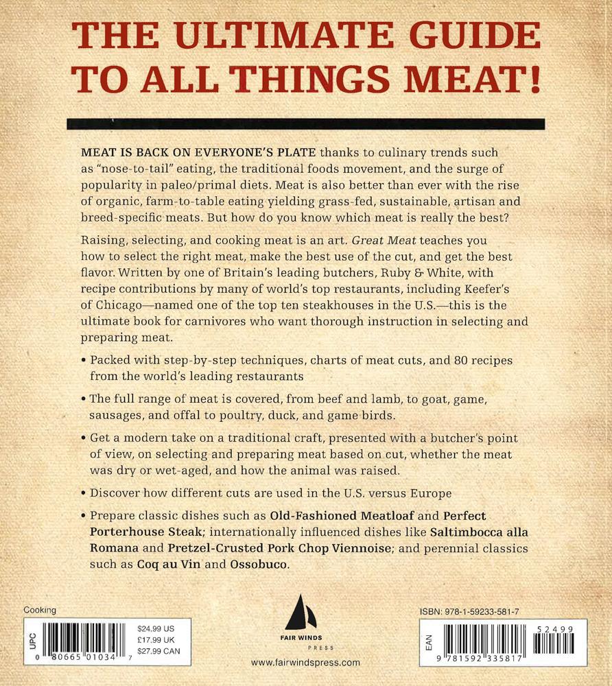 Recipes are only as good as their ingredients, especially when it comes to meat. That's why having a good understanding of how to select, cut, and cook meat makes all of the difference in the final taste. Written by Ruby & White, one of Britain's leading butcher shops, Great Meat debunks myths and misinformation around selecting and cooking meat and offers up valuable information to meat lovers and serious home cooks who want to learn new and different preparation techniques. This go-to guide to meat takes you through the technical aspects of meat, while providing recipes along the way that will help you try out your newfound techniques. Learn how to identify and use different cuts, why and when free-range and grass-fed is better, the basics of home butchery, and much more. Great Meat is filled with photos and diagrams showing where different cuts of meat come from, their corresponding preparation techniques, and recipes from the leading chefs and restaurants in Britain.