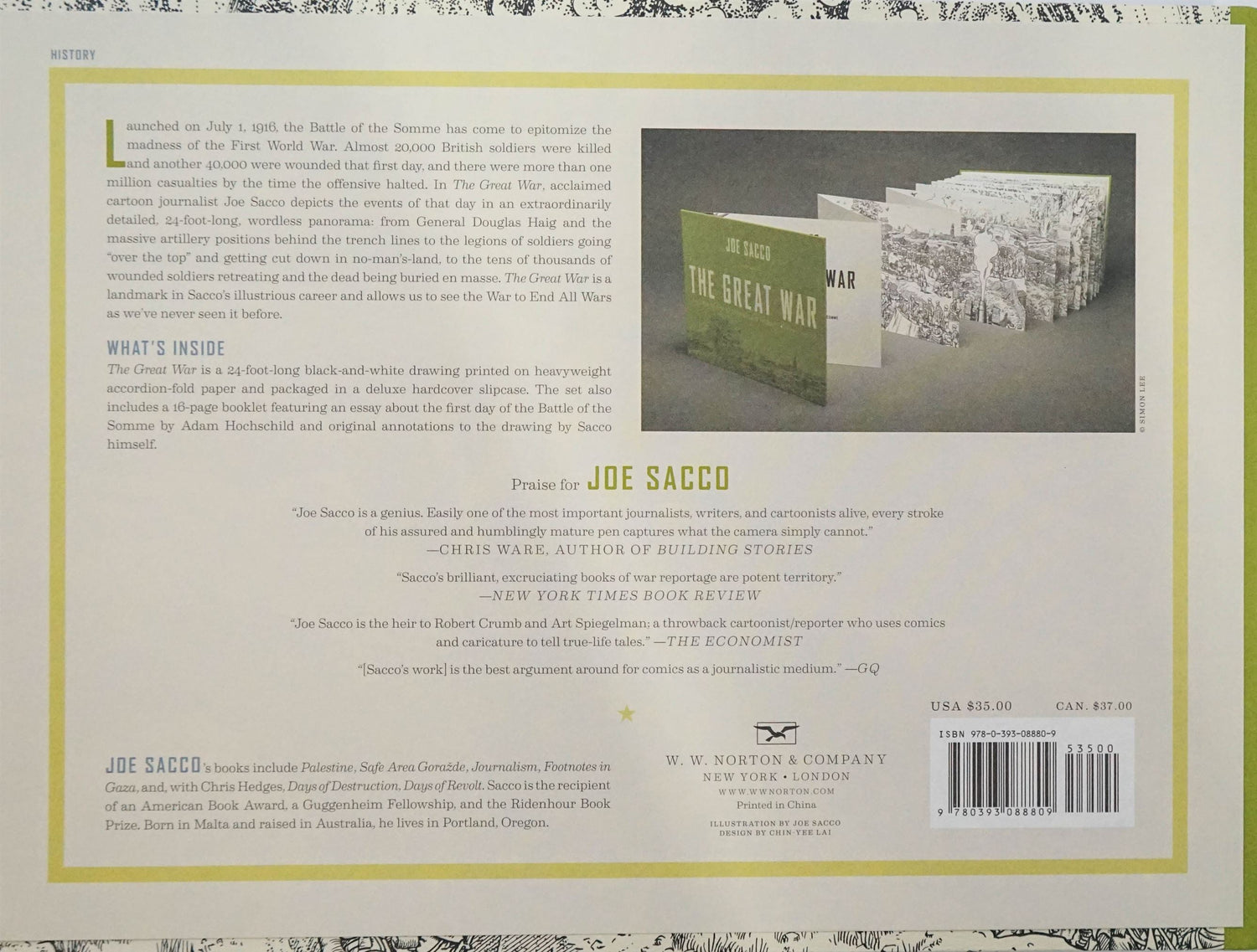 Launched on July 1, 1916, the Battle of the Somme has come to epitomize the madness of the First World War. Almost 20,000 British soldiers were killed and another 40,000 were wounded that first day, and there were more than one million casualties by the time the offensive halted. In The Great War, acclaimed cartoon journalist Joe Sacco depicts the events of that day in an extraordinary, 24-foot- long panorama: from General Douglas Haig and the massive artillery positions behind the trench lines to the legions of soldiers going over the top and getting cut down in no-mans-land, to the tens of thousands of wounded soldiers retreating and the dead being buried en masse. Printed on fine accordion-fold paper and packaged in a deluxe slipcase with a 16-page booklet, The Great War is a landmark in Saccos illustrious career and allows us to see the War to End All Wars as weve never seen it before.