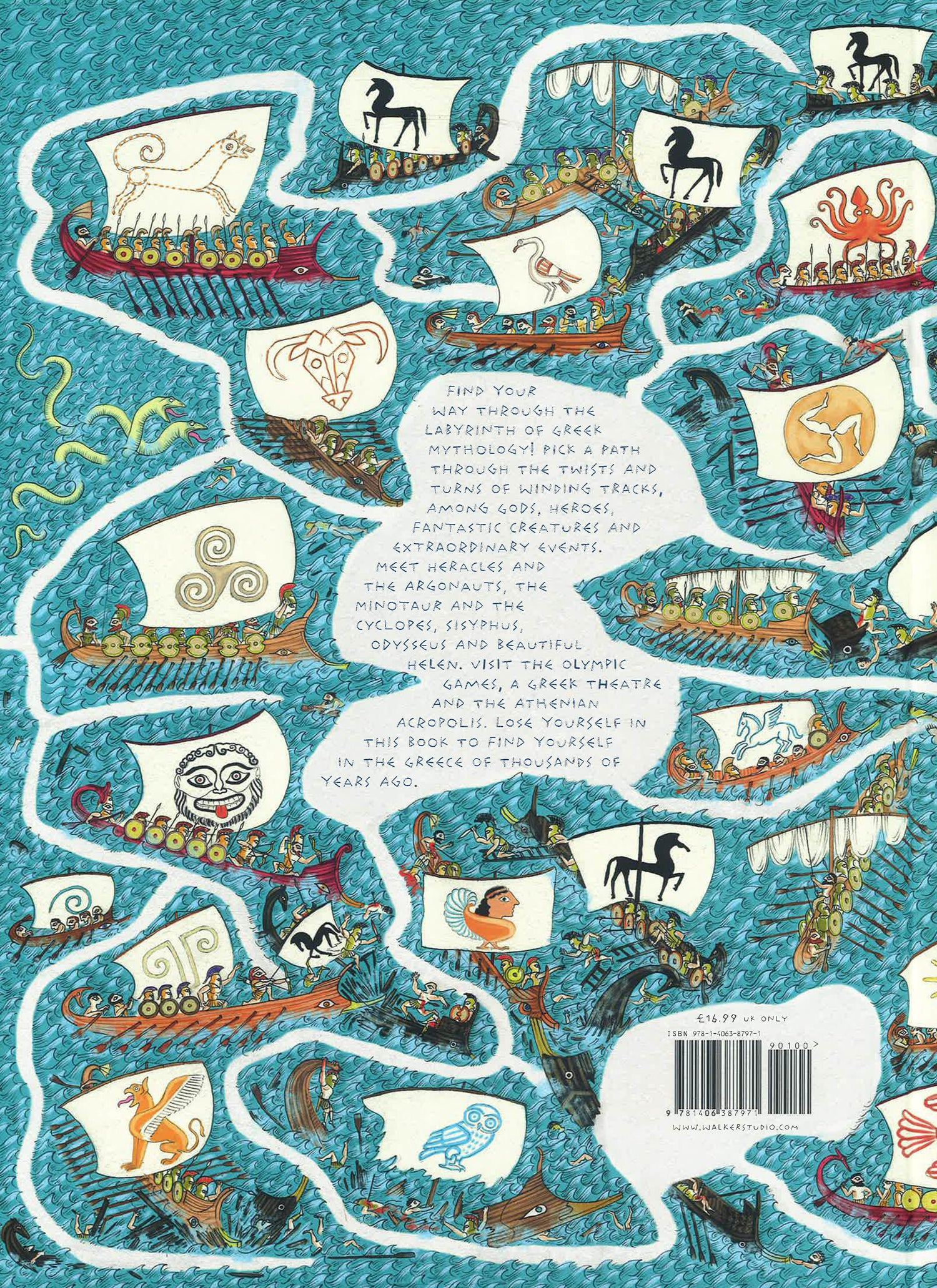 A fascinating collection of labyrinths and puzzles set in Ancient Greece. Find your way out of a maze on each page in this stunningly intricate book from the creators of Maps.Discover the legendary labyrinths of Ancient Greece, as well as the myths and stories that have captured readers for thousands of years, in this beautifully illustrated collection of puzzles and facts. From an Ancient Greek theatre, to the Trojan horse and the Minotaur, the book is packed full of history and mythology, and will astound readers of all ages.
