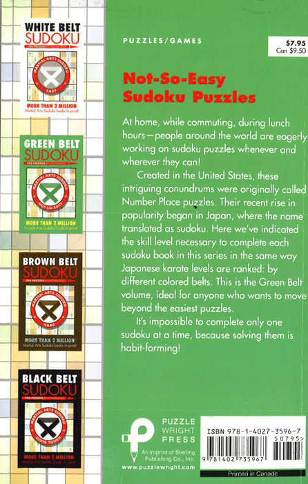 With a separate sudoku book for every level, all puzzle lovers can play this wildly popular, incredibly addictive game that's appearing in major newspapers all over! Taking a page from karate - another Japanese art - each title is graded by colour: White Belt for easy, Green Belt for medium level, Brown Belt for hard, and Black Belt for the super-tough solvers. And because each book has an amazing 300 puzzles, the fun can go on for hours.