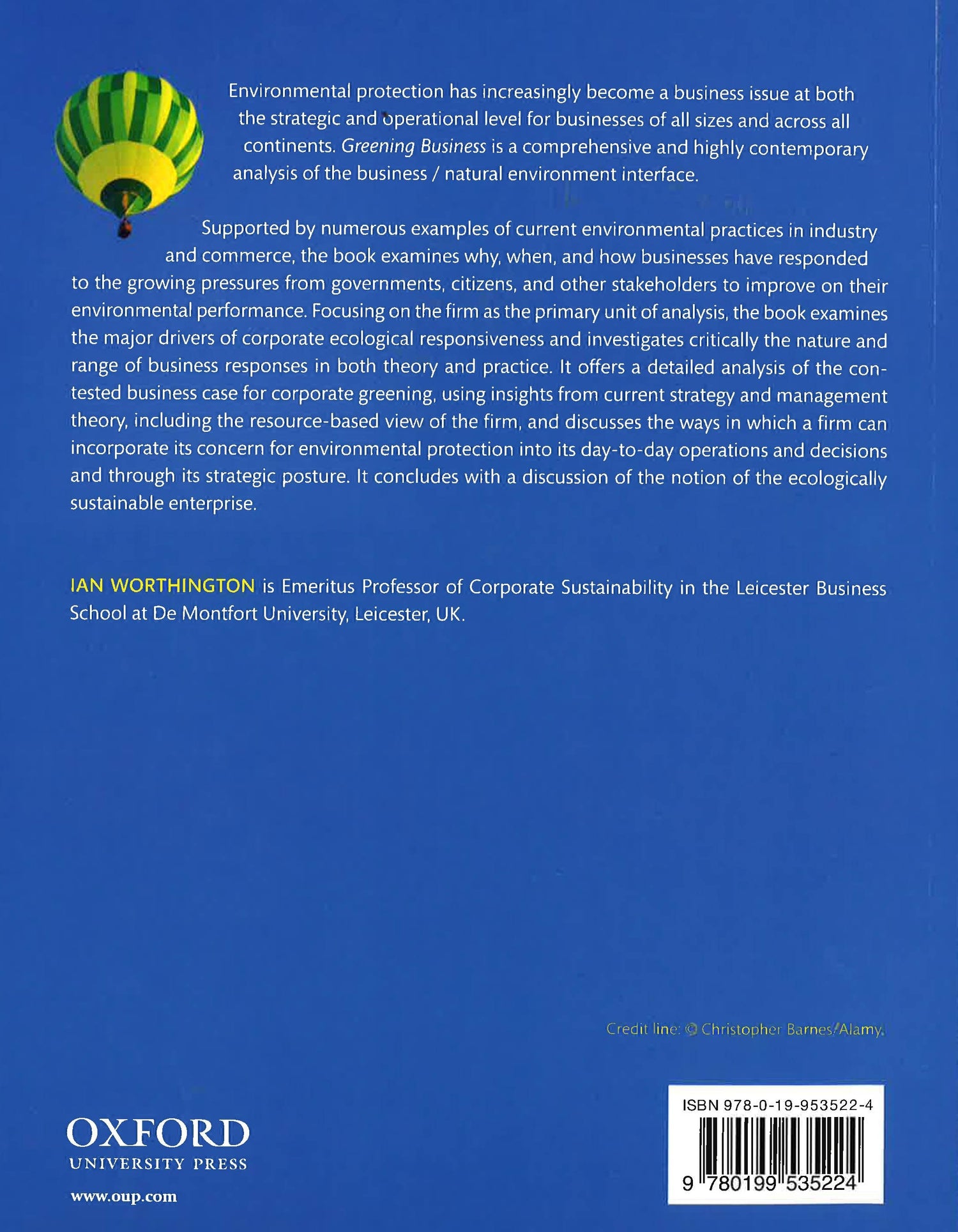 Environmental protection has increasingly become a business issue at both the strategic and operational level for businesses of all sizes and across all continents. Greening Business is a comprehensive and highly contemporary analysis of the business/natural environment interface.