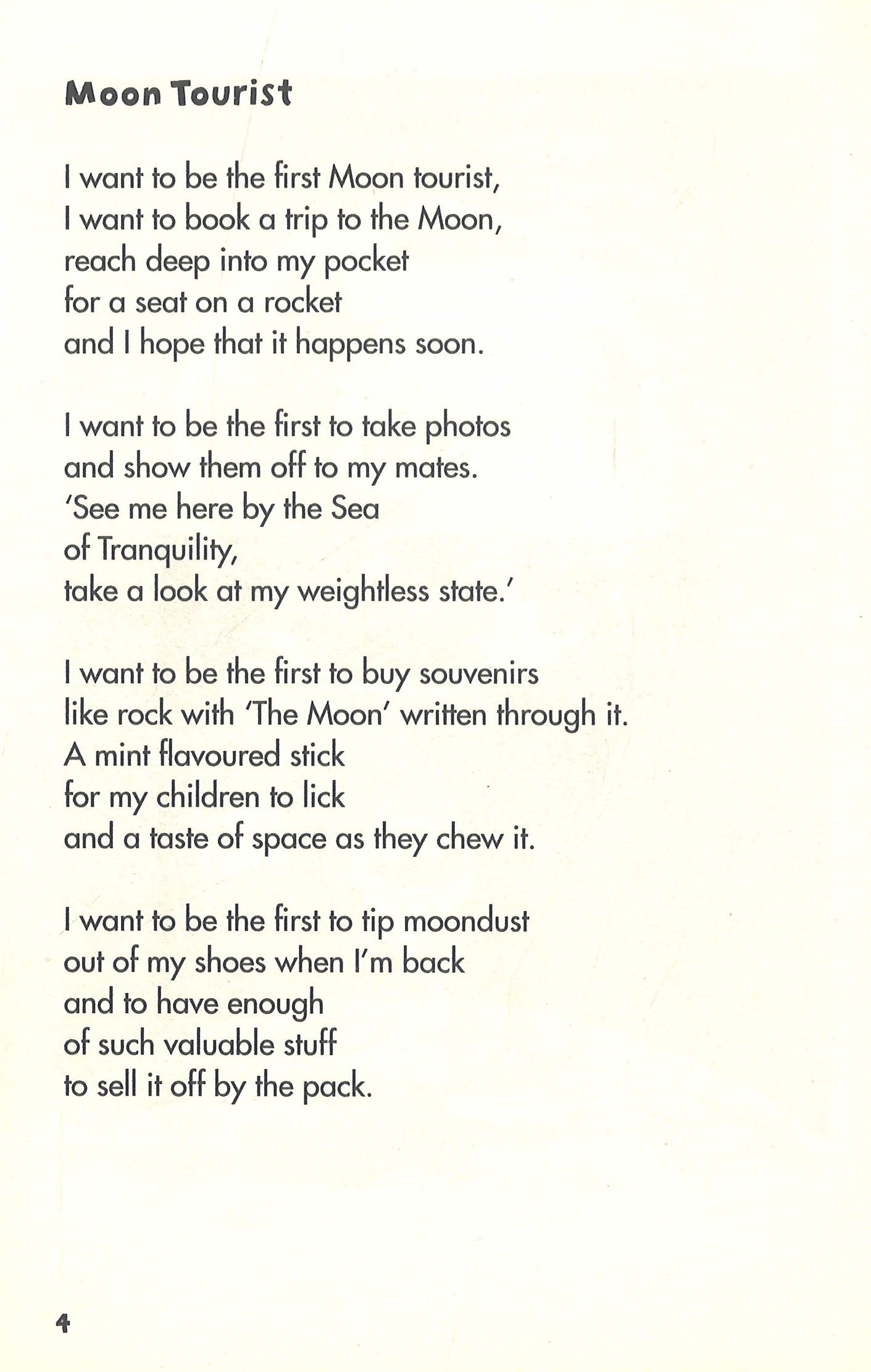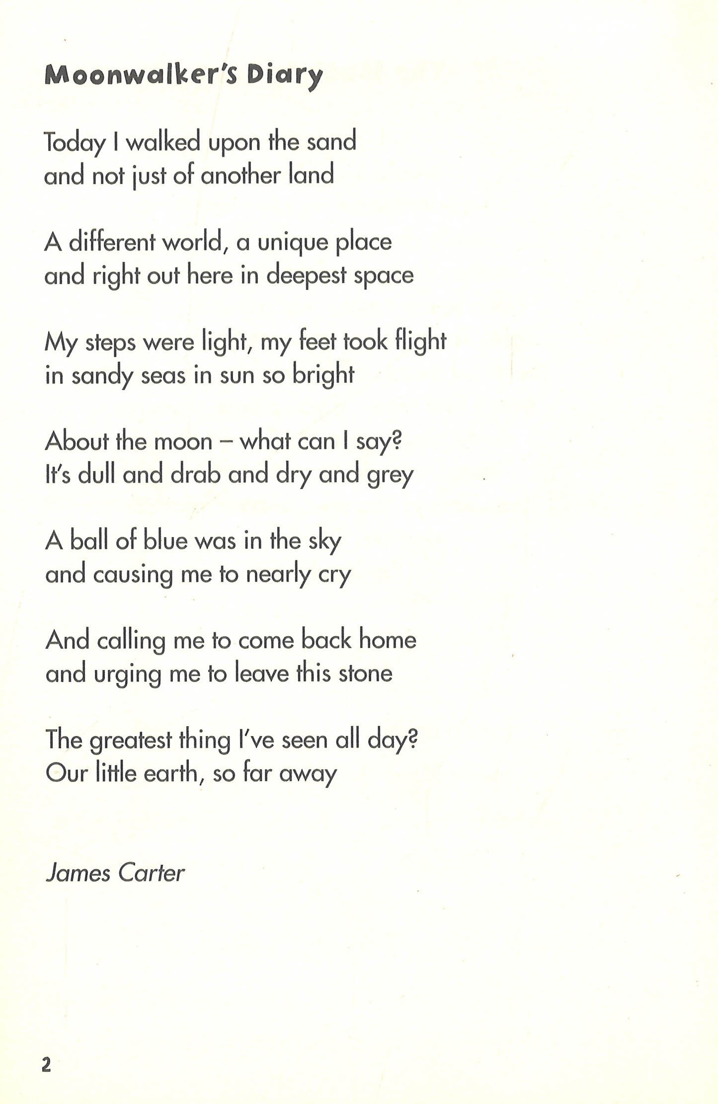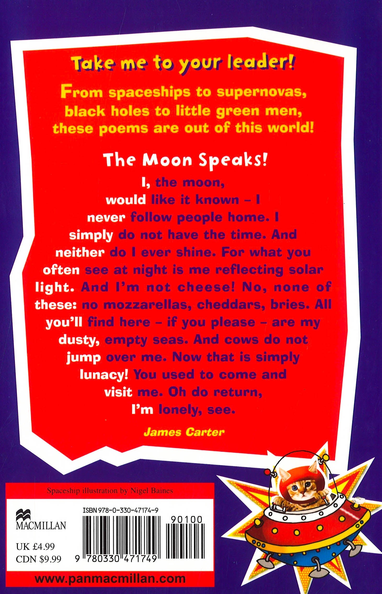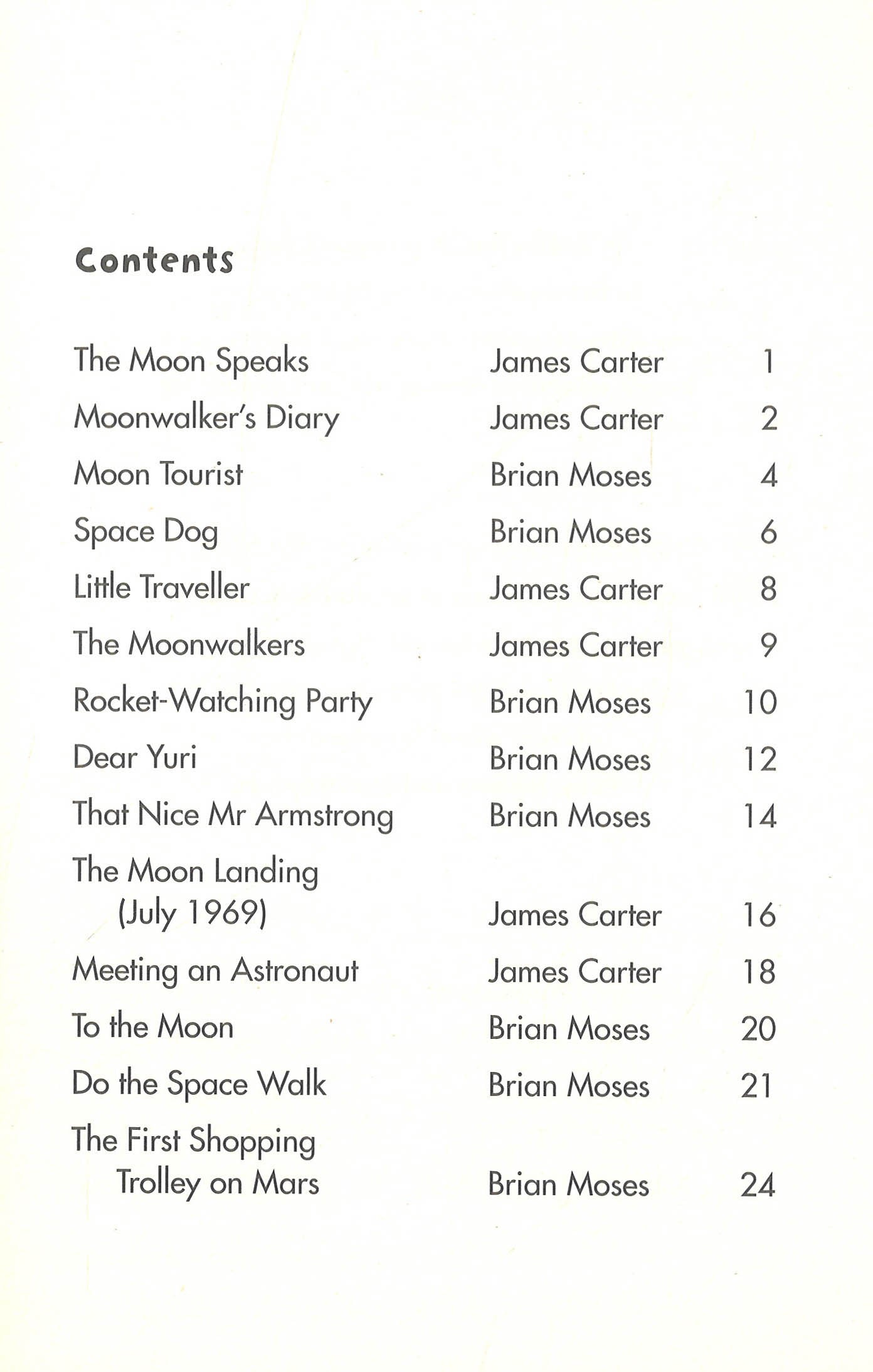 TAKE ME TO YOUR LEADER!I, the moon, would like it known - I never follow people home. I simply do not have the time. And neither do I ever shine. For what you often see at night is me reflecting solar light. And I'm not cheese! No, none of these: no mozzarellas, cheddars, bries, all you'll find here - if you please - are my dusty, empty seas. And cows do not jump over me. Now that is simply lunacy! You used to come and visit me. Oh do return, I'm lonely, see. James CarterJames Carter lives in Oxfordshire with his wife and two daughters. His poems have been published in dozens of anthologies and in his first collection Stars, Cars and Electric Guitars. He spends a lot of his time visiting schools where he perform his poems and plays his guitar.