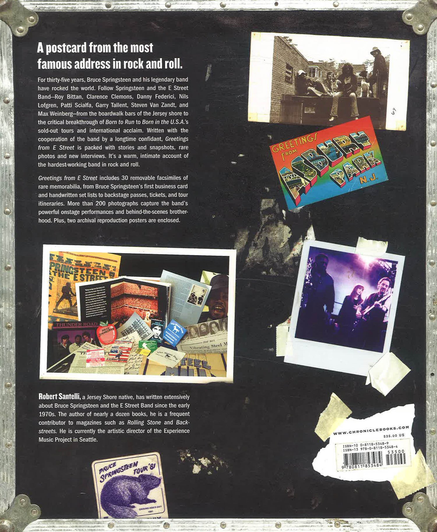 "Greetings from E Street" celebrates the passionately loved group that has been entertaining the world for 35 years. Written with their cooperation, this fully illustrated informal biography combines rare photographs with 30 removable facsimiles of E Street memorabilia, including Bruce Springsteen's first business card and hand-written set list, and even two fabulous posters. Longtime band intimate Robert Santelli captures the ecstatic highs and devastating lows on the E Street Band's roller coaster ride to stardom. He follows the band from the early days in Asbury Park, New Jersey, to the critical acclaim of "Born to Run," the mania of "Born in the U.S.A." and international touring, and each member's unique projects. Throughout, the band's signature combination of friendship, humor, and stellar musicianship is revealed in stories, snapshots, and the ephemera of life of the road. Warm and personal, "Greetings from E Street" is a postcard from the most famous address in rock and roll.