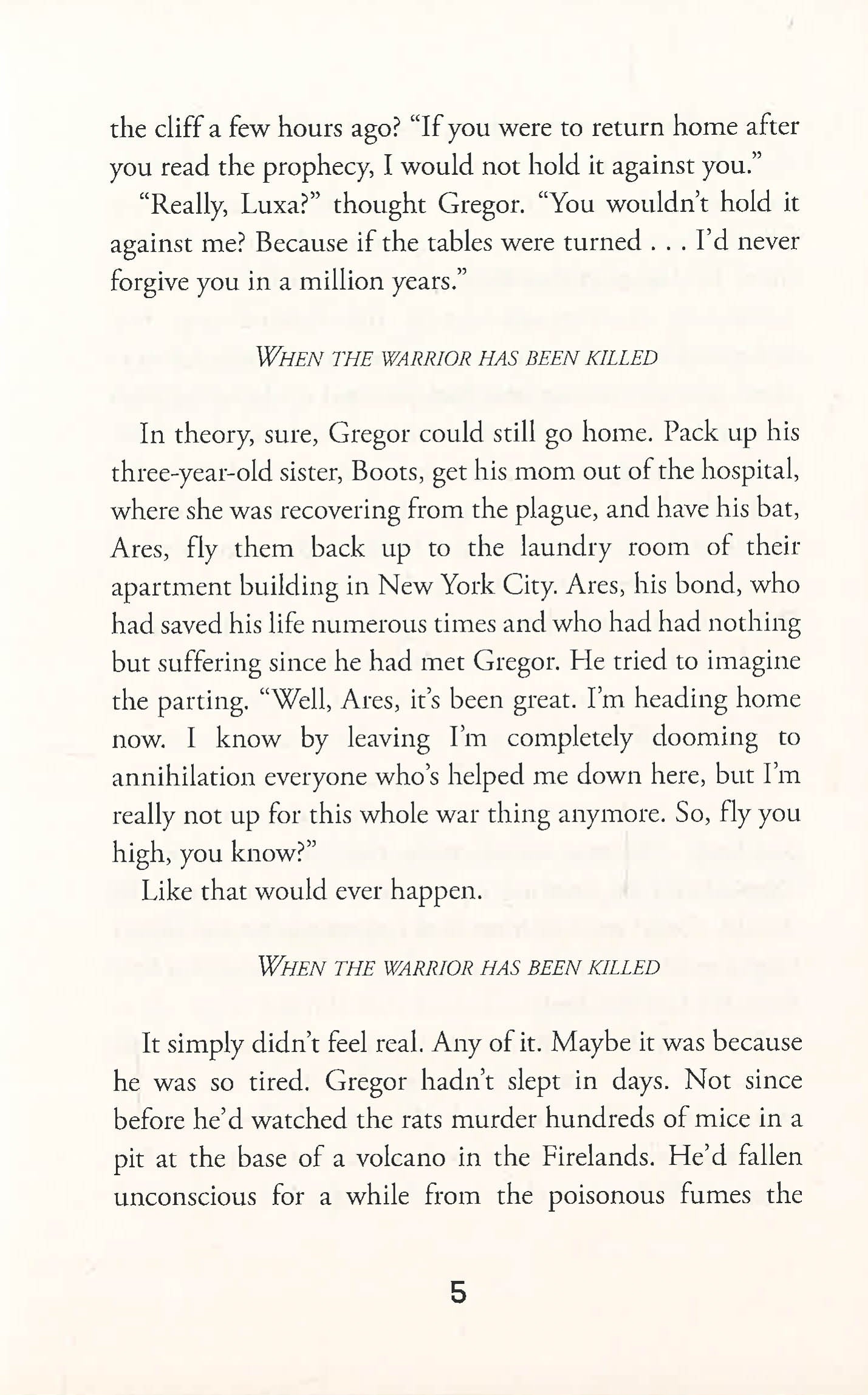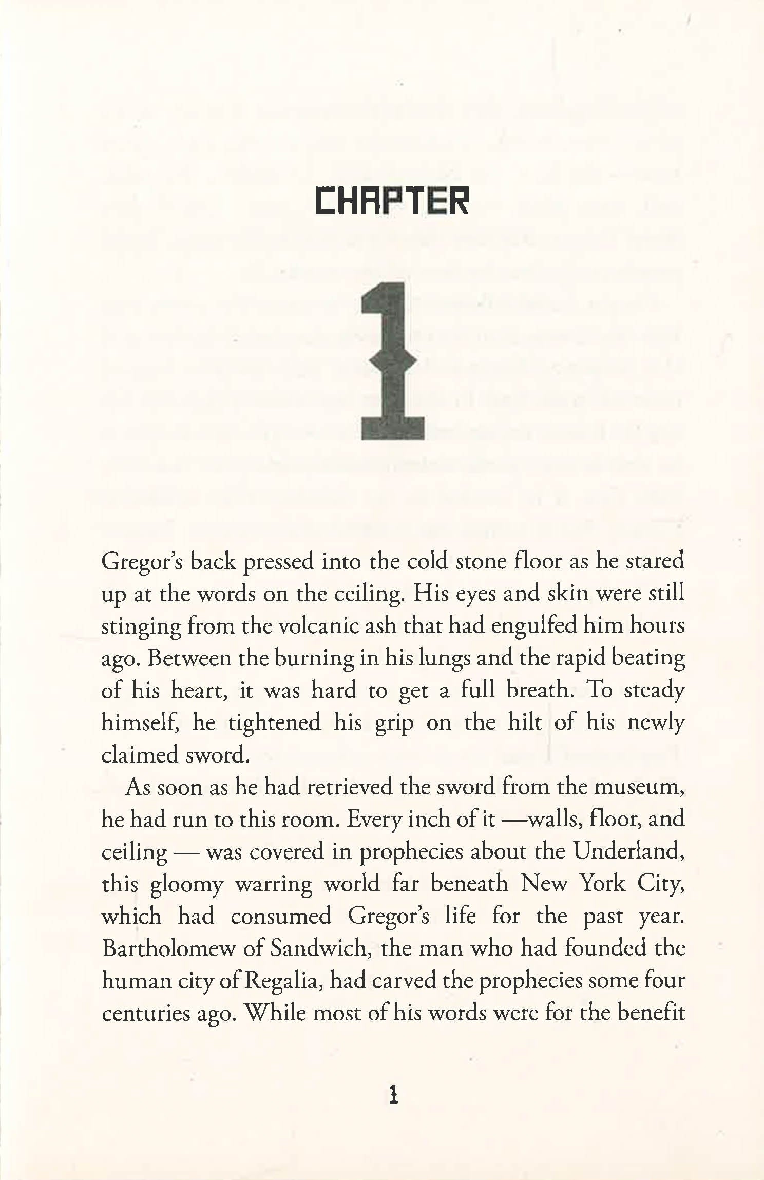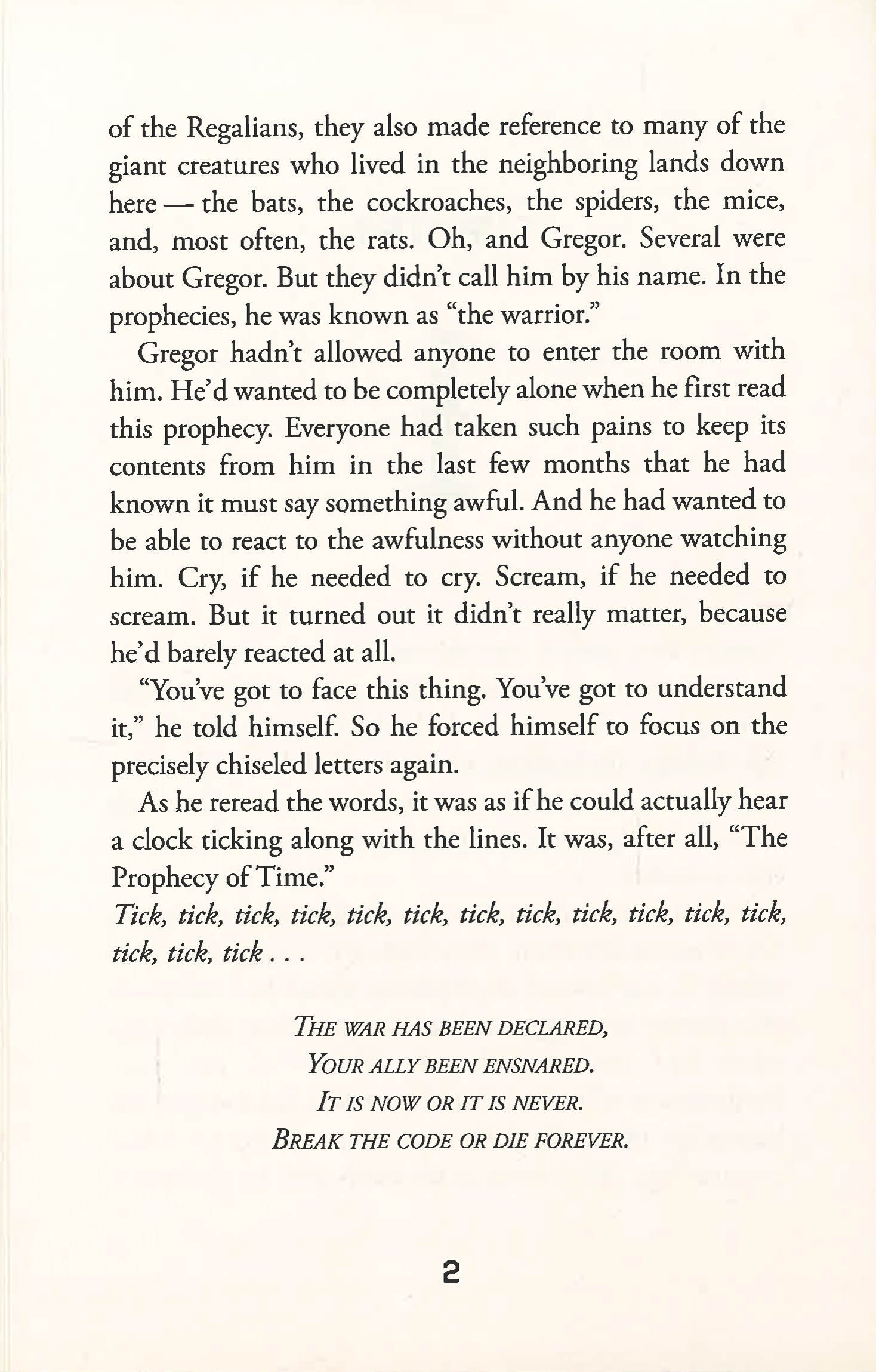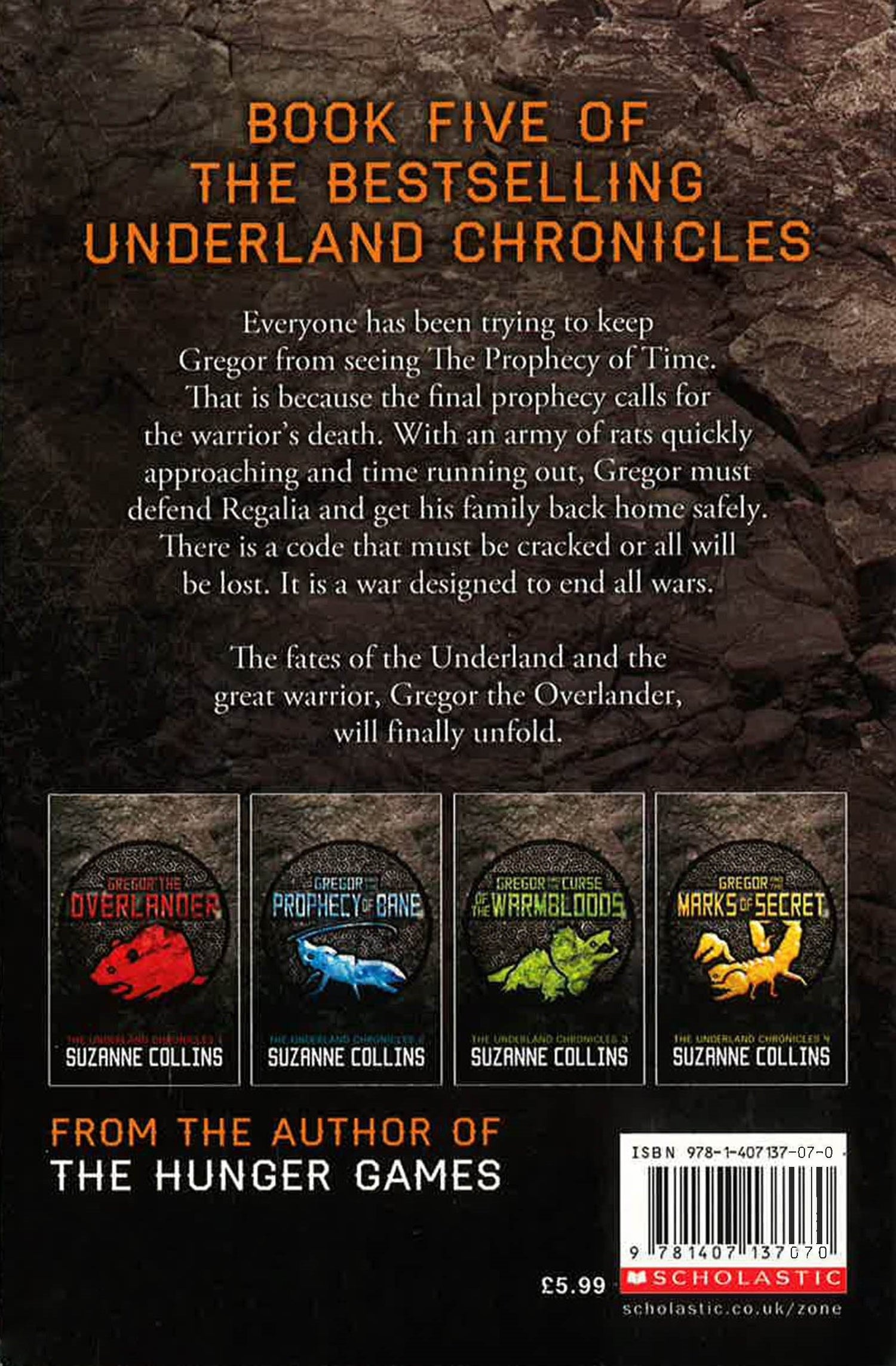 The stunning conclusion to the riveting Gregor the Overlander series. Everyone in the Underland has been taking great pains to keep The Prophecy of Time from Gregor. Gregor knows it must say something awful but he never imagined just how awful: it calls for the warrior's death. Now, with an army of rats approaching, and his mum and sister still in Regalia, Gregor the warrior must gather up his courage to help defend Regalia and get his family home safely. The entire existence of the Underland is in Gregor's hands, and time is running out. There is a code to be cracked, a mysterious new princess, Gregor's burgeoning dark side, and a war to end all wars.