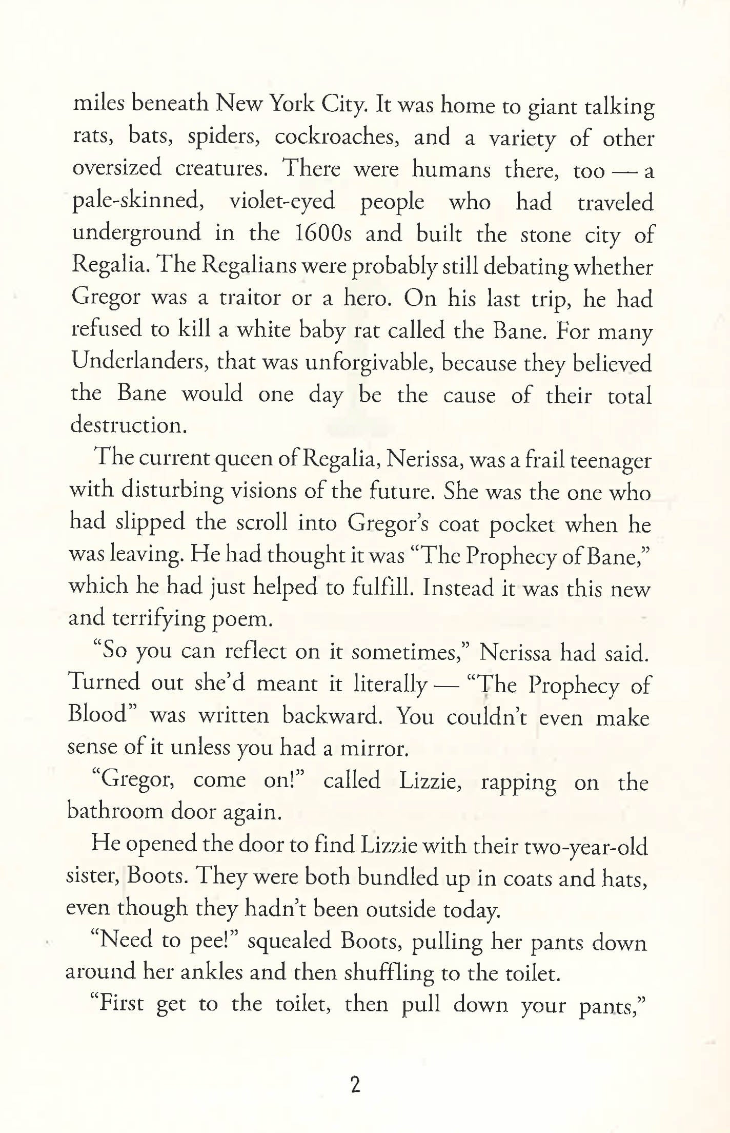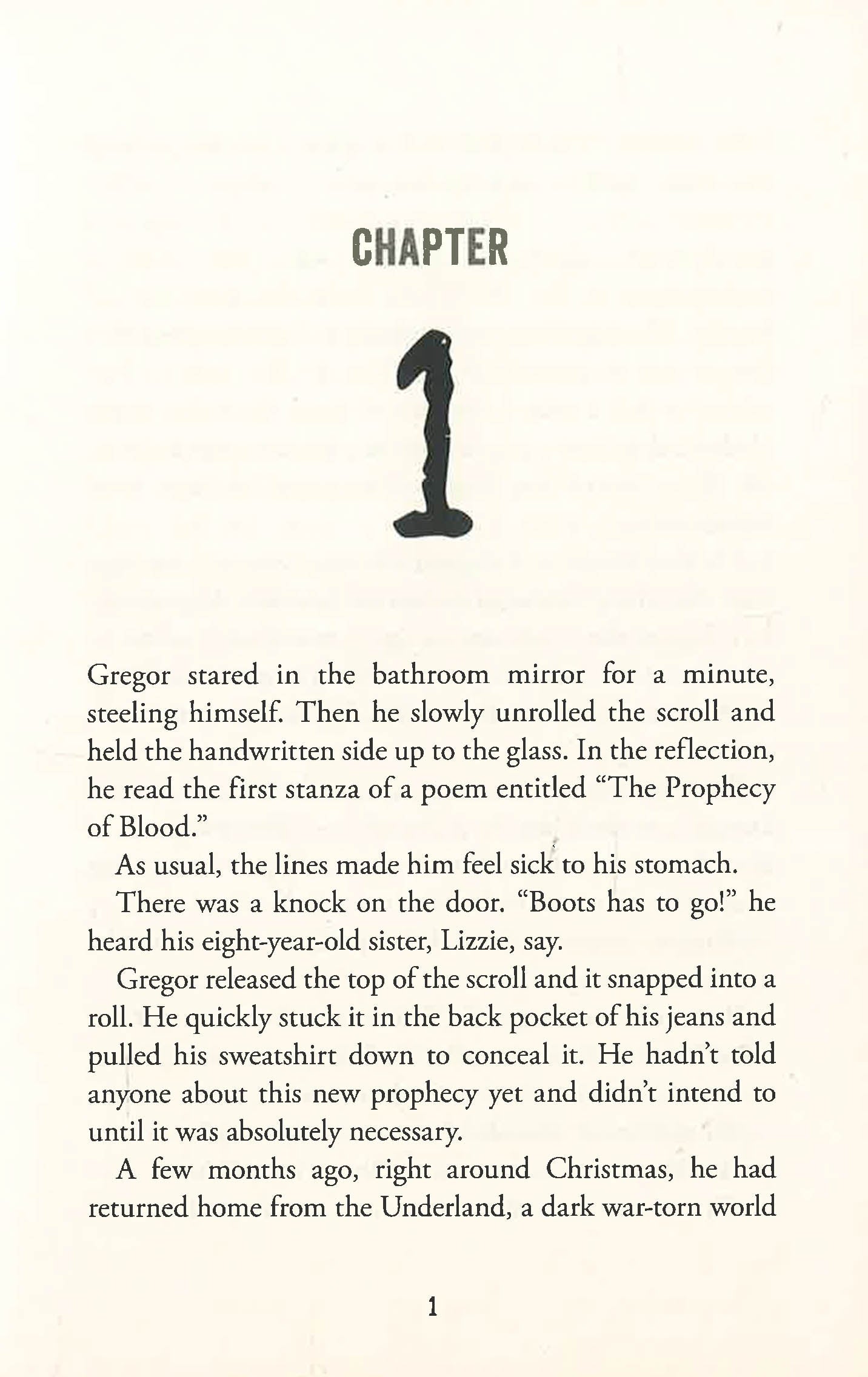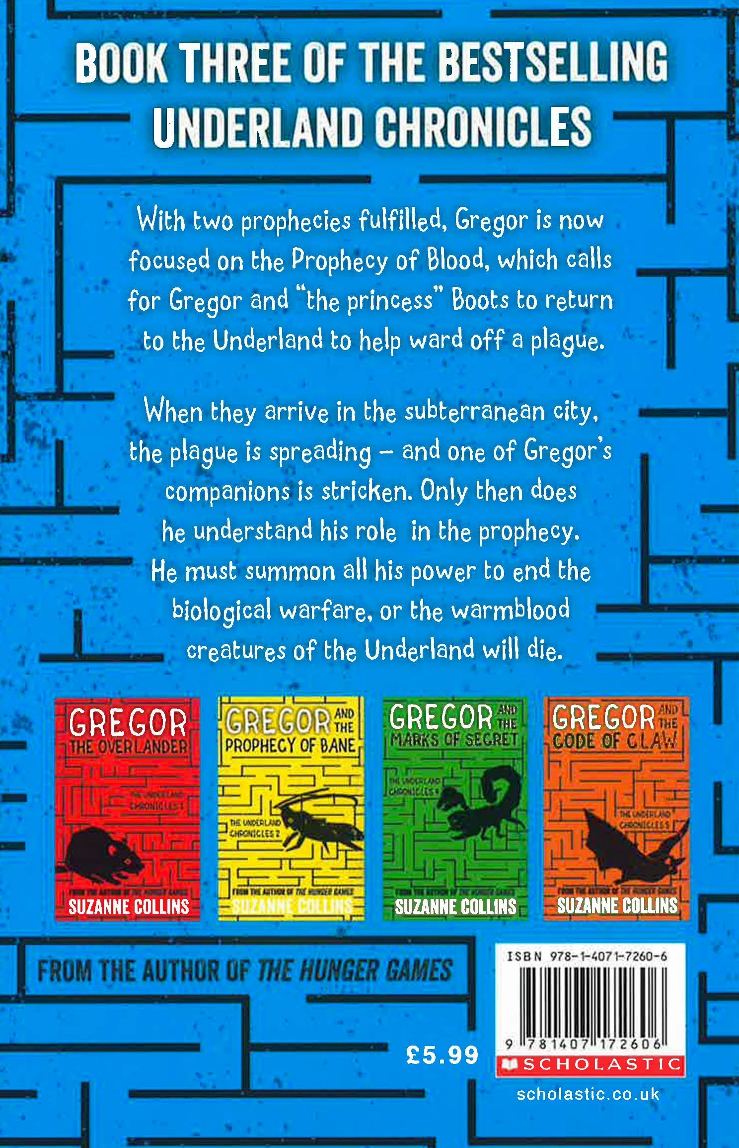The third in a gripping young fantasy series from the author of THE HUNGER GAMES. Gregor and Boots must return to the Underland to help ward off a plague. It is spreading fast, and when it claims one of Gregor's family, he begins to truly understand his role in the Prophecy of Blood. Gregor must summon all his power to end the biological warfare that threatens the fate of every warmblooded creature.