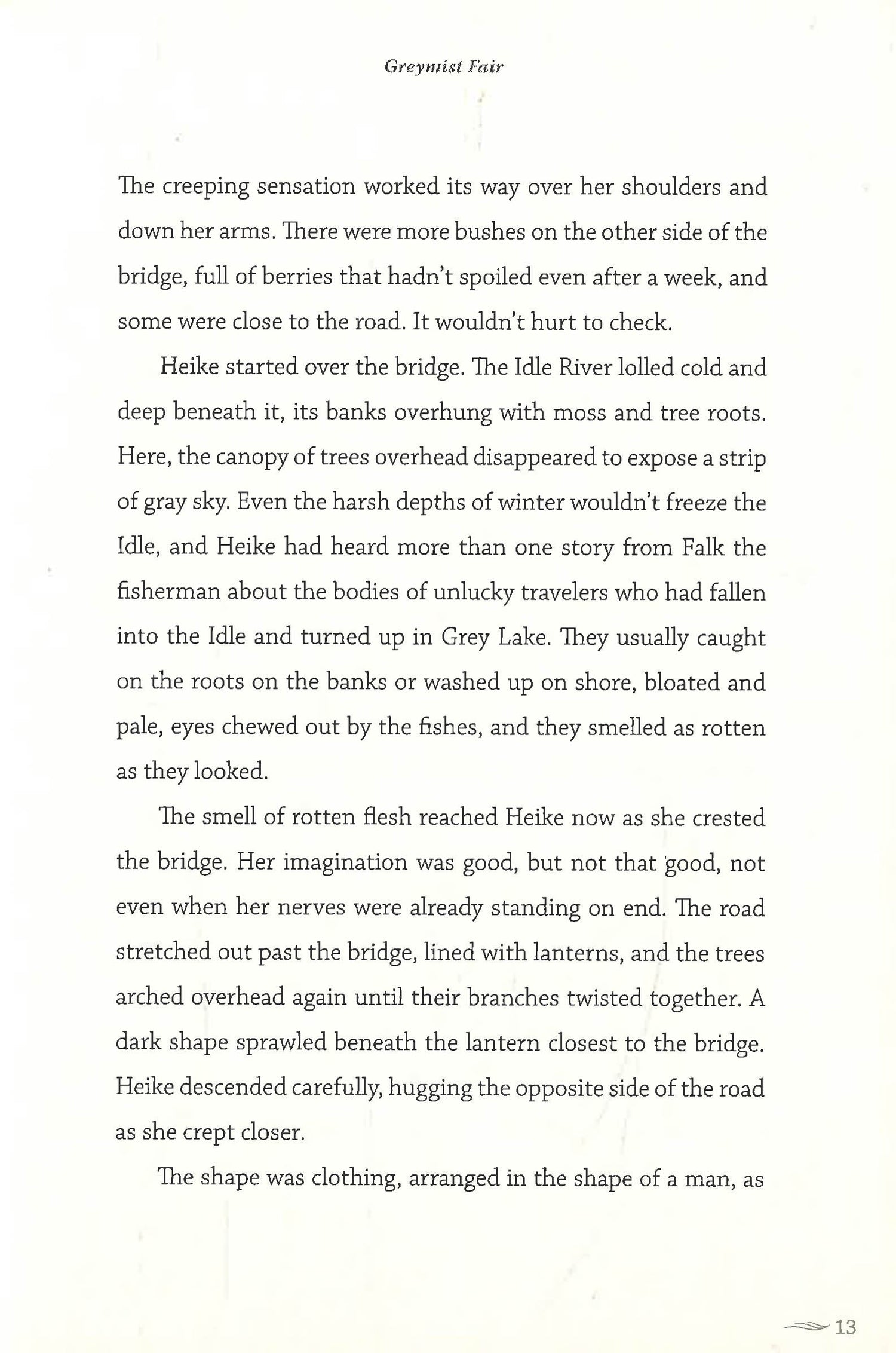 When Heike, the village’s young tailor, discovers a body on the road, she goes looking for who is responsible. But her quest only leads to more strange happenings around Greymist Fair.