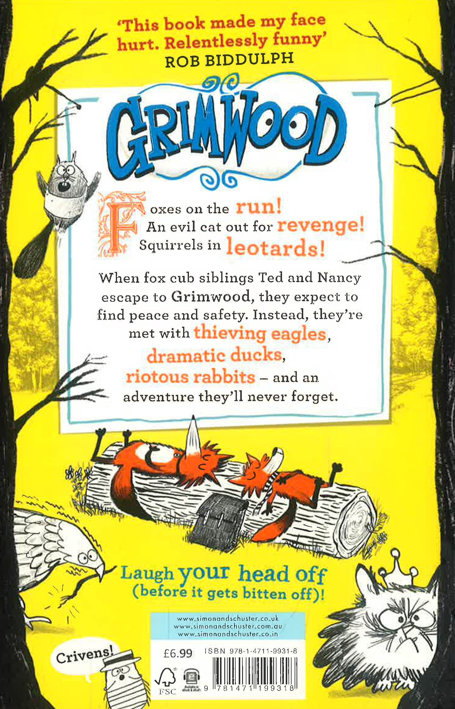 Fox cub siblings Ted and Nancy are on the run from Princess Buttons, the scariest street cat in the Big City. They flee for Grimwood, expecting to find refuge in the peaceful countryside. Instead, they are met with thieving eagles, dramatic ducks, riotous rabbits and a whole host of unusual characters. Grimwood is . . . weird. But when Princess Buttons tracks them down, Nancy and Ted and the animals of Grimwood must unite in a mind-bending race against time . . .