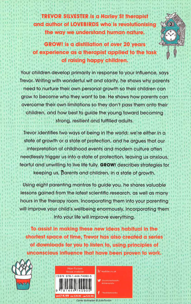 Personal development for parents Trevor Silvester is a Harley Street therapist and author of Lovebirds who is revolutionising the way we understand human nature.Grow! is a distillation of over 20 years of experience as a therapist applied to the task of raising happy children.Your children develop primarily in response to your influence, says Trevor. Writing with wonderful wit and clarity, he shows why parents need to nurture their own personal growth so their children can grow to become who they want to be. He shows how parents can overcome their own limitations so they don't pass them onto their children, and how best to guide the young toward becoming strong, resilient and fulfilled adults.Trevor identifies two ways of being in the world; we're either in a state of growth or a state of protection, and he argues that our interpretation of childhood events, and modern culture, often needlessly trigger us into a state of protection, leaving us anxious, fearful and unwilling to live life fully. Grow! describes strategies for keeping us, parents and children, in a state of growth.Using eight parenting mantras to guide you, he shares valuable lessons gained from the latest scientific research, as well as many hours in the therapy room. Incorporating them into your parenting will improve your child's wellbeing enormously. Incorporating them into your life will improve everything.To assist in making these new ideas habitual in the shortest space of time, Trevor has also created a series of downloads for you to listen to, using principles of unconscious influence that have been proven to work.