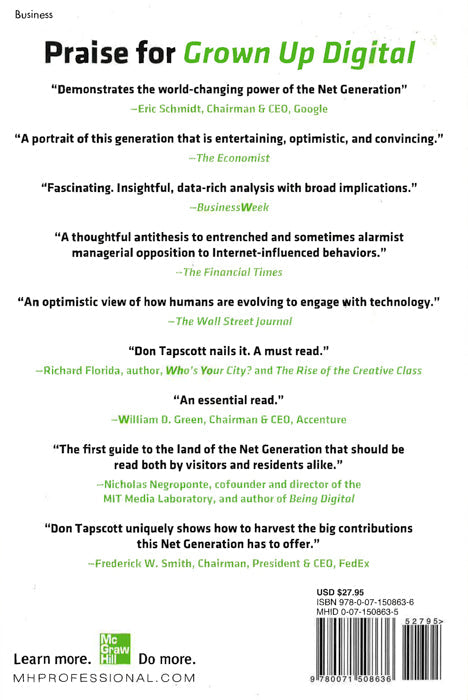 A fascinating inside look at the Net Generation, Grown Up Digital is inspired by a $4 million private research study. New York Times bestselling author Don Tapscott has surveyed more than 11,000 young people. Instead of a bunch of spoiled "screenagers" with short attention spans and zero social skills, he discovered a remarkably bright community which has developed revolutionary new ways of thinking, interacting, working, and socializing.