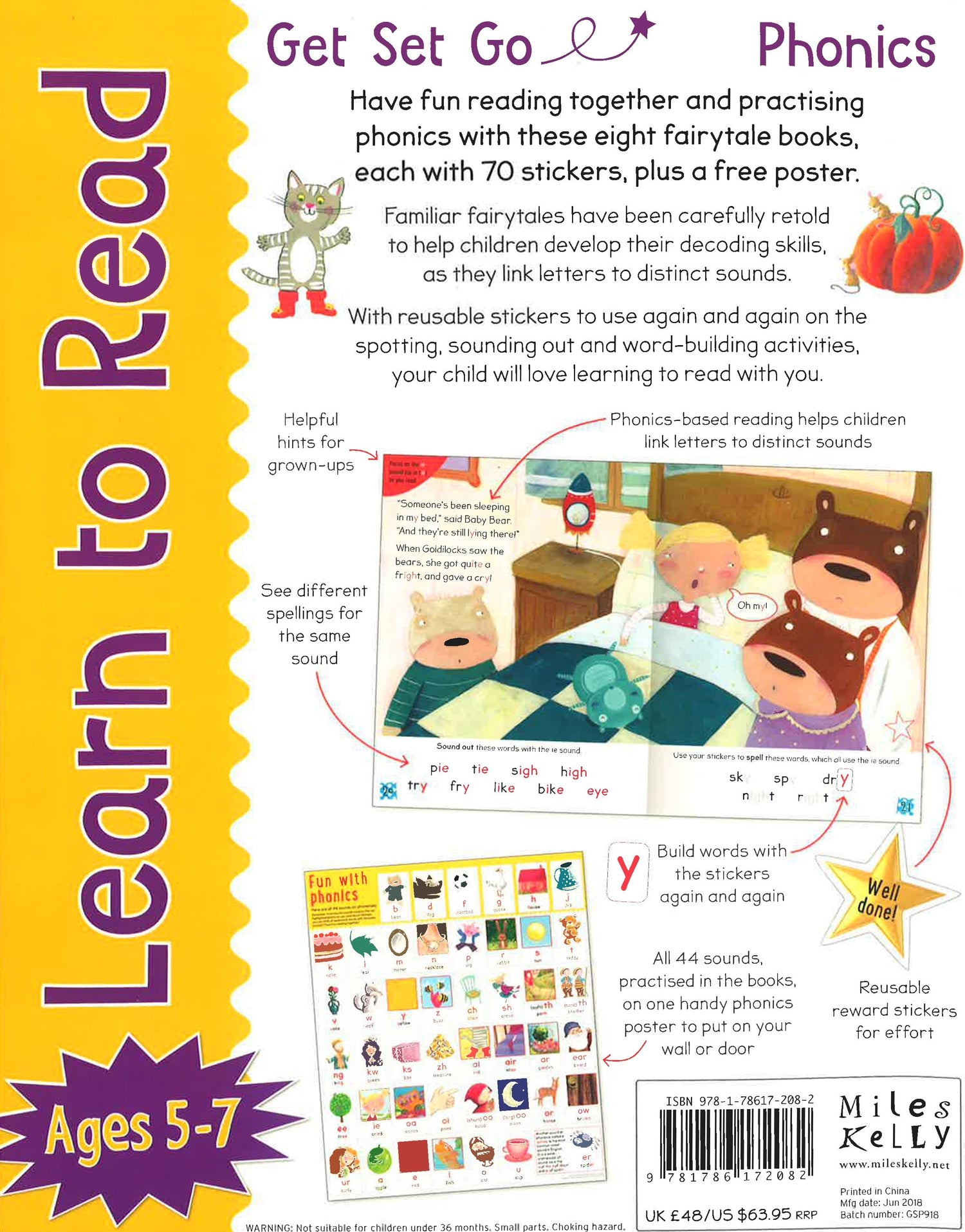 All 44 phonemes (sounds) that children are taught in school are covered in this pack of eight books, and reinforced on the beautifully illustrated poster. Each story is carefully retold to focus on a distinct sound every page or two - using sounding out, word building and spotting activities, with reusable stickers to aid learning.