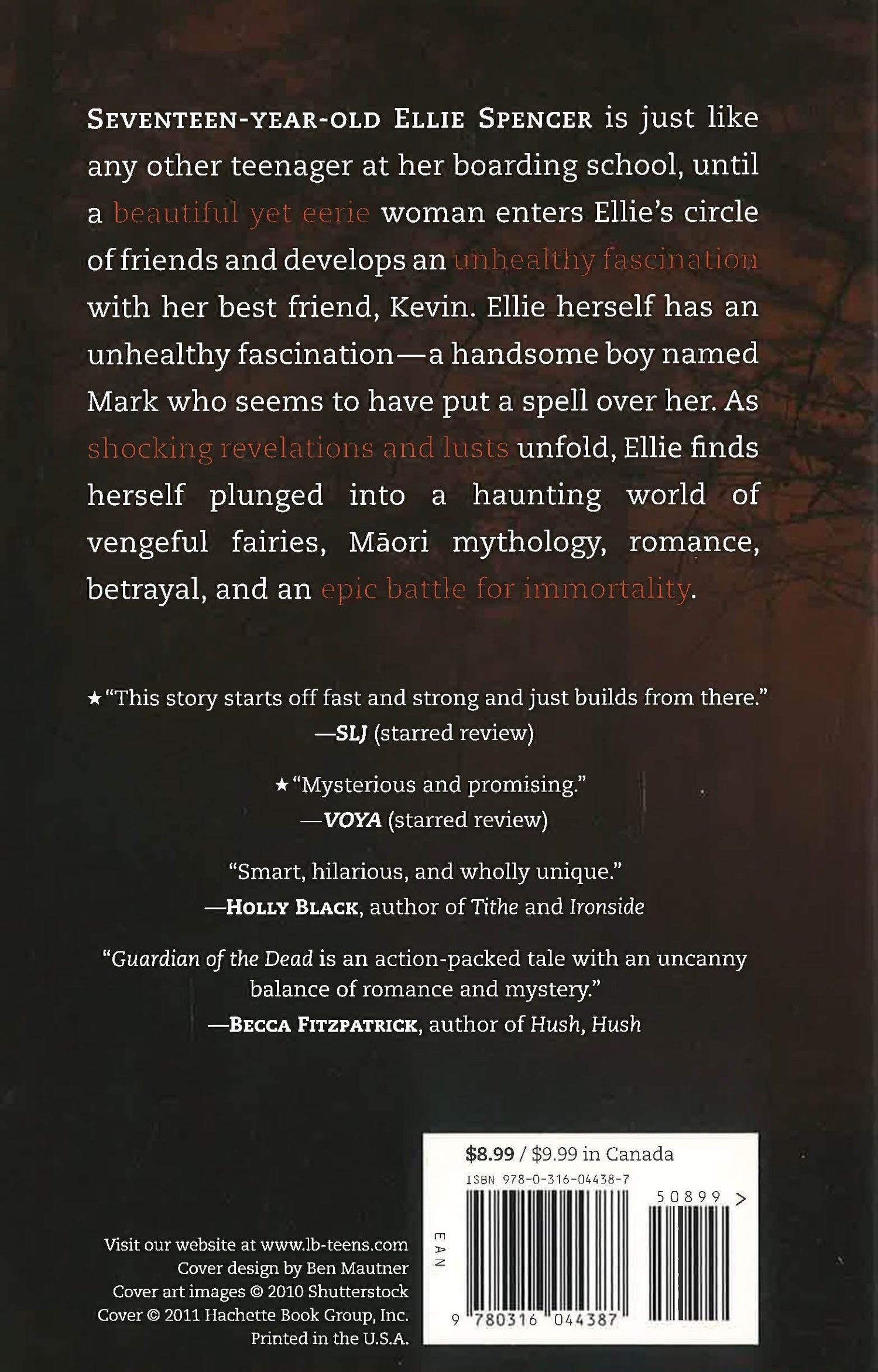 Seventeen-year-old Ellie Spencer is just like any other teenager at her boarding school. She hangs out with her best friend Kevin, she obsesses over Mark, a cute and mysterious bad boy, and her biggest worry is her paper deadline. But then everything changes. The news headlines are all abuzz about a local string of serial killings that all share the same morbid trademark: the victims were discovered with their eyes missing. Then a beautiful yet eerie woman enters Ellie's circle of friends and develops an unhealthy fascination with Kevin, and a crazed old man grabs Ellie in a public square and shoves a tattered Bible into her hands, exclaiming, "You need it. It will save your soul." Soon, Ellie finds herself plunged into a haunting world of vengeful fairies, Maori mythology, romance, betrayal, and an epic battle for immortality.