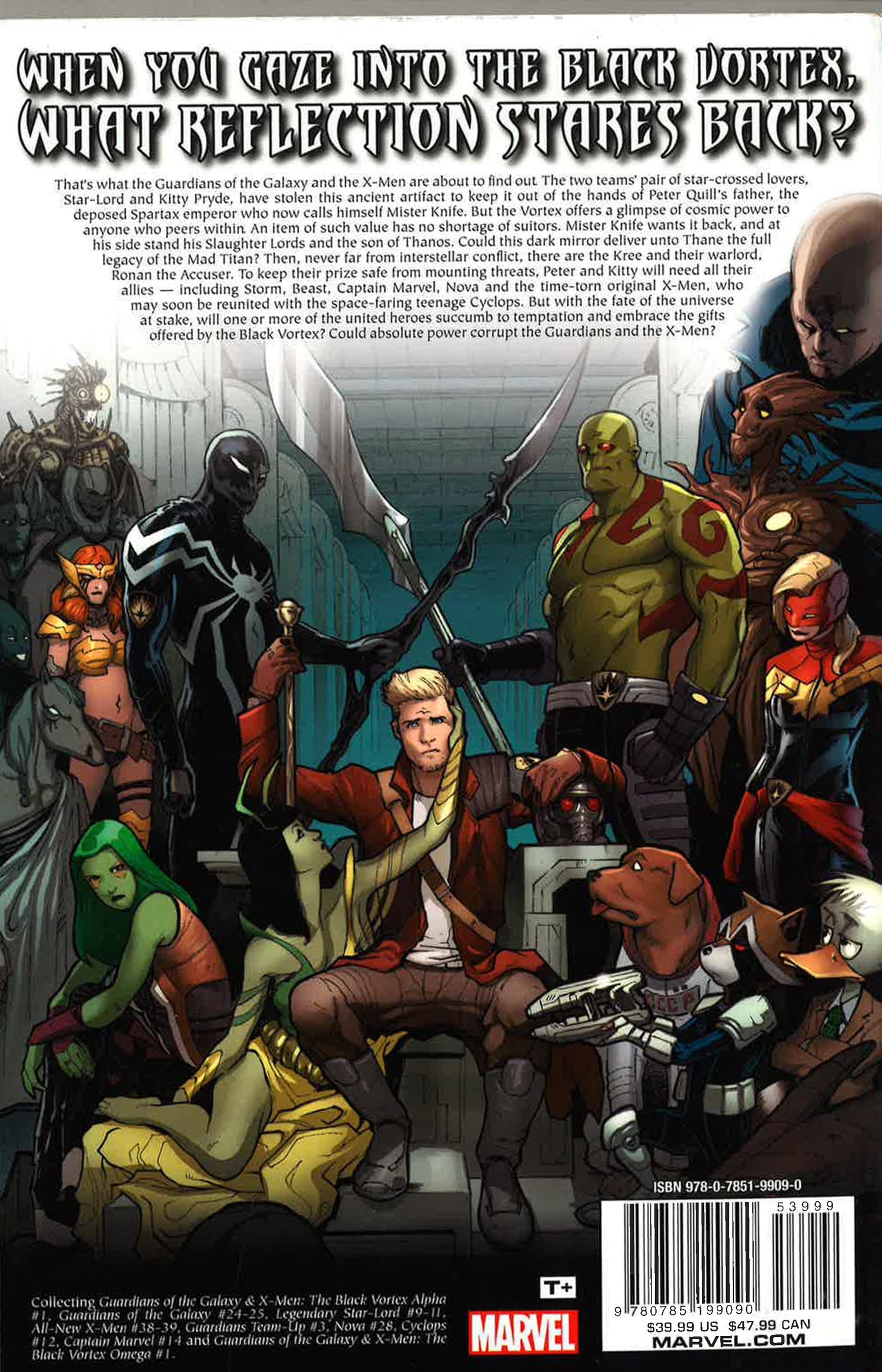 Star-Lord and Kitty Pryde have stolen the ancient Black Vortex, which offers cosmic power to anyone who peers within. Peter's father, the deposed emperor Mister Knife, wants it - and so does the son of Thanos. Could this dark mirror deliver unto Thane the Mad Titan's full legacy? To keep their prize safe from mounting threats, Peter and Kitty will need all their allies - including Captain Marvel, Nova and the time-torn original X-Men.