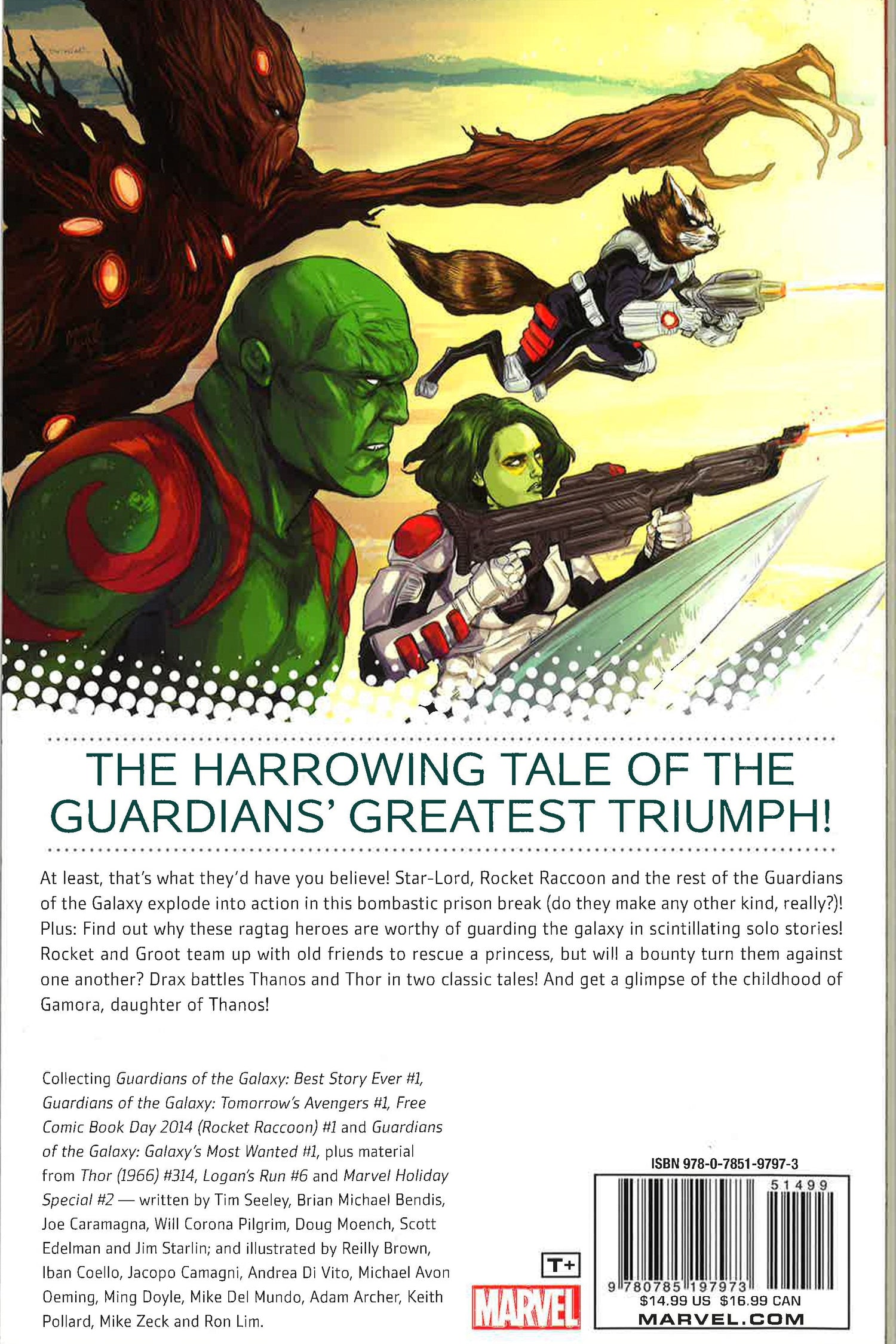 This is it: the harrowing tale of the Guardians' greatest triumph! (Or so they'd have you believe!) Star-Lord, Rocket Raccoon and the rest of the Guardians of the Galaxy explode into action in this bombastic prison break! Plus: find out why these ragtag heroes are worthy of guarding the galaxy in scintillating solo stories! Rocket and Groot team up with old friends to rescue a princess, but will a bounty turn them against one another? Drax battles Thanos and Thor in two classic tales! And get a glimpse of the childhood of Gamora, daughter of Thanos! COLLECTING: Guardians of the Galaxy Infinite Comic 1, Guardians of the Galaxy: Tomorrow 's Avengers 1, Free Comic Book Day (2014) Rocket Raccoon 1, Guardians of the Galaxy: Galaxy 's Most Wanted 1; material from Thor (1966) 314, Logan's Run 6, Marvel Holiday Special 2