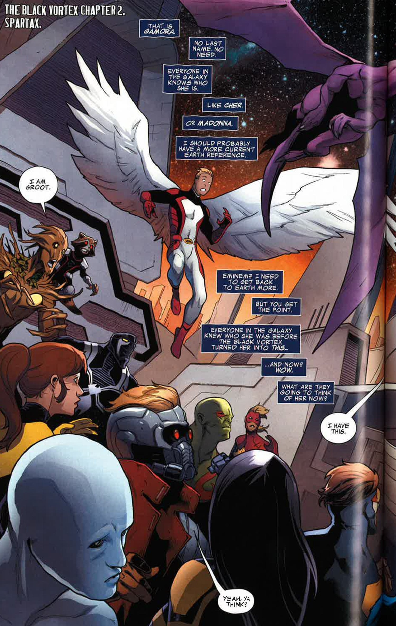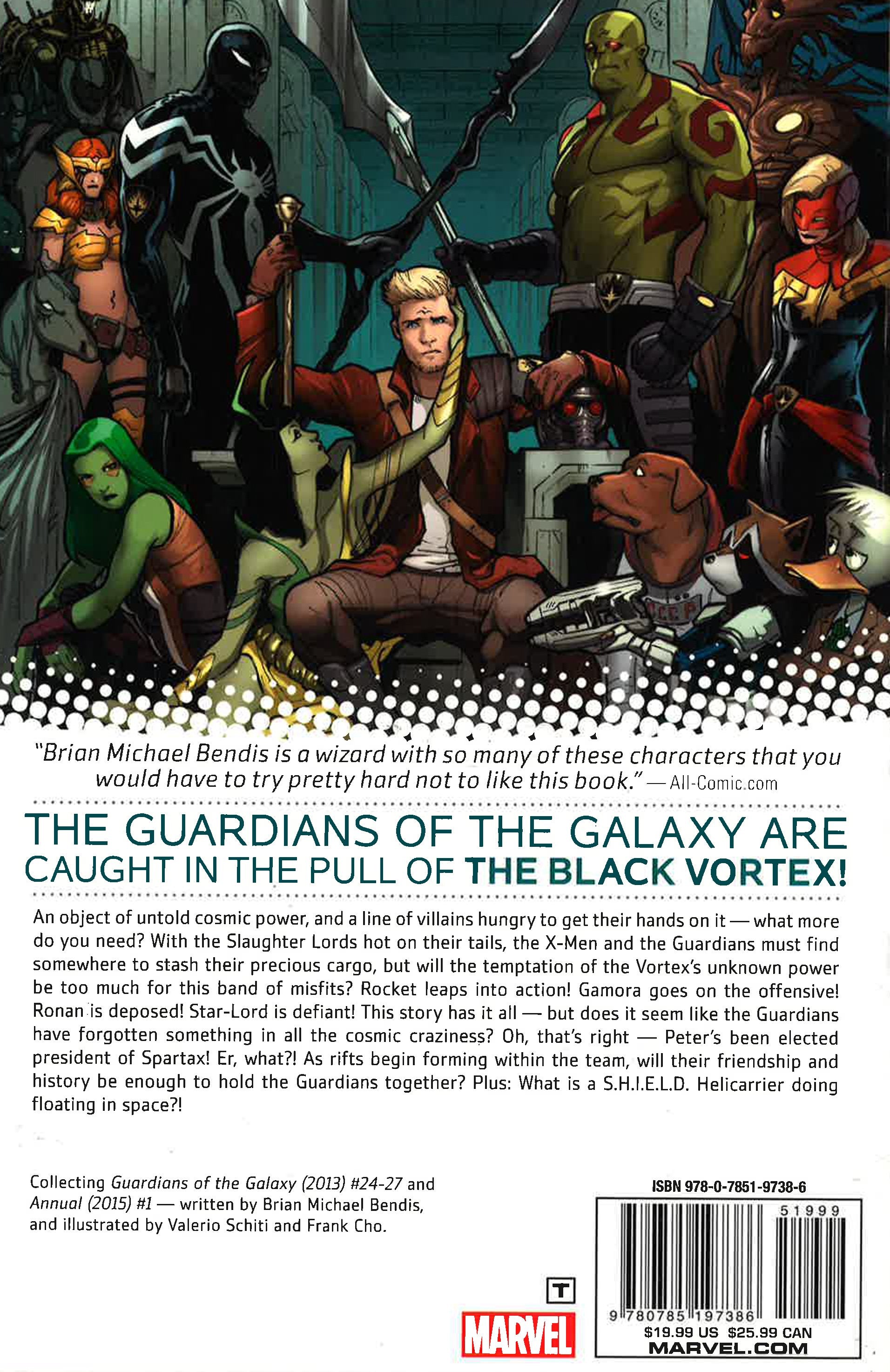 The Guardians of the Galaxy are caught in the pull of the Black Vortex! With the Slaughter Squad hot on their tails, the X-Men and the Guardians have to find somewhere to stash their precious cargo...but will the temptation of the Vortex's unknown power be too much for this band of misfits? Rocket leaps into action! Gamora goes on the offensive! Ronan is deposed! Star-Lord is defiant! This story has it all...but does it seem like the Guardians have forgotten something in all the cosmic craziness? Oh, that's right, Peter got elected President of Spartax! Wait, what?! * This book may have remainder mark*