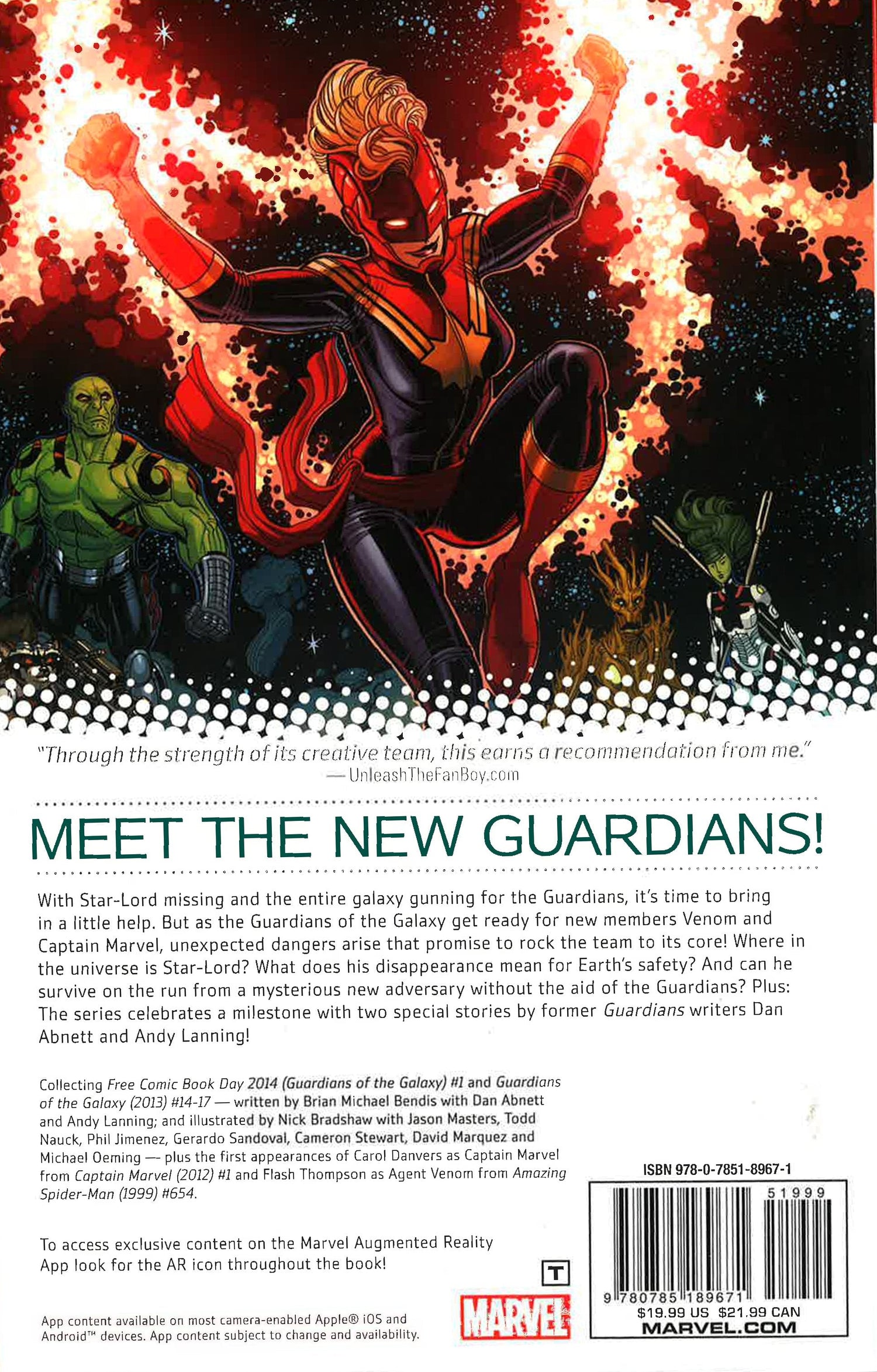 Meet the new Guardians! With Star-Lord missing and the entire galaxy gunning for the Guardians of the Galaxy, it's time to bring in a little help. But as the Guardians get ready for new members Venom and Captain Marvel, unexpected dangers arise that promise to tear the team to its core! Where in the universe is Star-Lord? What does his disappearance mean for Earth's safety? And can he survive on the run from a mysterious new adversary without the aid of the Guardians? Plus: relive Flash Thompson's transformation into Venom and Carol Danvers' debut as Captain Marvel! And the series celebrates a milestone with two special stories by former Guardians writers Dan Abnett and Andy Lanning! COLLECTING Free Comic Book Day 2014 (Guardians Of The Galaxy ) 1, Guardians of the Galaxy 14-17, Amazing Spider-Man 654, Captain Marvel (2012) 1
