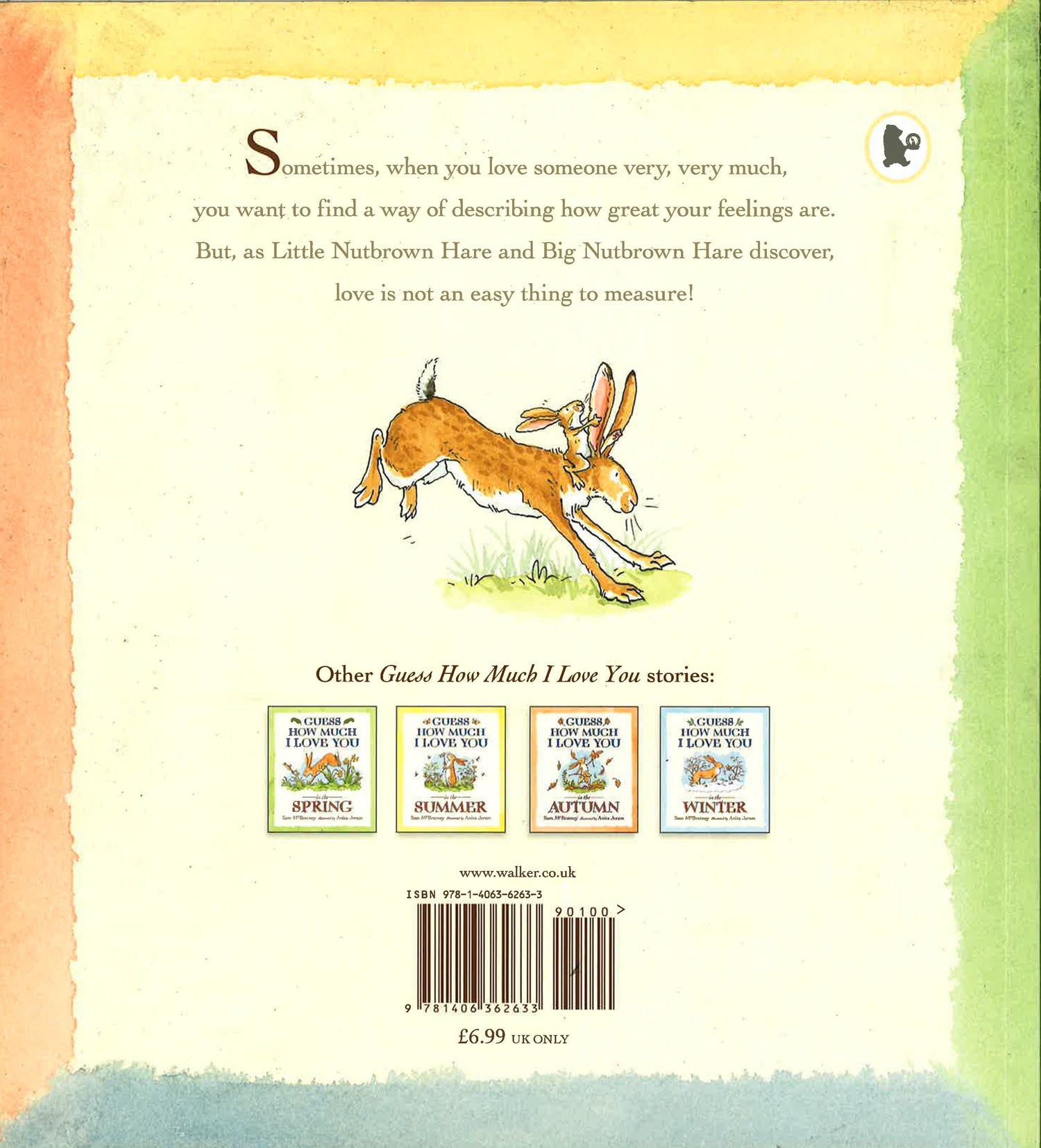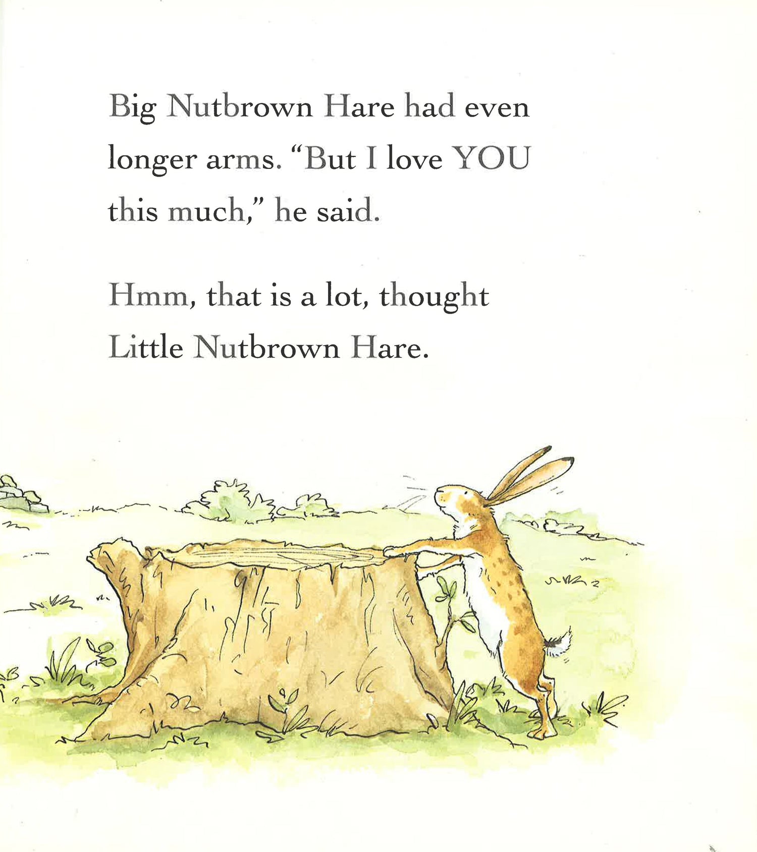 "Guess how much I love you," says Little Nutbrown Hare. Little Nutbrown Hare shows his daddy how much he loves him: as wide as he can reach and as far as he can hop. But Big Nutbrown Hare, who can reach farther and hop higher, loves him back just as much. Well then Little Nutbrown Hare loves him right up to the moon, but that's just halfway to Big Nutbrown Hare's love for him.