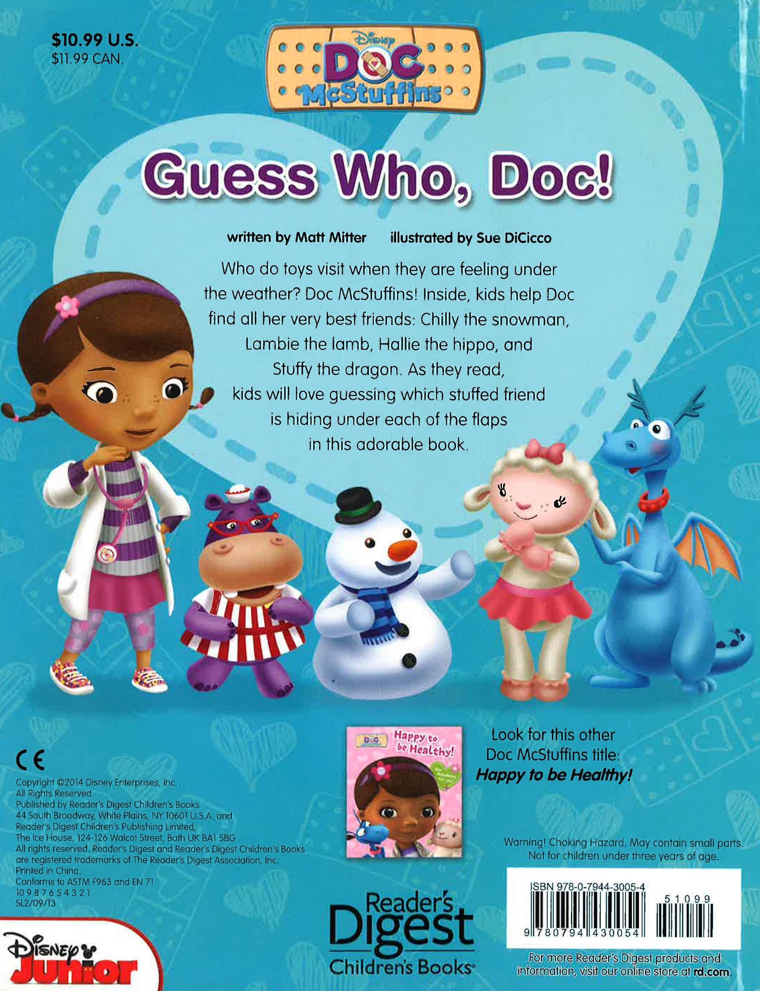 This book features Doc McStuffins and her stuffed animal friends with five peek-a-boo flaps! Doc McStuffins is always on call to help out any toy that is feeling under the weather. In this book, kids meet all of Doc's closest friends: Chilly the snowman, Lambie the lamb, Hallie the hippo, and Stuffy the dragon. As they read, kids will love guessing which stuffed friend is hiding under each of the five flaps in this adorable book.