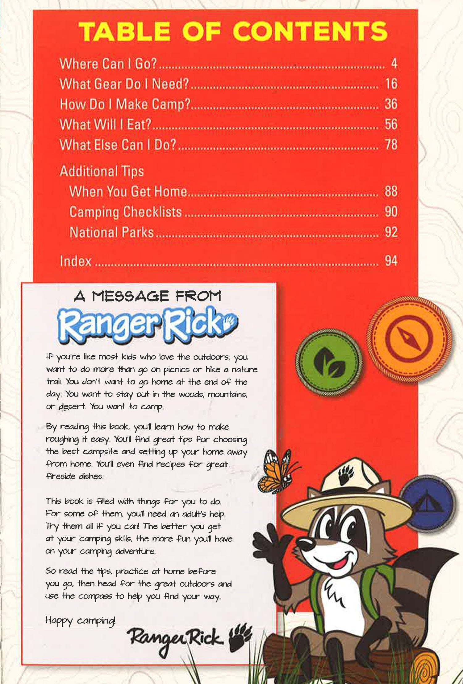 Where can I go camping? What gear should I take with me? What fun stuff is there to do? Ranger Rick Kids' Guide to Camping has the answers for you! Plus, this book has a real working compass inside to help you navigate through the wilderness. If you’re like most kids who love the outdoors, you want to do more than go on picnics or hike a nature trail. You don’t want to go home at the end of the day. You want to stay out in the woods, mountains, or desert. What you want to do is camp! With Ranger Rick Kids' Guide to Camping, you'll learn how to make roughing it easy. Inside are great tips for choosing the best campsite and setting up your home away from home. Once you’re done reading this book, you’ll know why you may want to get a self-supporting 4-season tent or a “mummy” sleeping bag with a specific comfort rating. You’ll know how to pitch your tent, build a fire, make a meal, and entertain yourself after it gets dark. And maybe most importantly, you’ll know exactly what to do when “nature calls” and there are no bathrooms around! The more you learn about camping, the more fun you’ll have on your next camping adventure. So read the book, and then head for the great outdoors and use the compass to help you find your way. Happy camping!